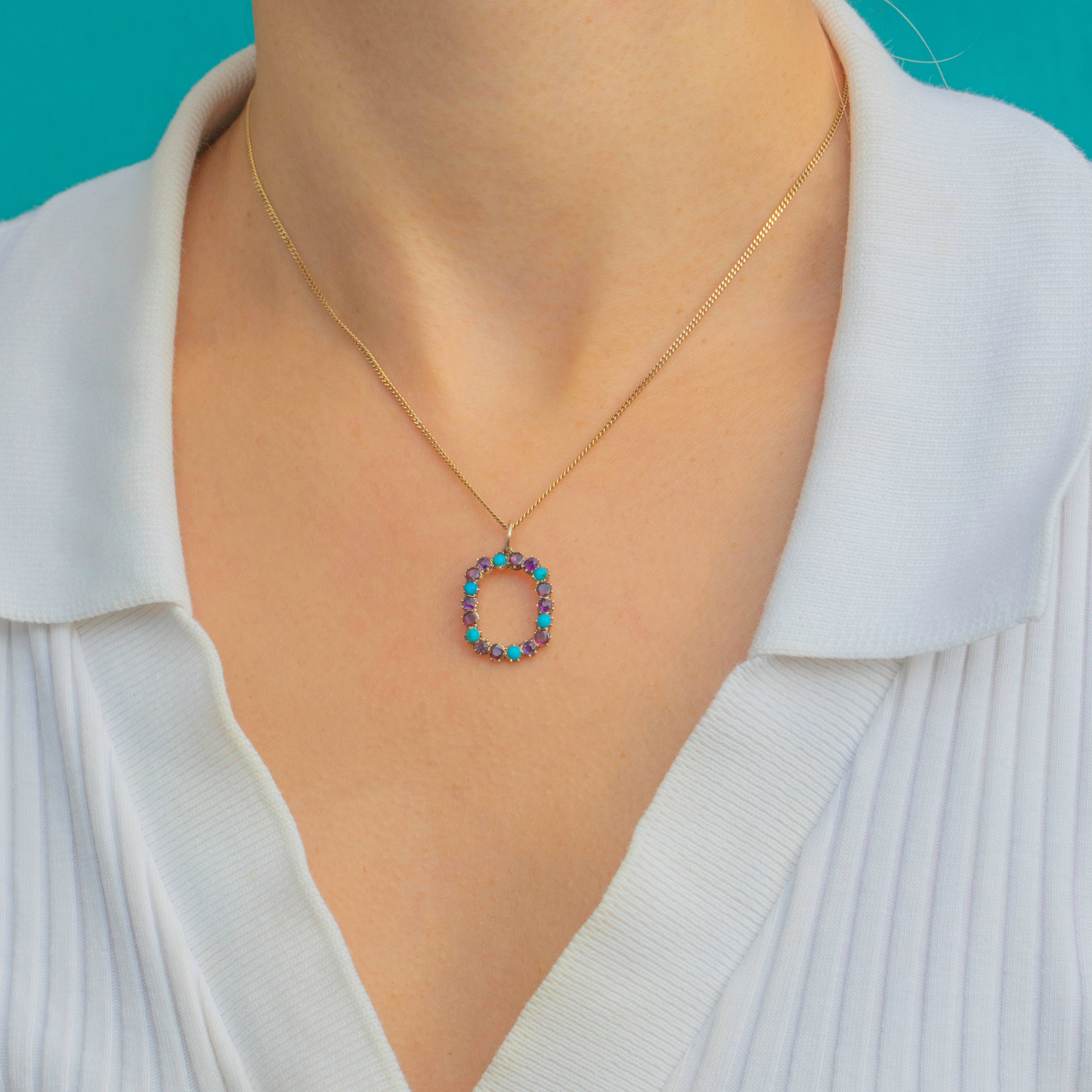 This delicate Georgian pendant dates to the early 19th century and beautifully combines deep red Garnets with bright Turquoise cabochons- a classic colour pairing much loved in Georgian jewellery.