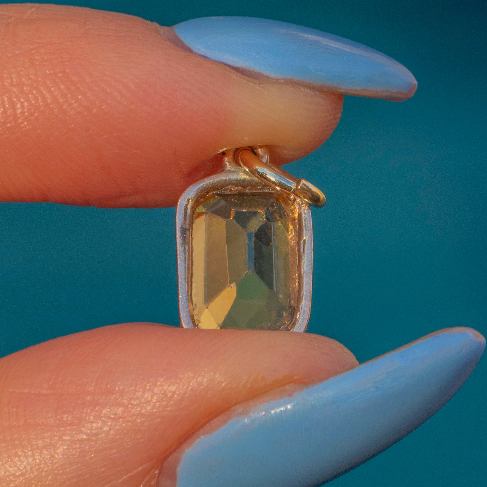 VERY GOOD. This Georgian 9ct Gold Golden Topaz charm is in very good condition. The natural Topaz is securely set in an open back setting, allowing light to enhance its rich, yellow hue. Any imperfections are subtle and won’t be noticeable when worn. This Georgian charm is the perfect piece to add a unique flare to your antique jewellery collection!