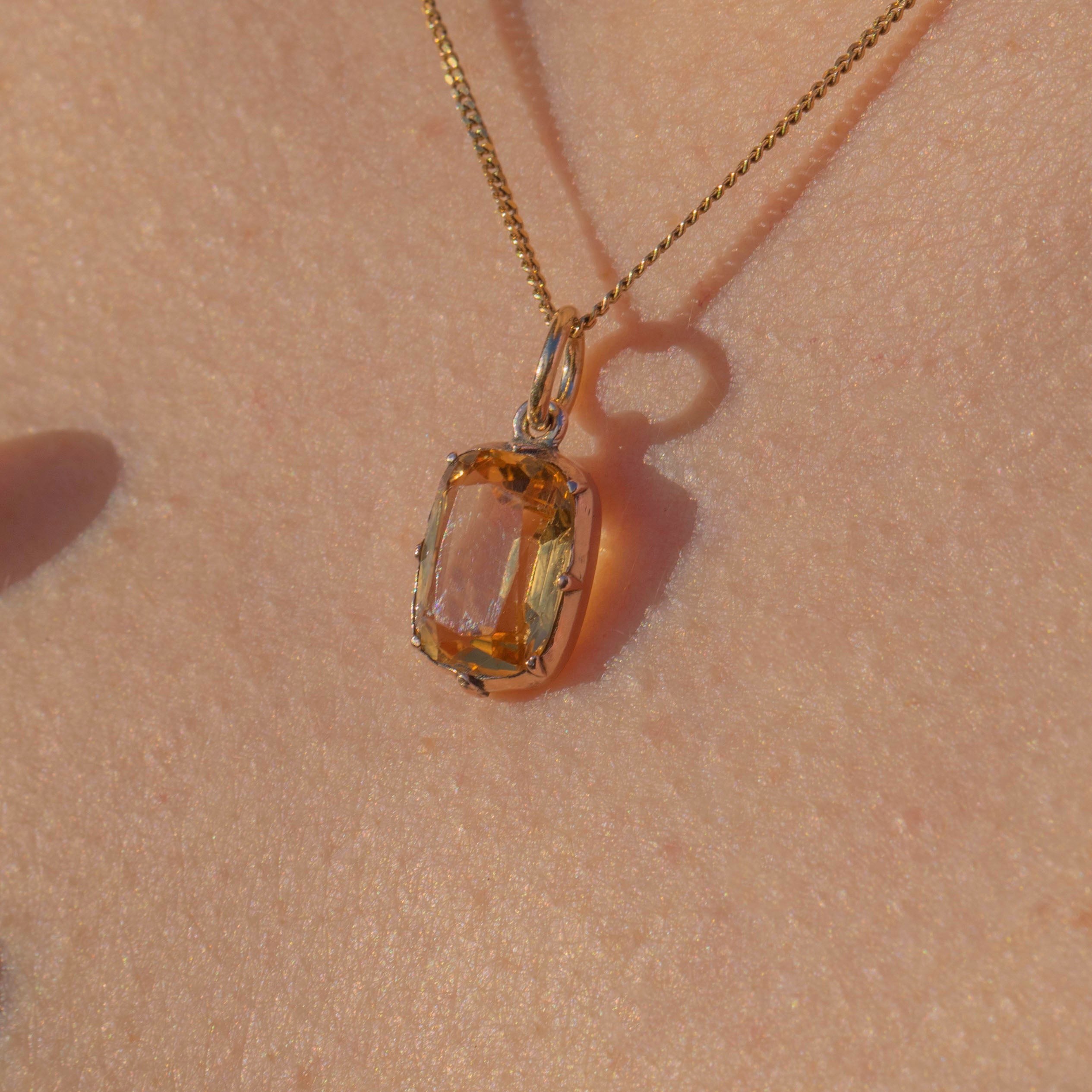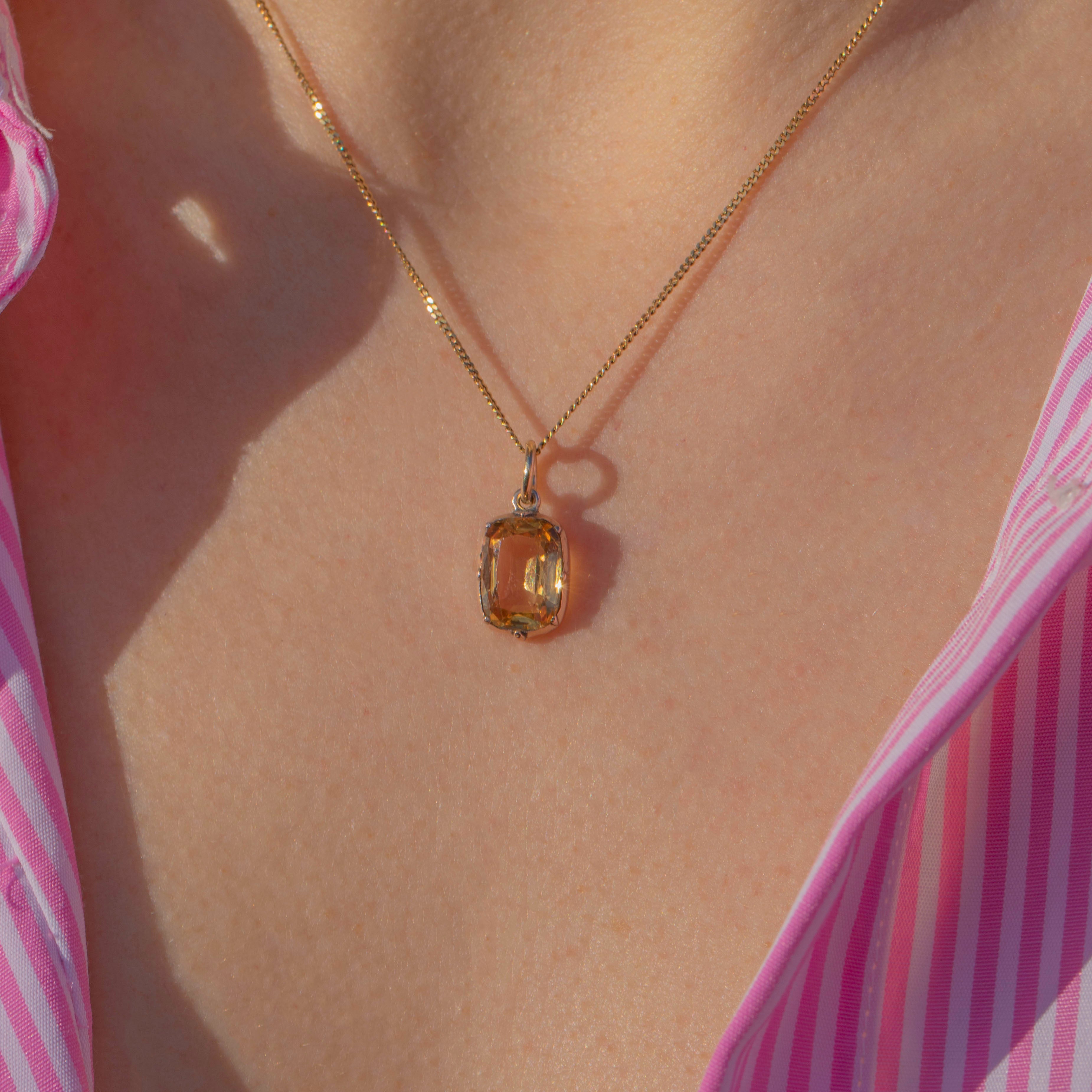 This Georgian 9ct Gold Golden Topaz charm is a radiant treasure! Featuring a 6.25ct hand-faceted Topaz with a luscious golden hue, reminiscent of warm honey, it dazzles with light and charm. Boasting an approximate weight of 6.25ct, this captivating gemstone is a standout piece that draws the eye effortlessly.