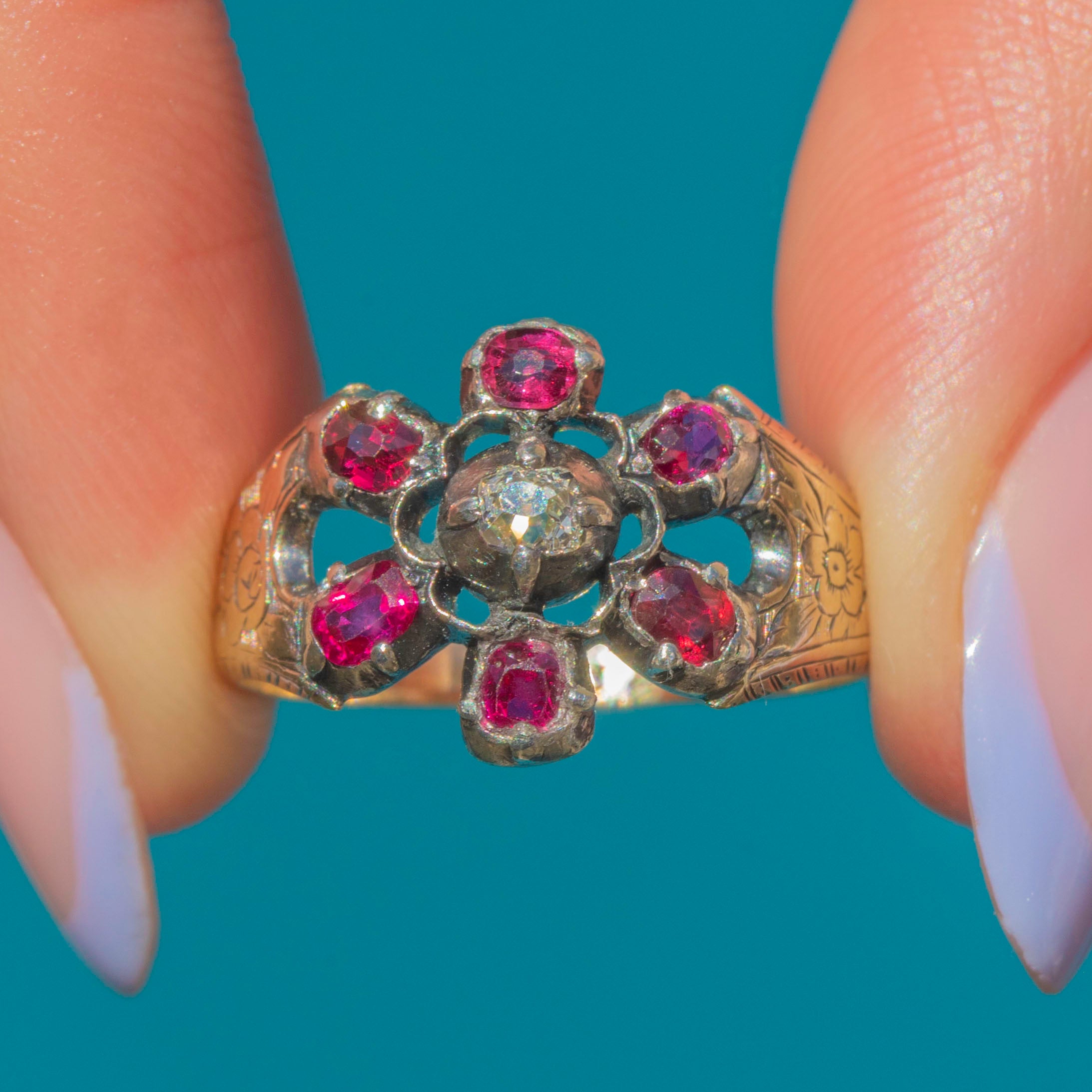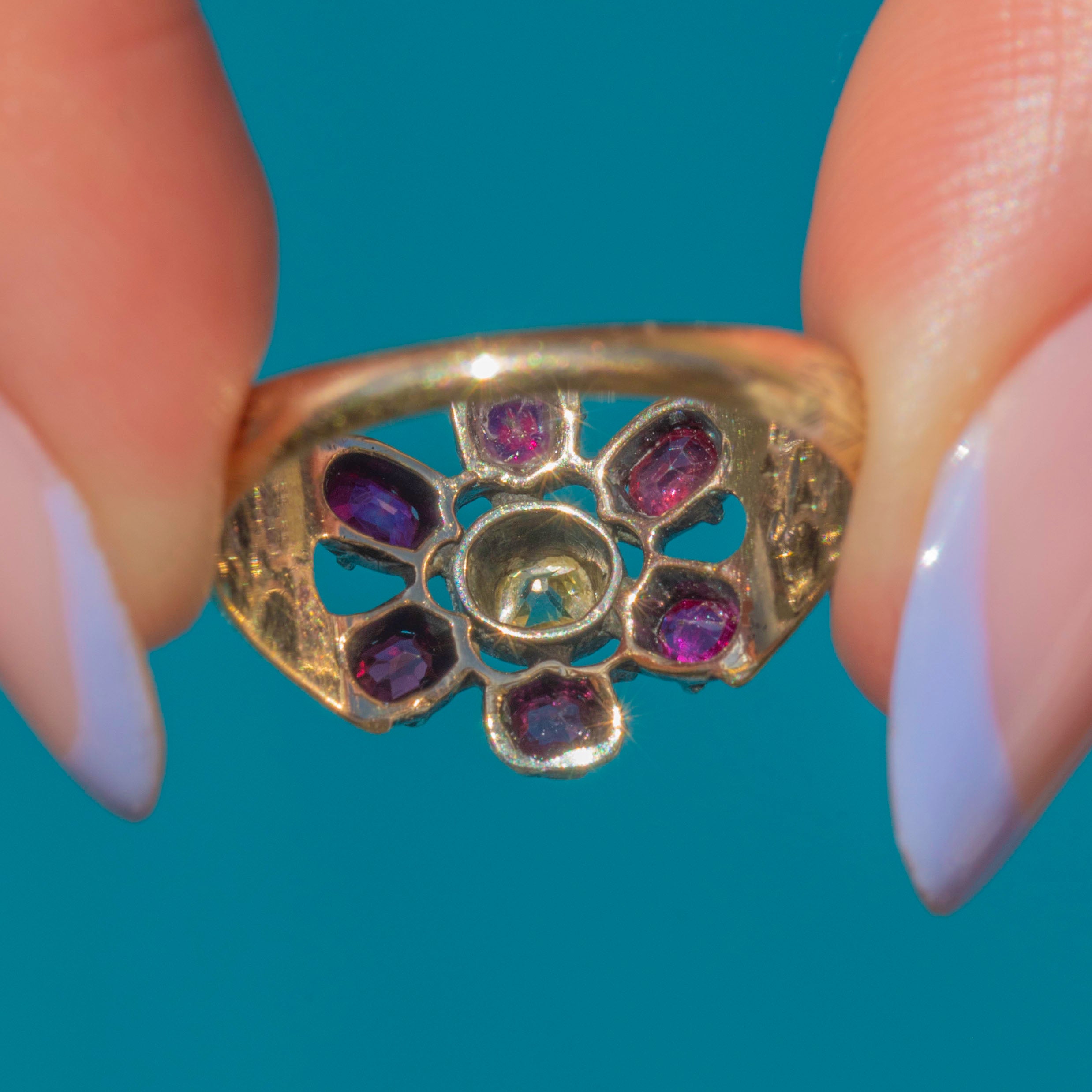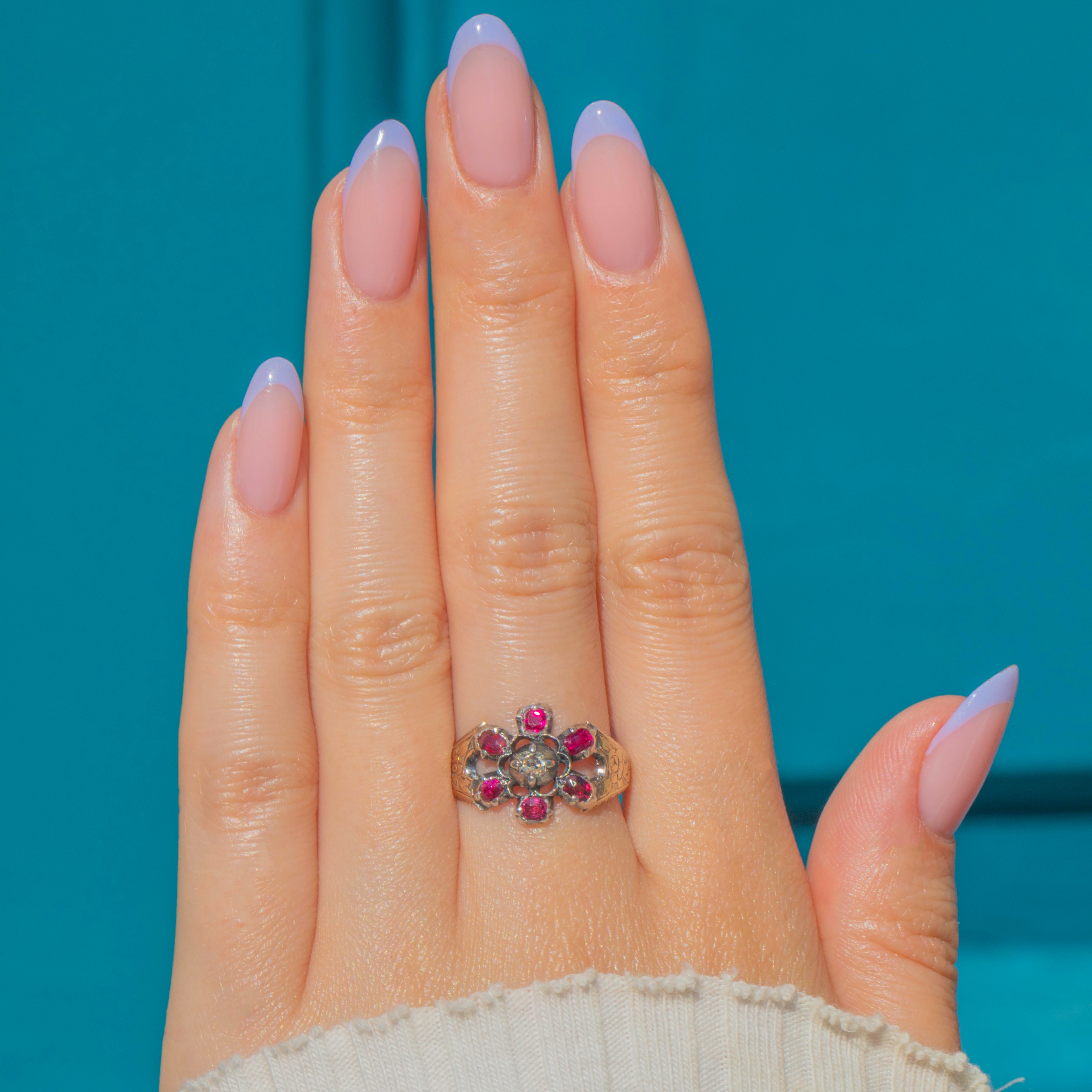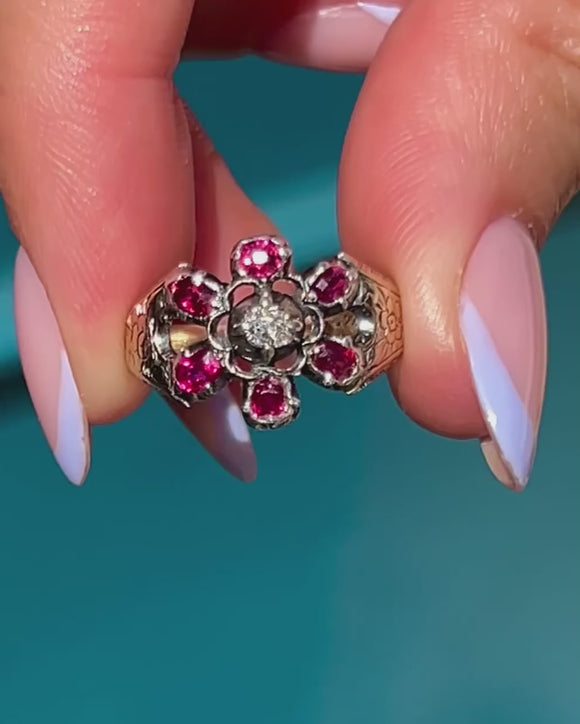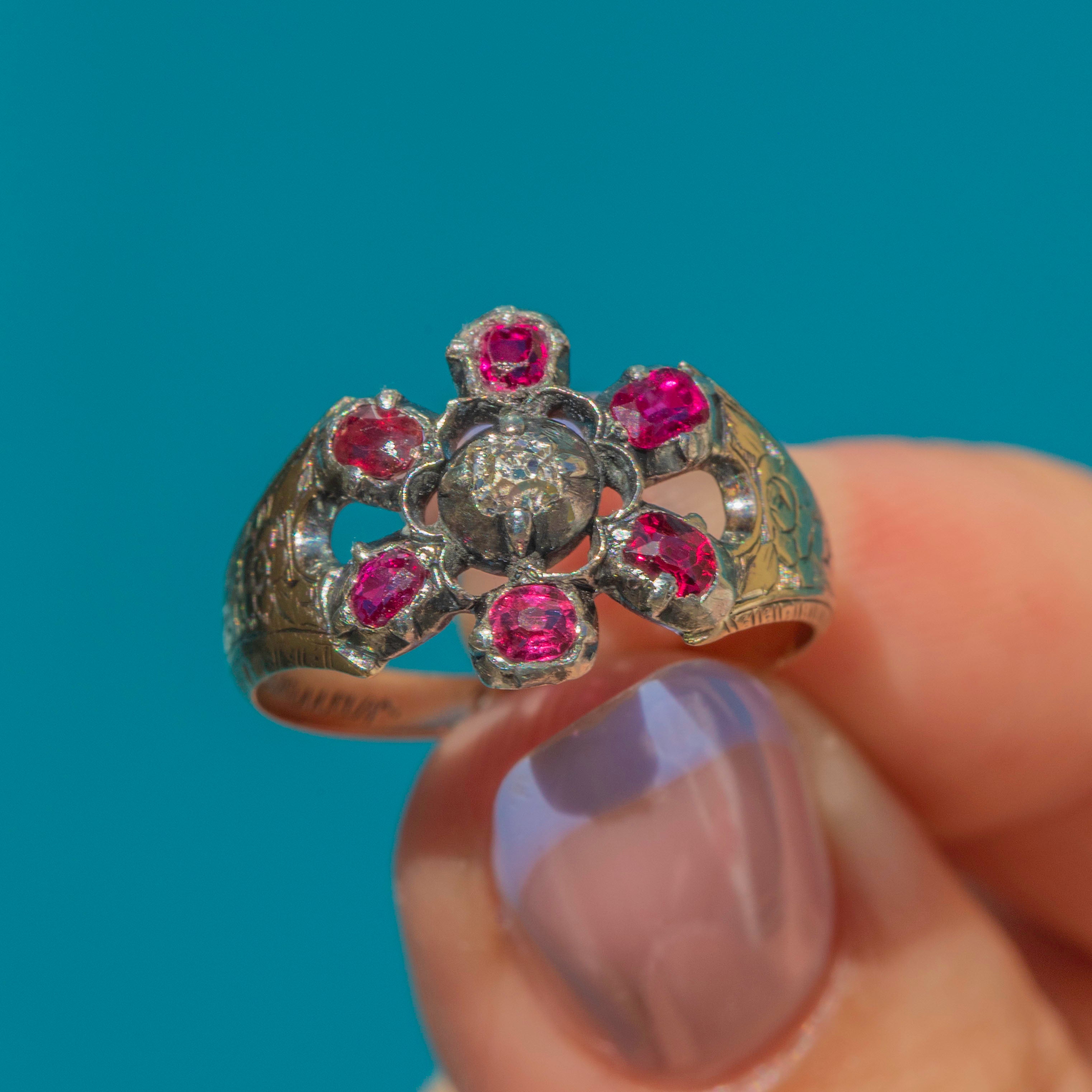 VERY GOOD: This Georgian 9ct Gold natural Ruby Diamond cluster ring is in very good condition. The gemstones are all present and original to the piece, with only minor abrasions to some of the Rubies' facets. The structural integrity of the ring has stood the test of time, there is some general wear consistent with age, which can easily be forgiven when considering the piece is almost two centuries old. With this in mind, this Georgian Ruby Diamond ring is a magnificent find and is a must-have piece!