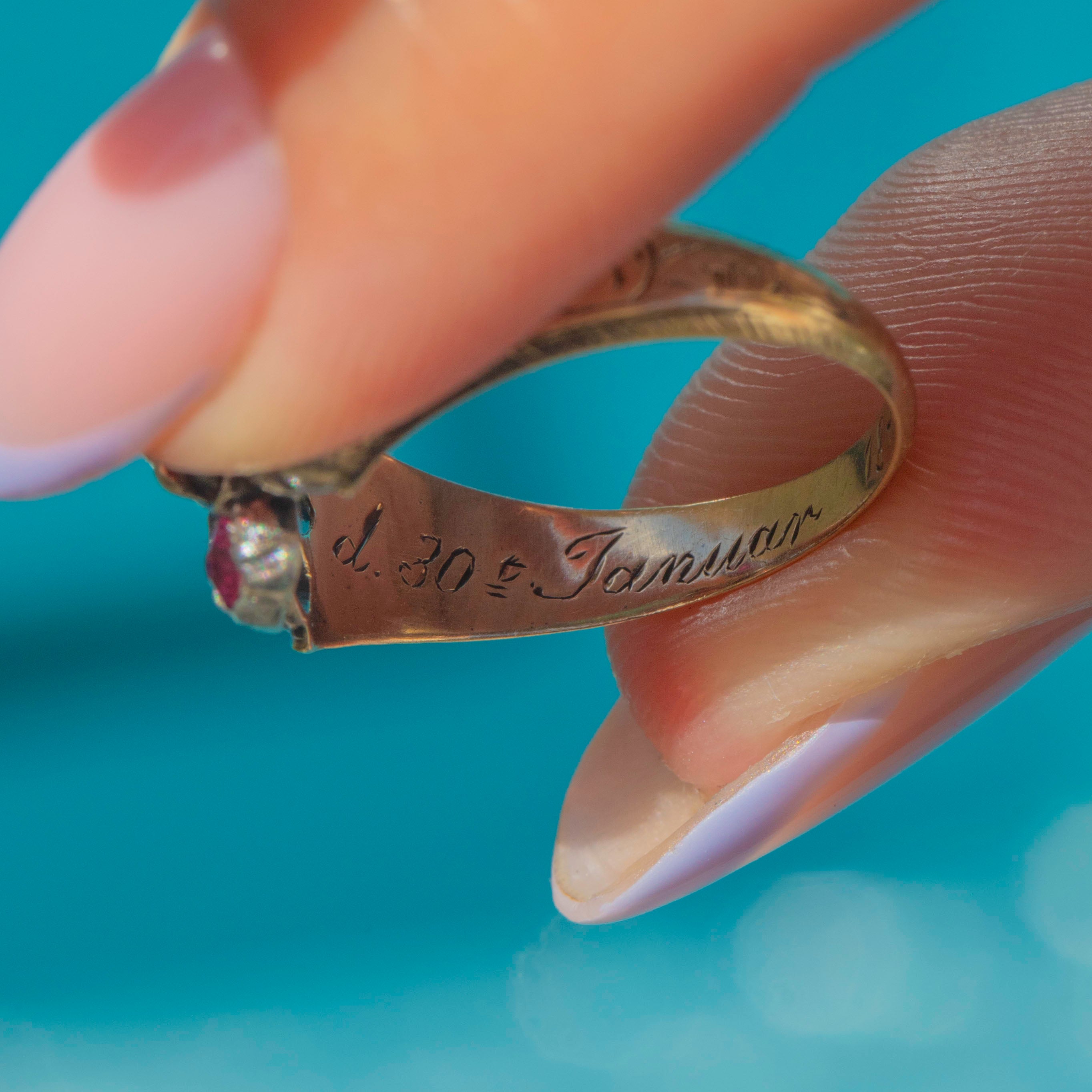 STAMPS: Inscribed inside; " d.30t January 1844". Possibly a mourning ring but because of the lack of the "ob" precursor (for obituary, which was common in mourning jewellery of this era), the ring is much more likely commemorating an important date, such as a birthday or special occasion.