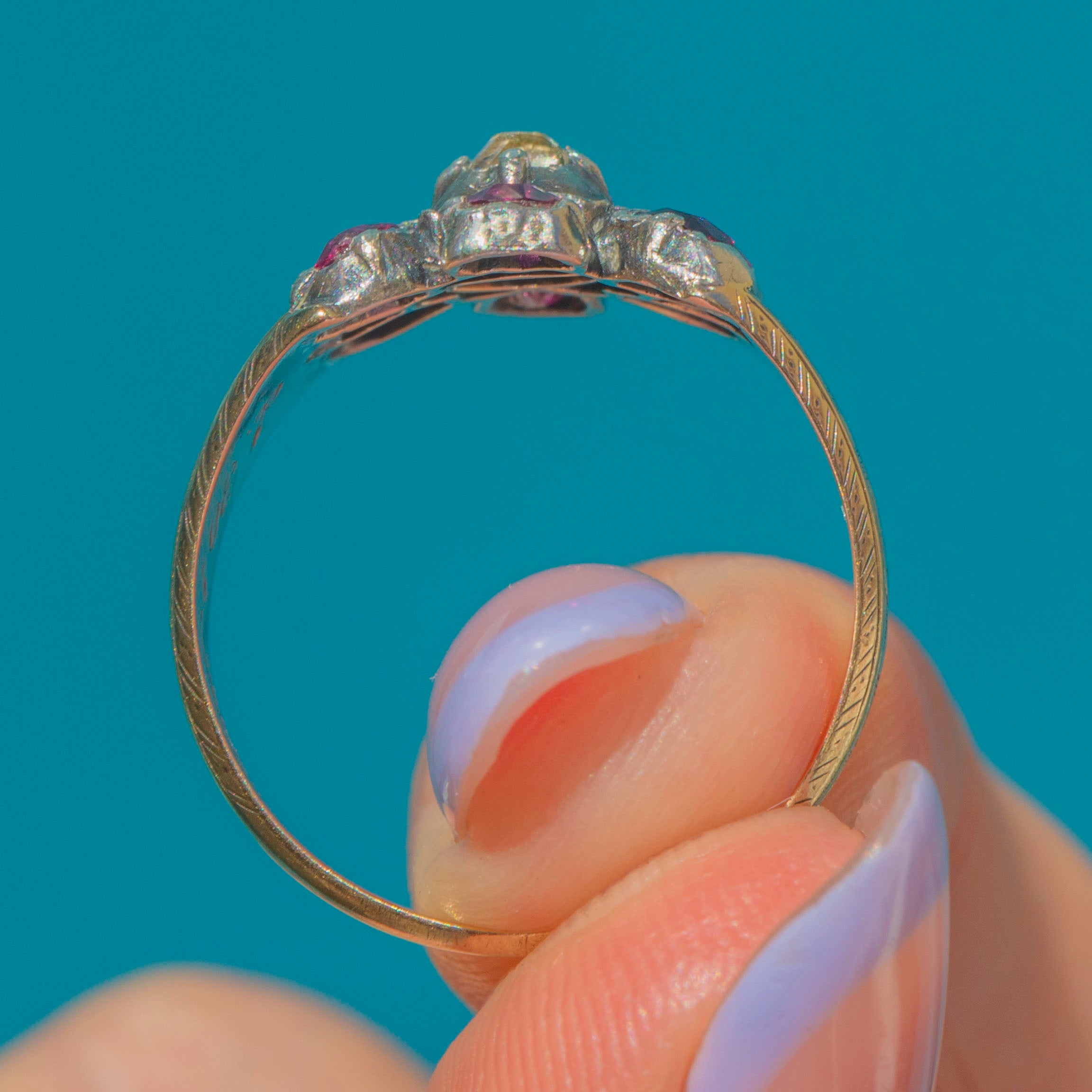 The wide, buttery 9ct Gold band carries with it ornately engraved forget-me-nots, perfectly complementing the openwork floral design of the gemstone cluster. The inside of the band has been inscribed "d.30t January 1844", and due to the design of the ring and lack of "ob" precursor to the date, we believe this ring was created to commemorate a celebration rather than mourn a death.