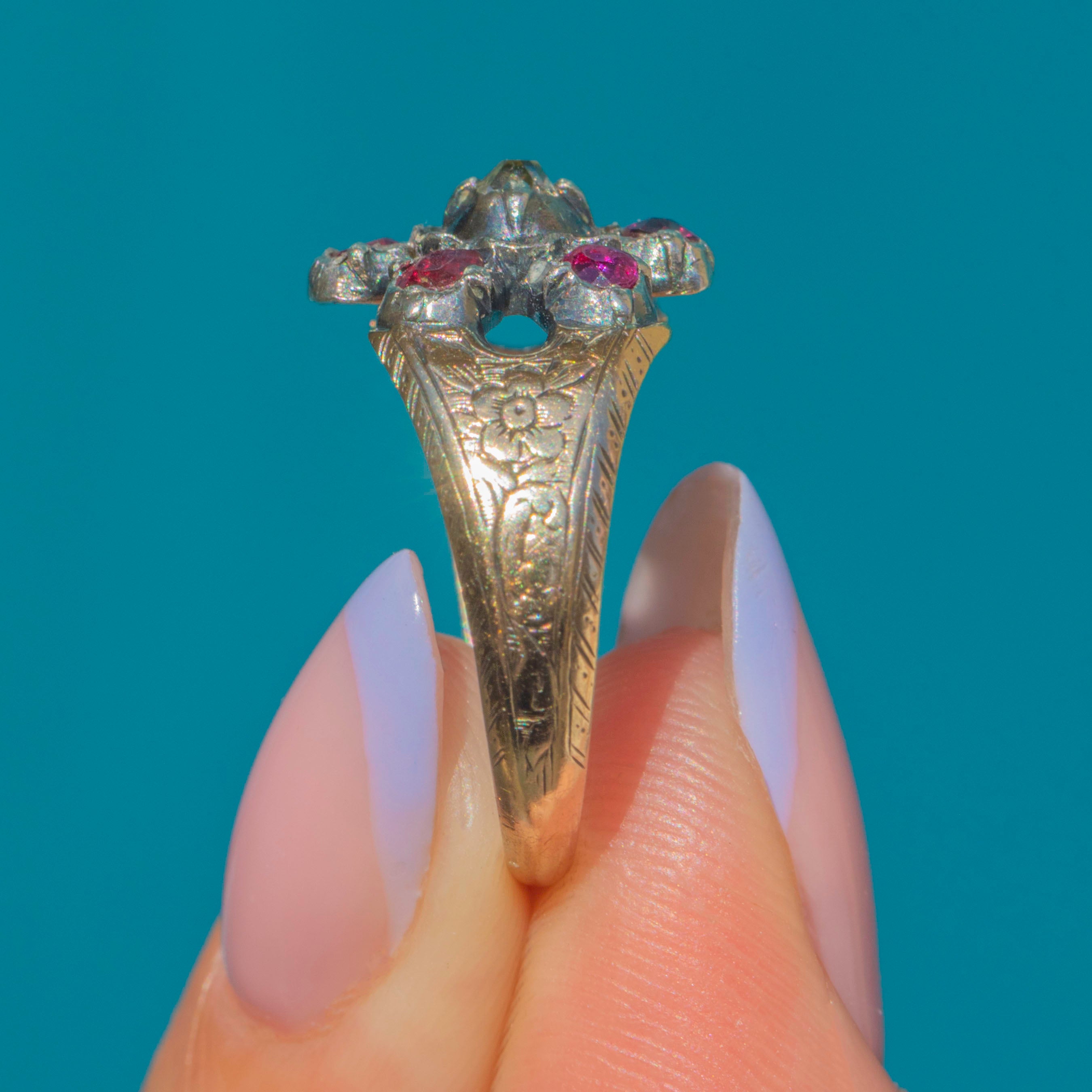 Georgian 9ct Gold Natural Ruby Diamond Cluster Ring, Inscribed 1844