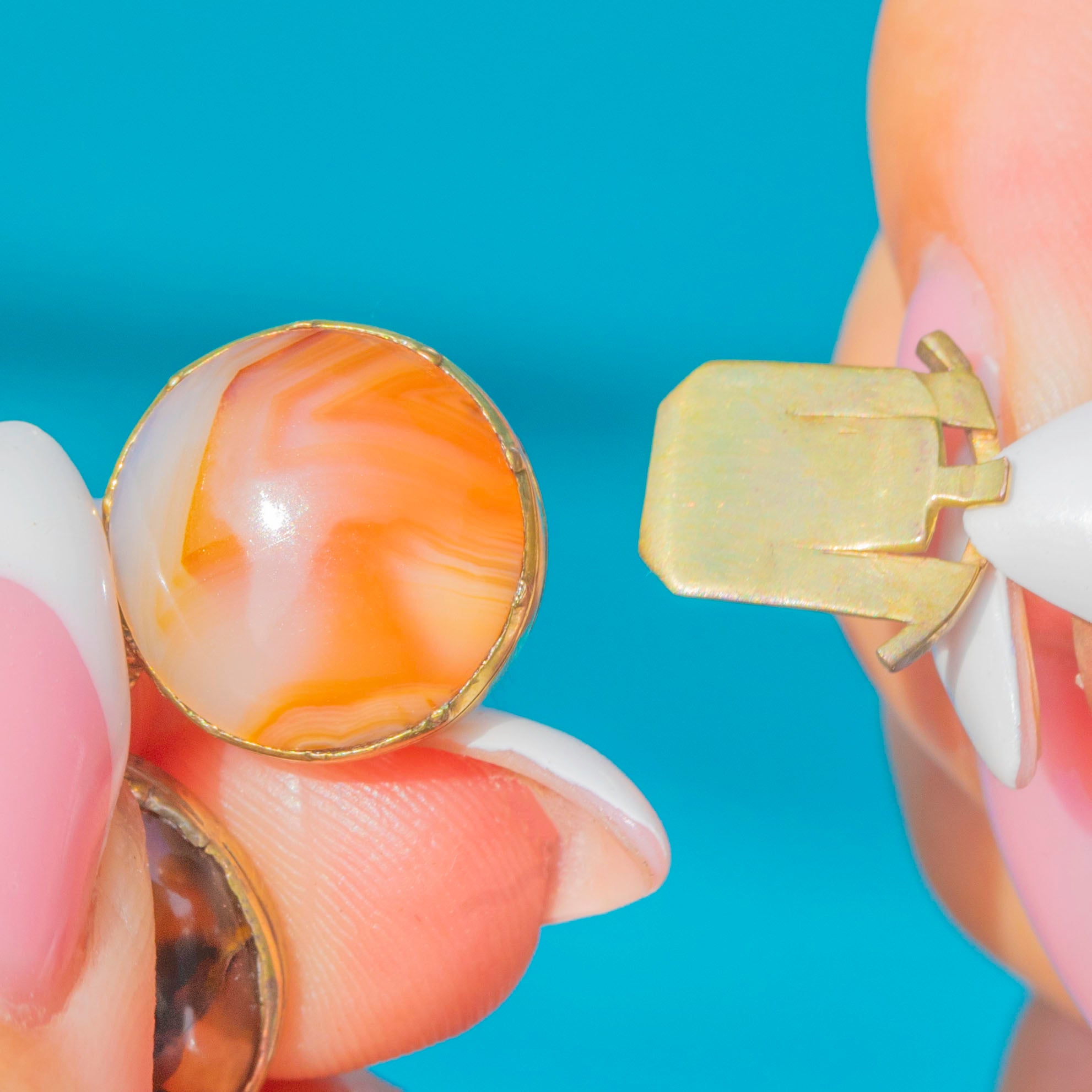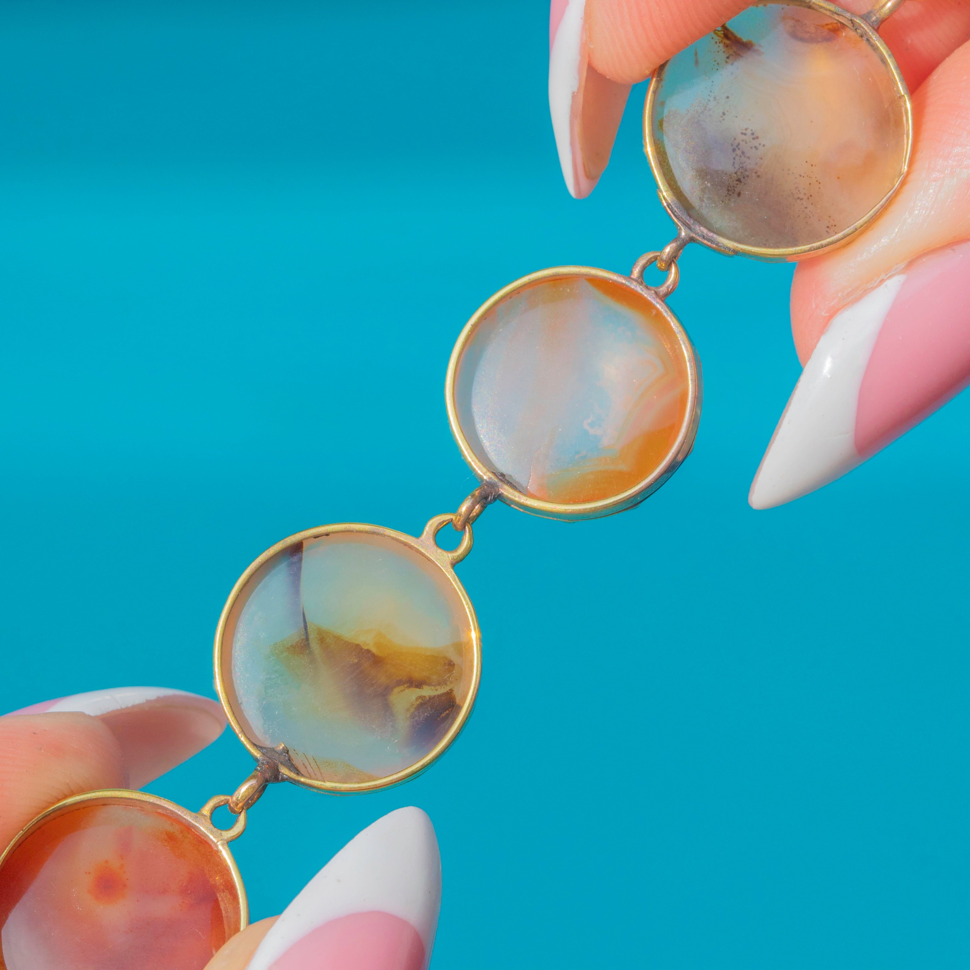 This Georgian bracelet showcases a series of elegant Agate cabochons set in warm 9ct Gold.