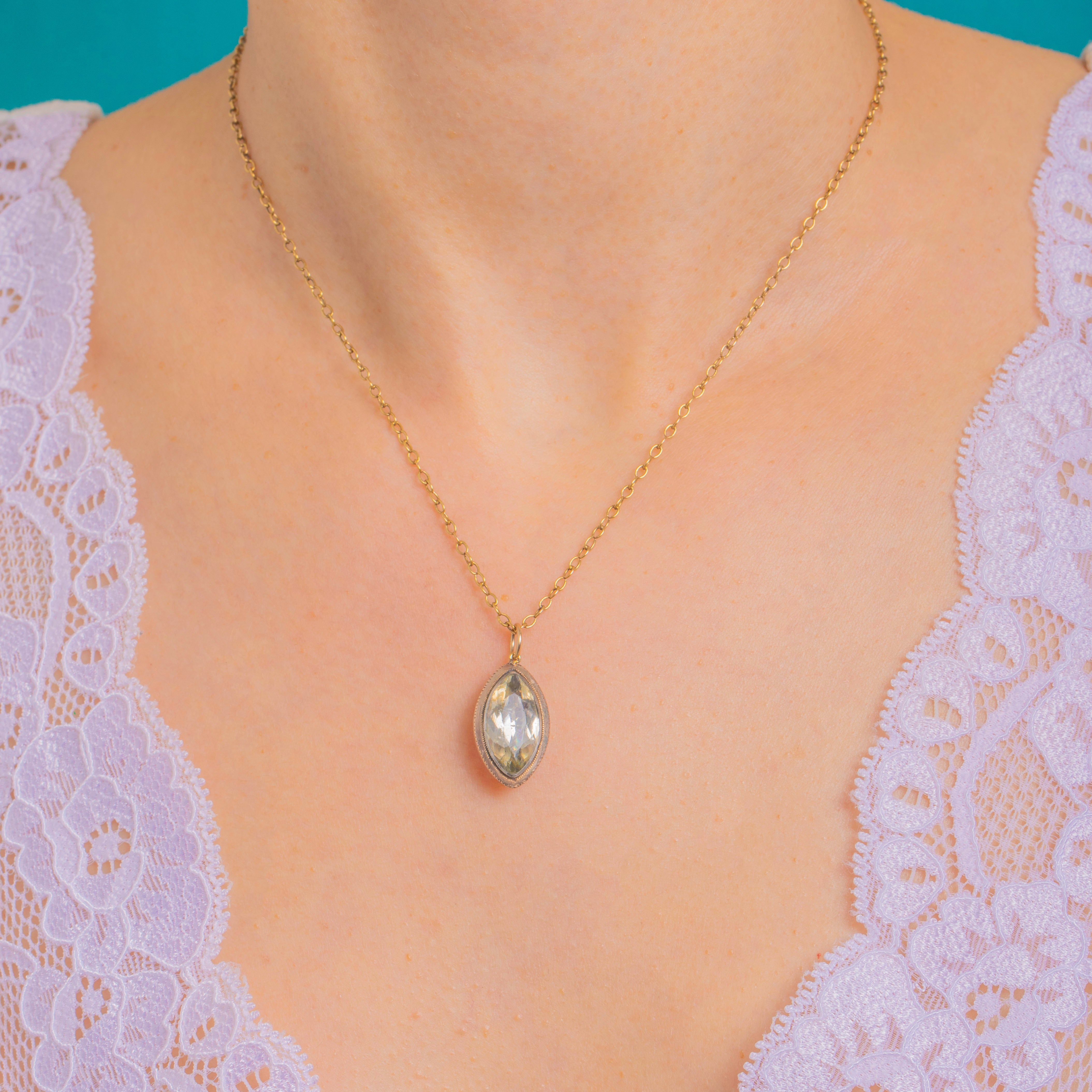 A luminous Georgian navette charm showcasing a foiled Rock Crystal in a refined closed-back setting. The elongated marquise is framed by a delicate milgrain bezel, its antique foiling lending a soft, silvery glow that feels romantic and timeless. Crafted in 9ct Gold with Silver settings, this slender charm brings an elegant whisper of the Georgian era to any curation.