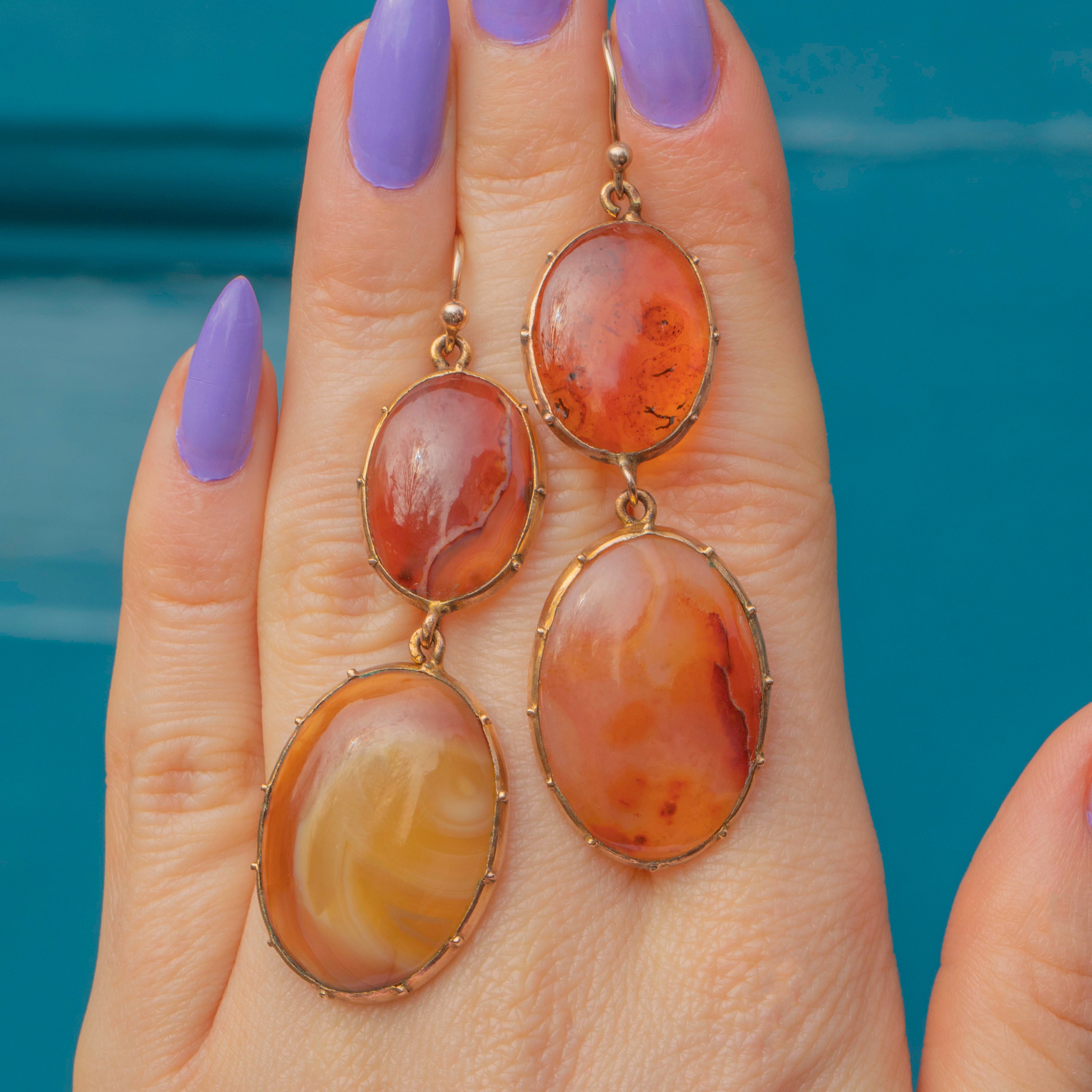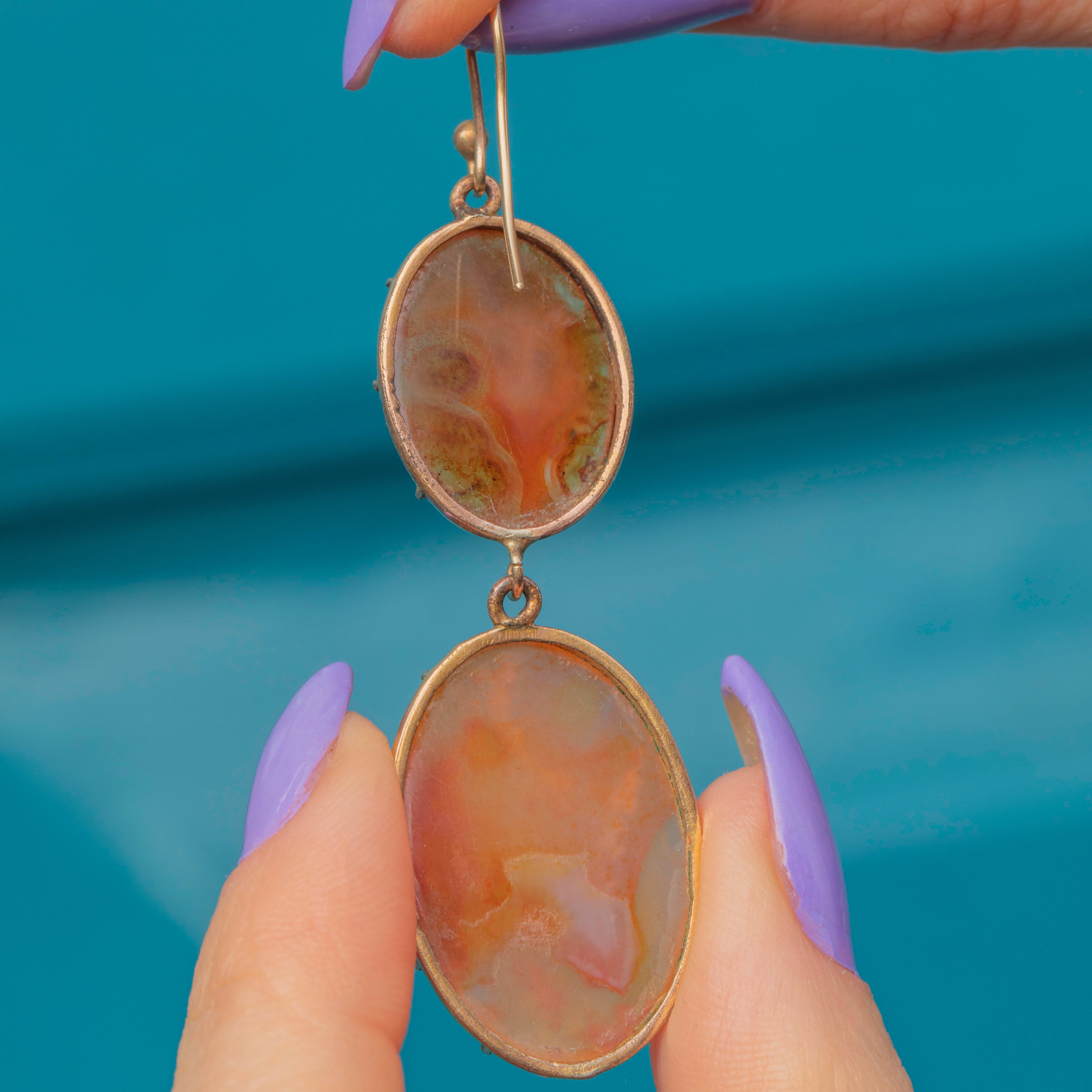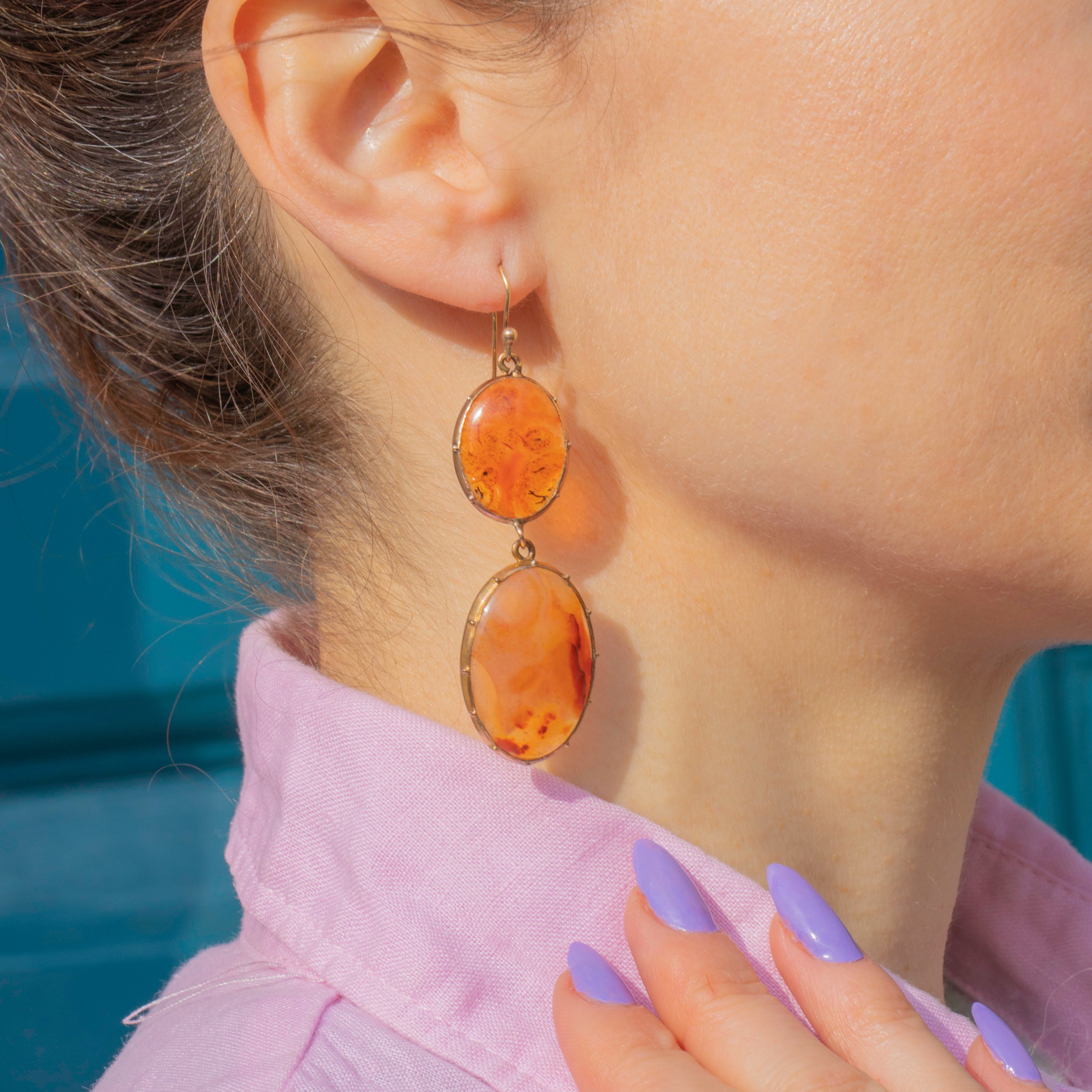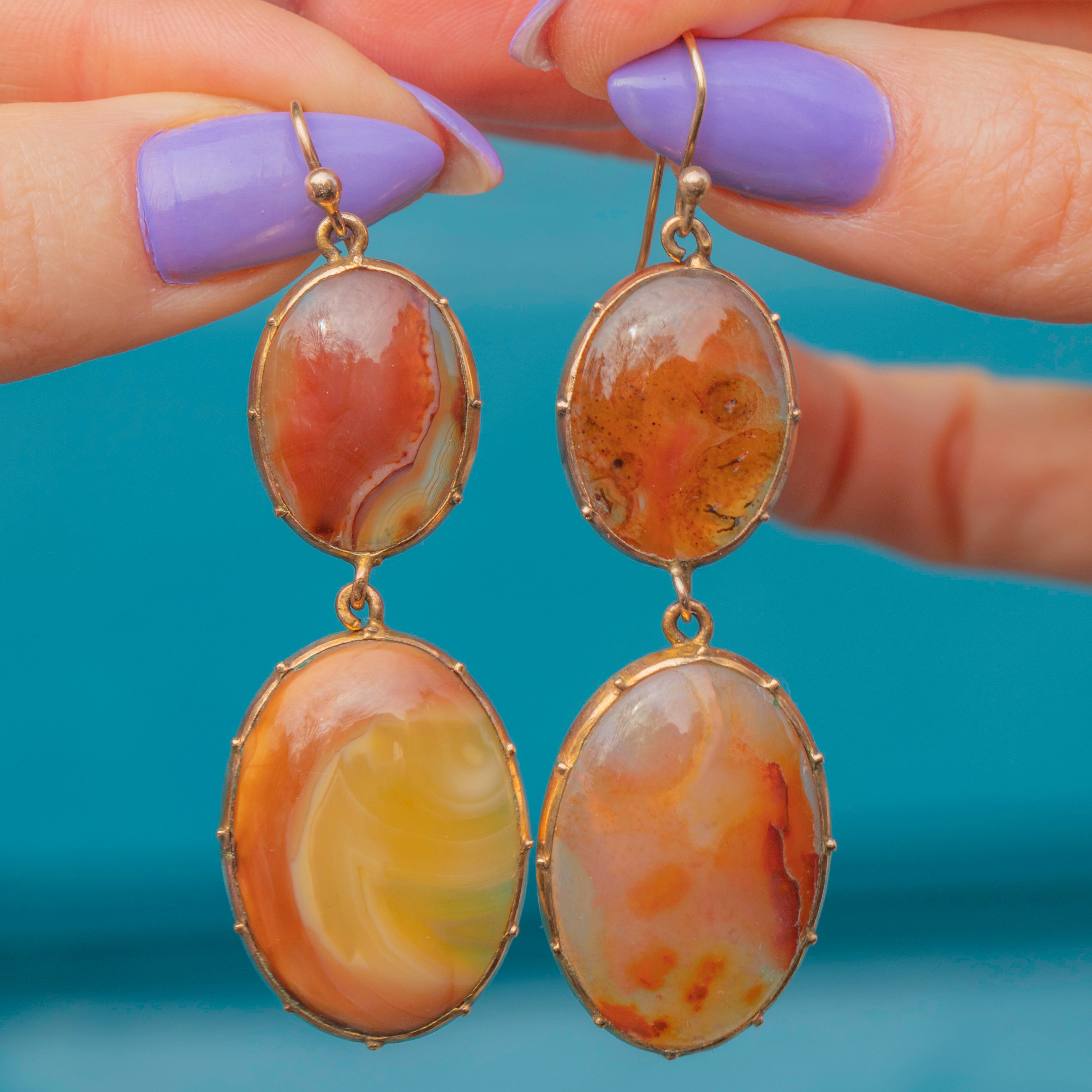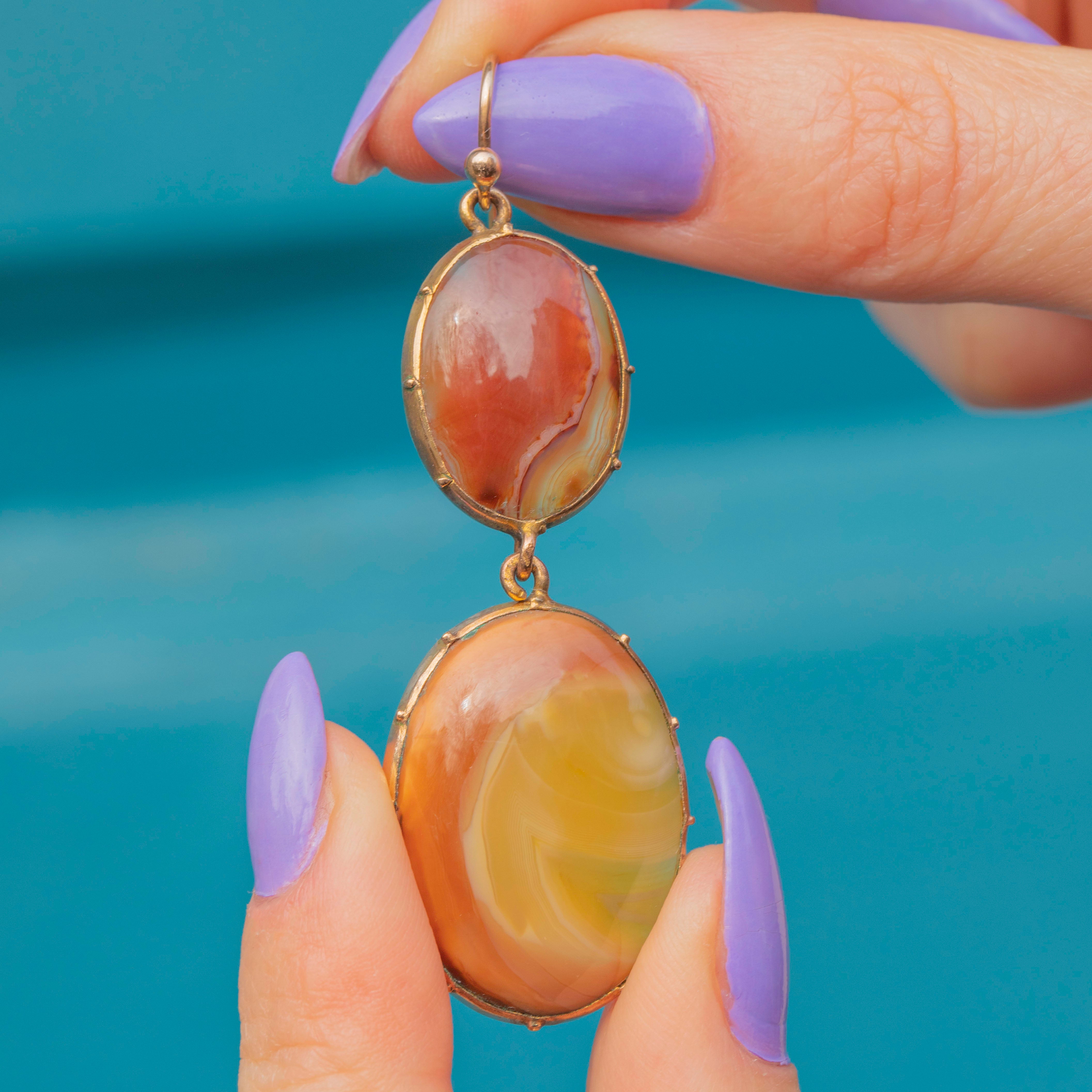 Each large drop earring features two saturated Agate cabochons, each distinctly unique in its patterns and banding. Radiating burnt umber hues, with dark speckles and wispy yellow and white, each Agate is like its own little planet!