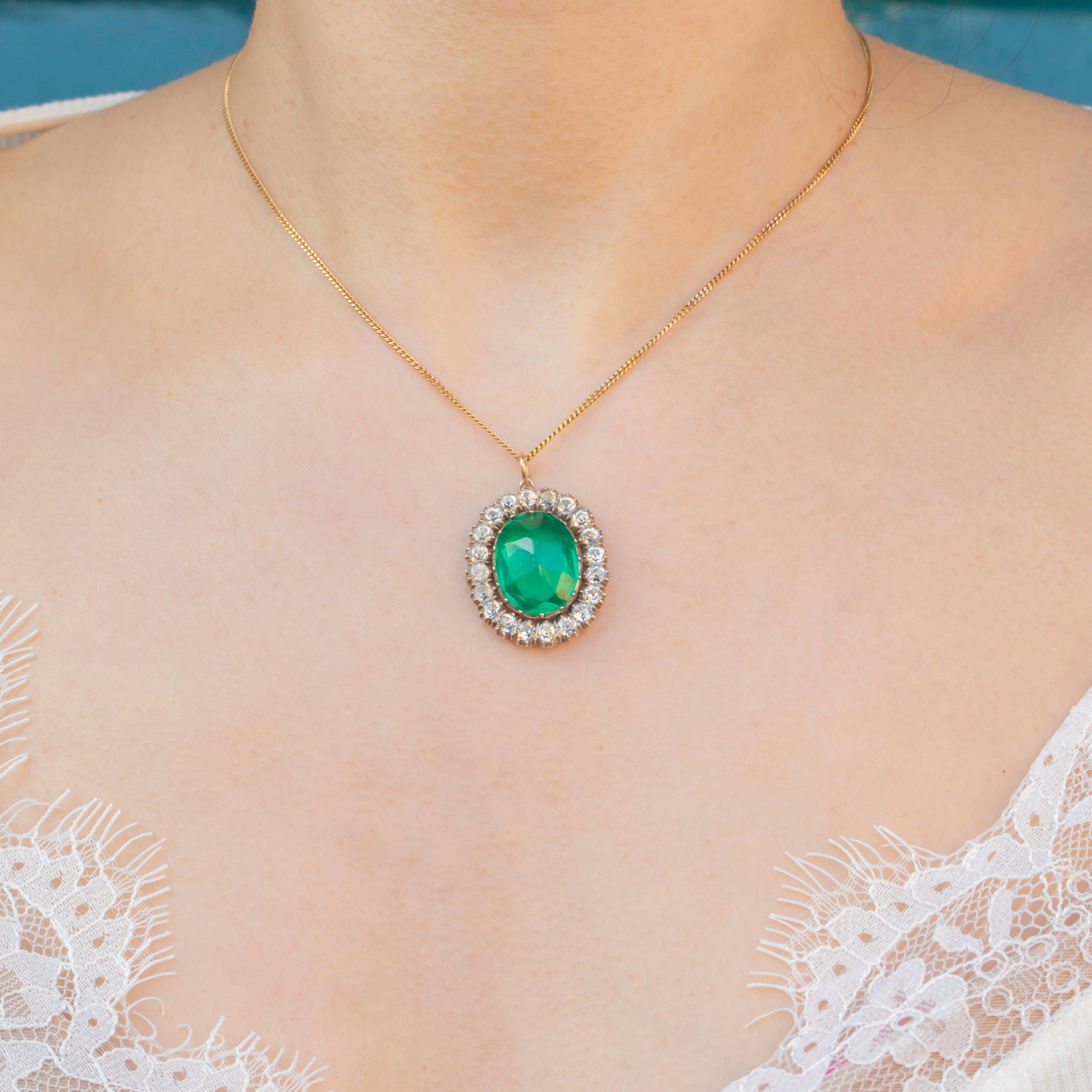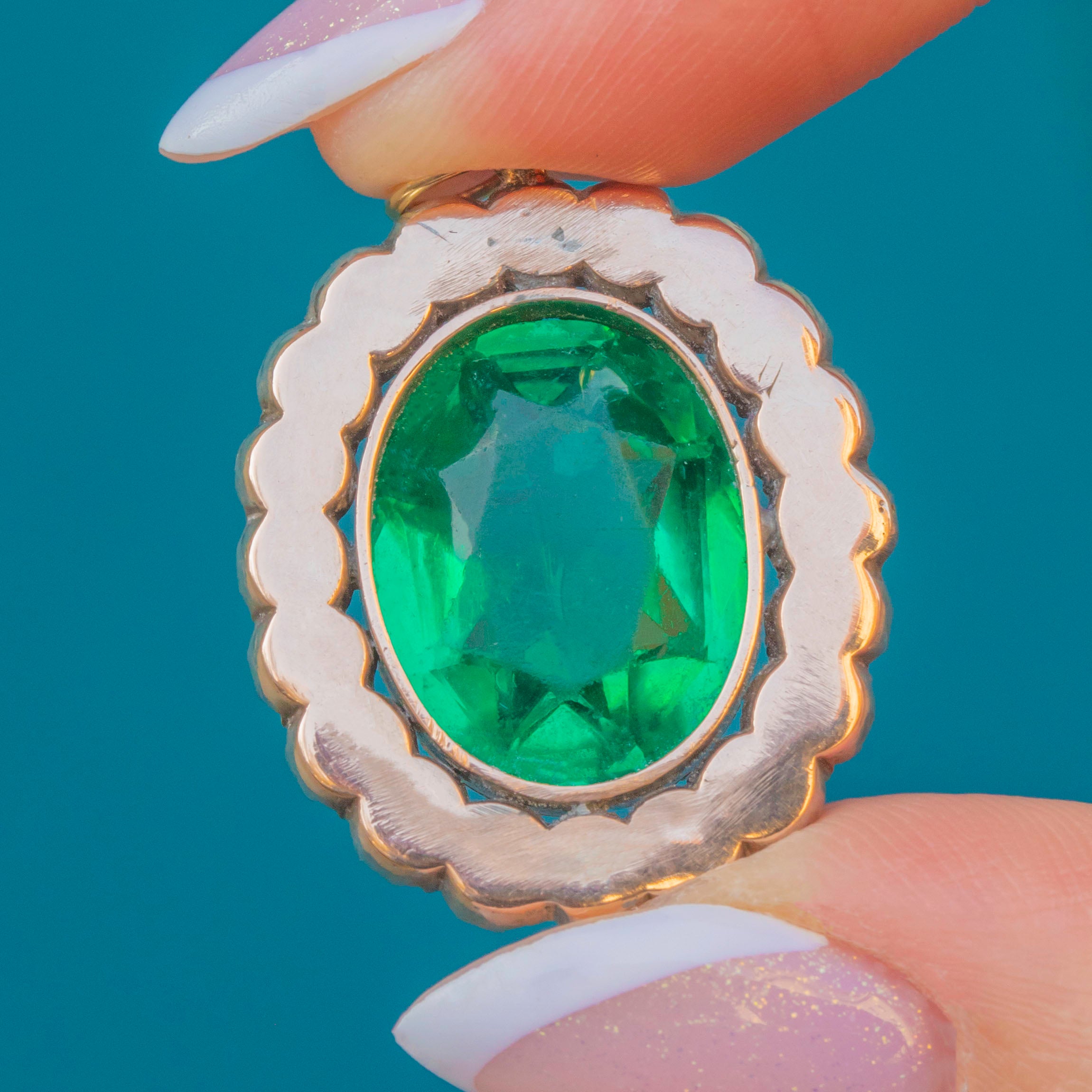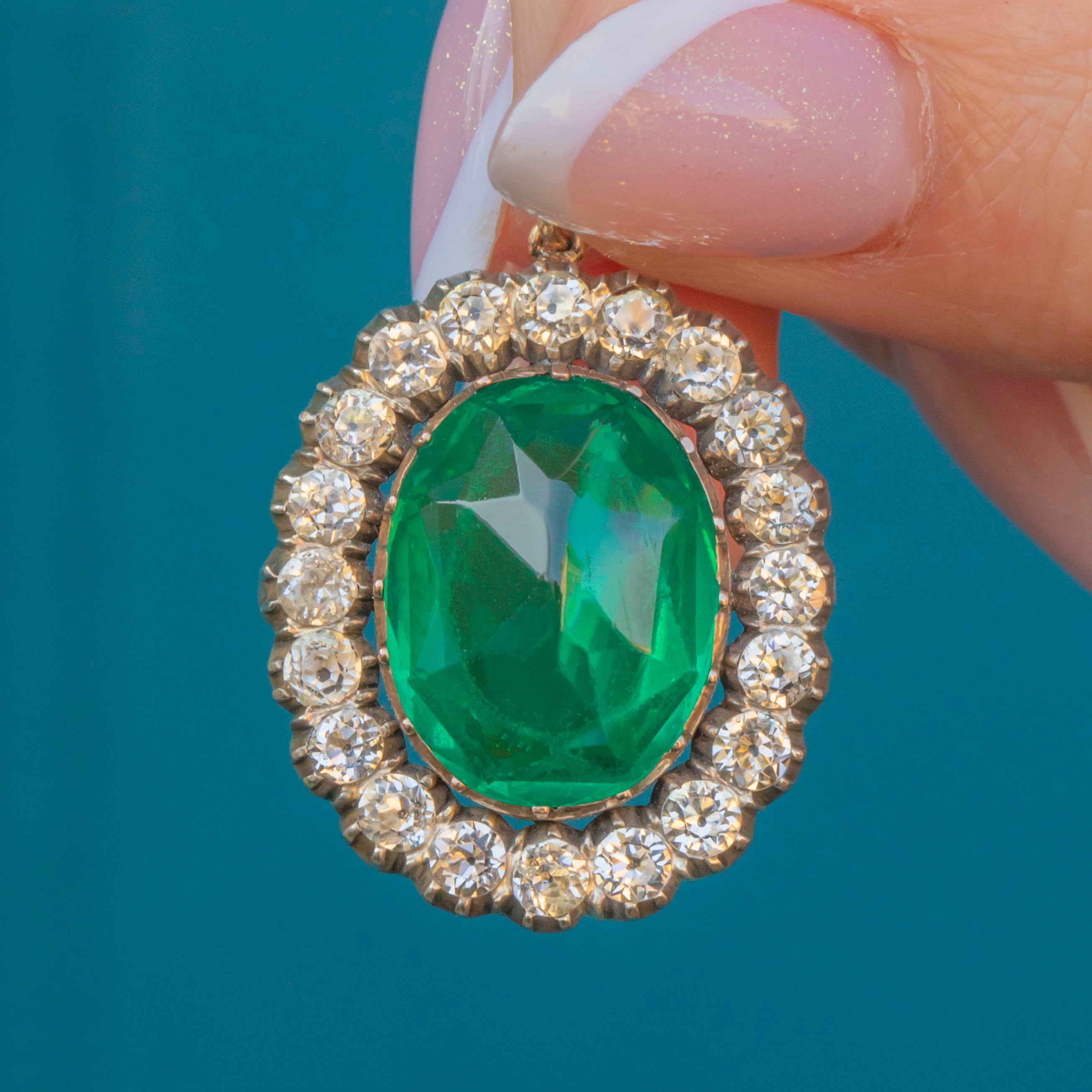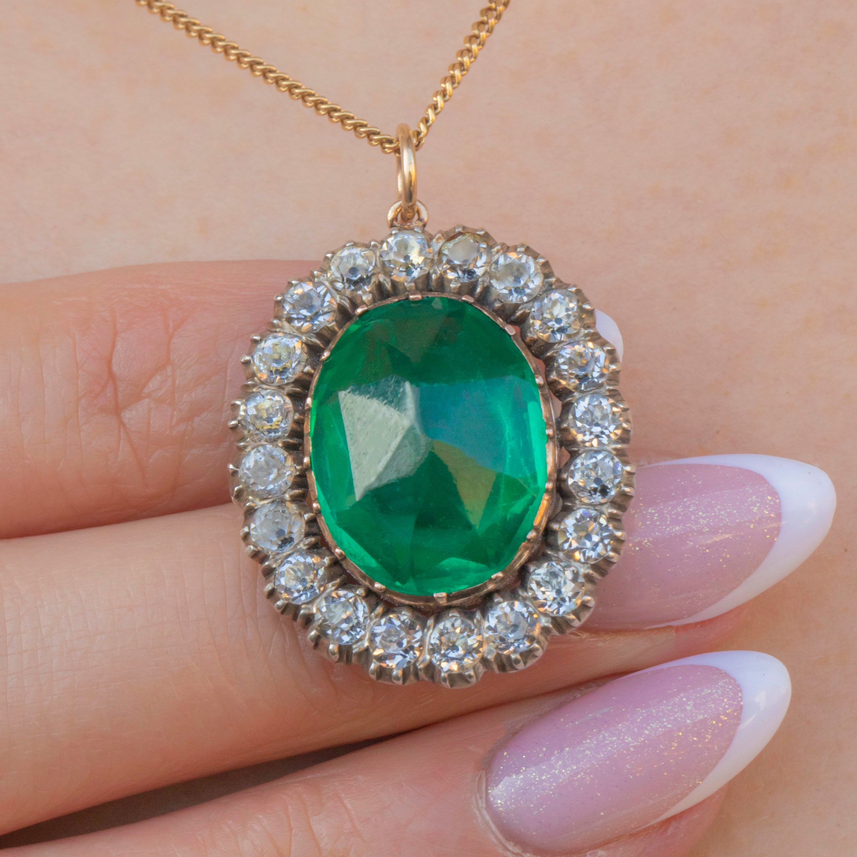 In her centre sits a vibrant Emerald Paste stone, with dramatic facets that catch the light wonderfully. She is encircled by a halo of scintillating Diamond Paste, each pandpainted with a coveted black dot in their centre to mimick the culet of a Diamond.