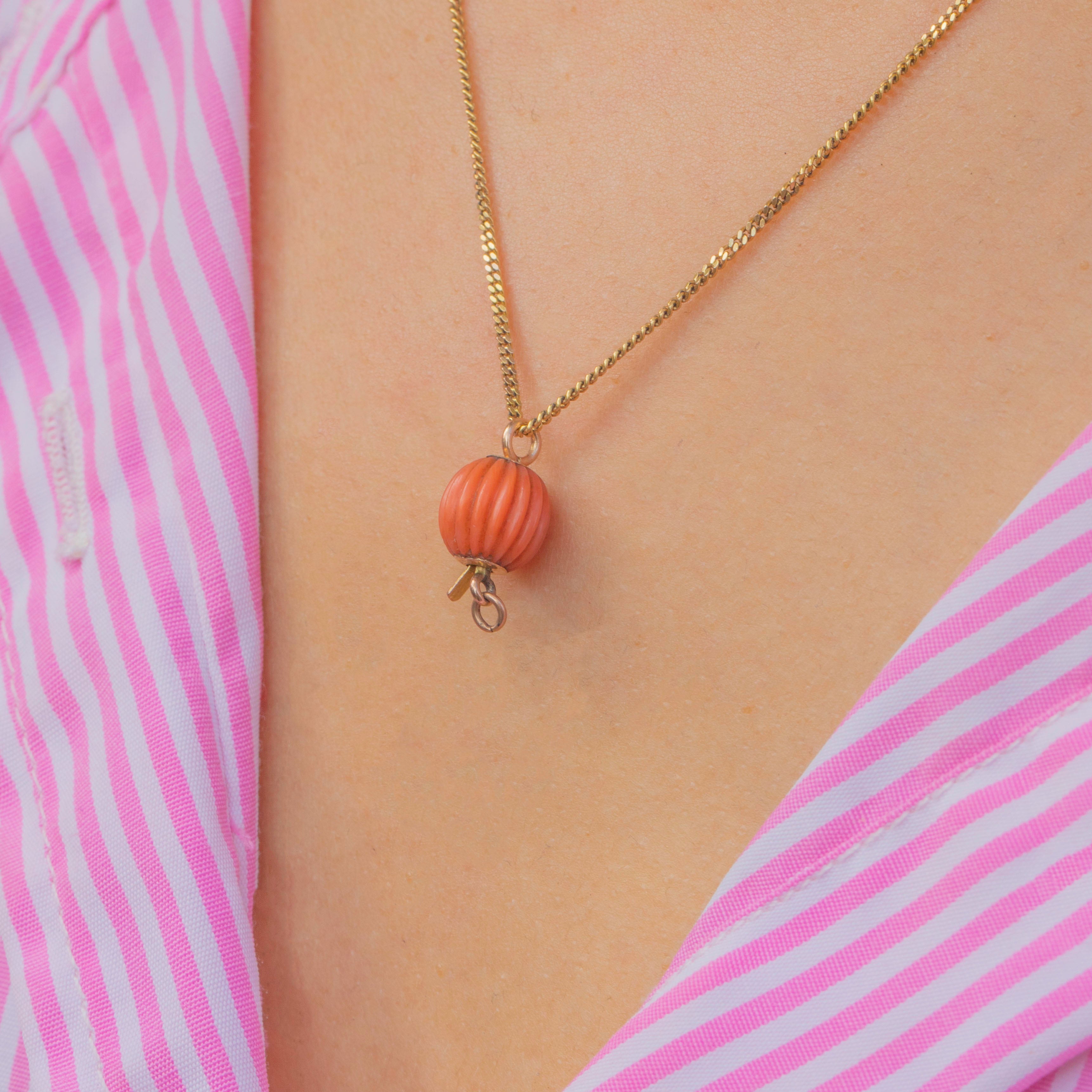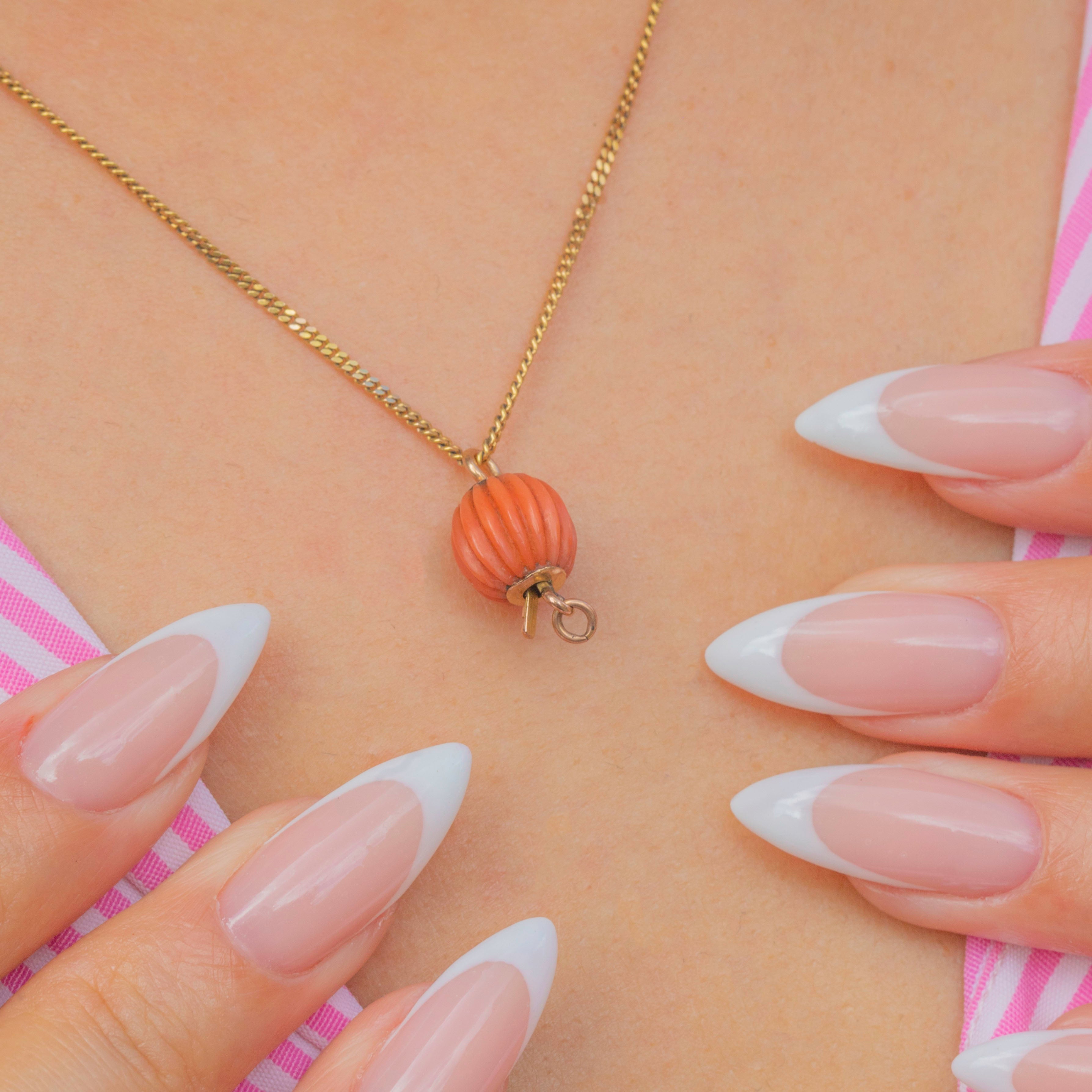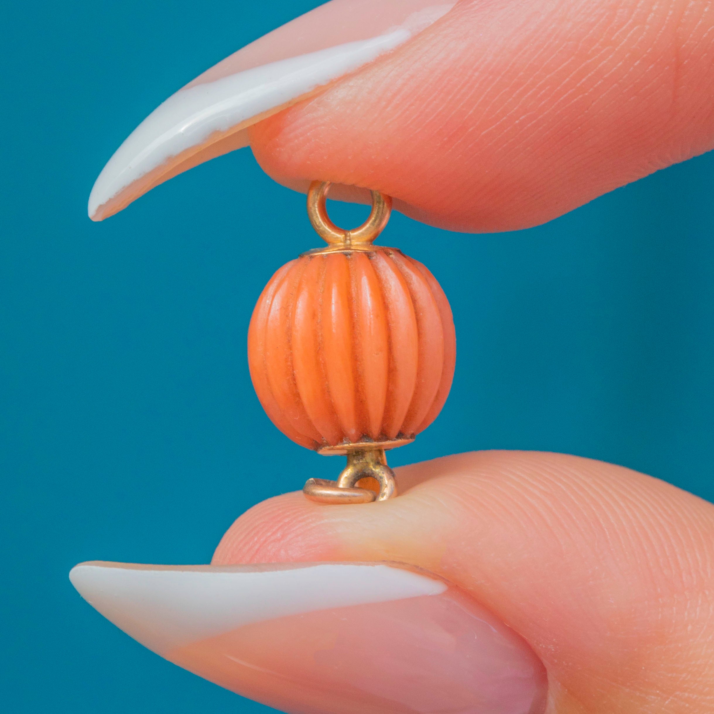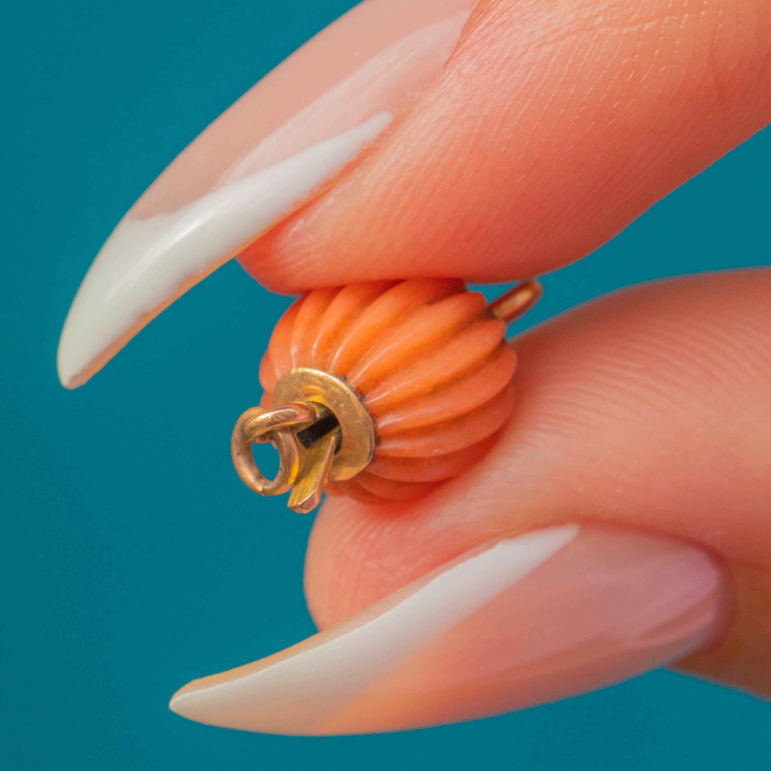 This delightful Georgian clasp is crafted in glowing Coral, shaped with gentle ridges reminiscent of a pumpkin. Its charming form and warm hue would have once served as a decorative and functional fastening for a necklace or bracelet, and it still retains its characterful beauty today.