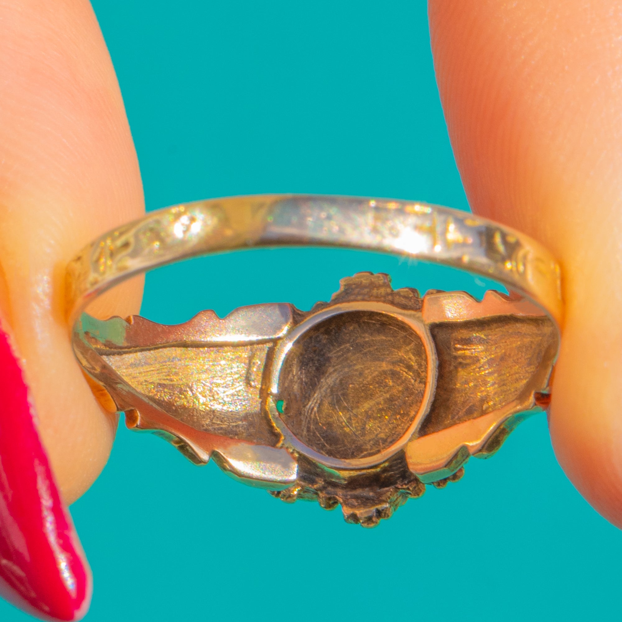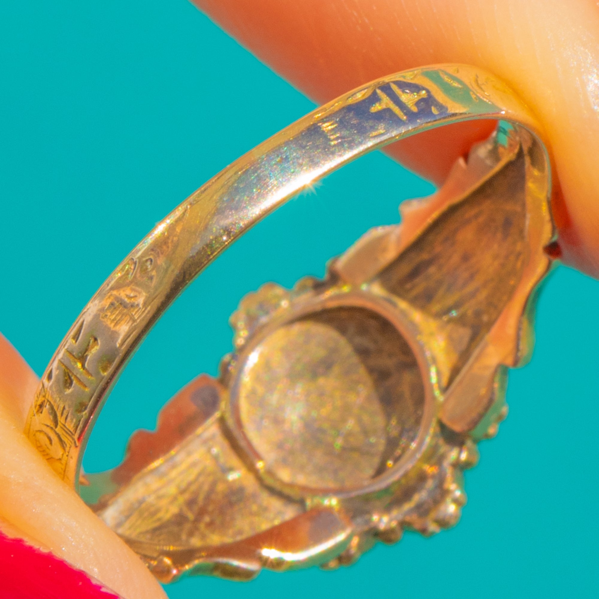 GOOD: The gemstones show surface wear and small abrasions consistent with age. The Gold setting and engraved band display light wear with some discolouration to the inside of the shank, and there is evidence of an old resize at the back which has worn away parts of the original engraving. Presents beautifully with an attractive antique patina.