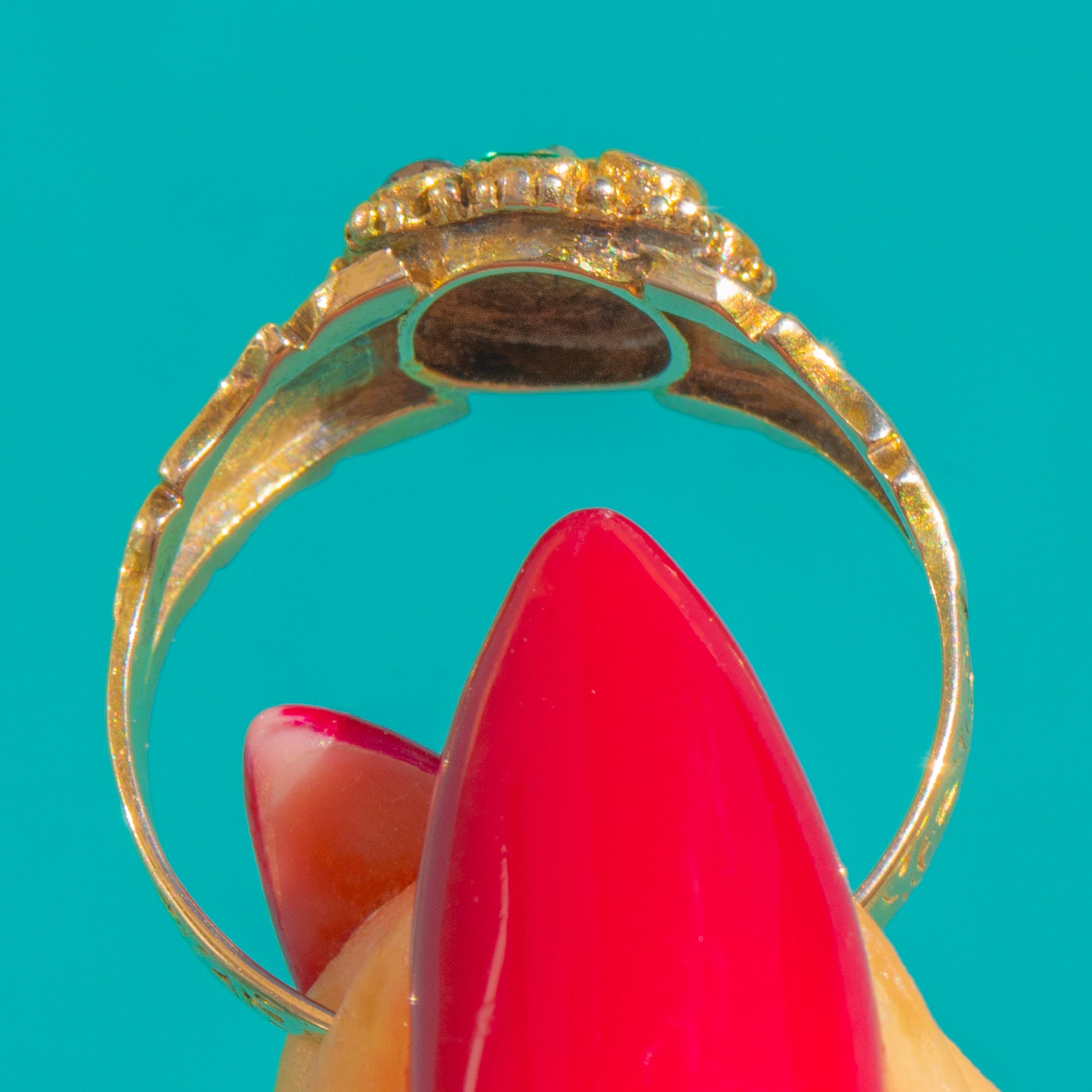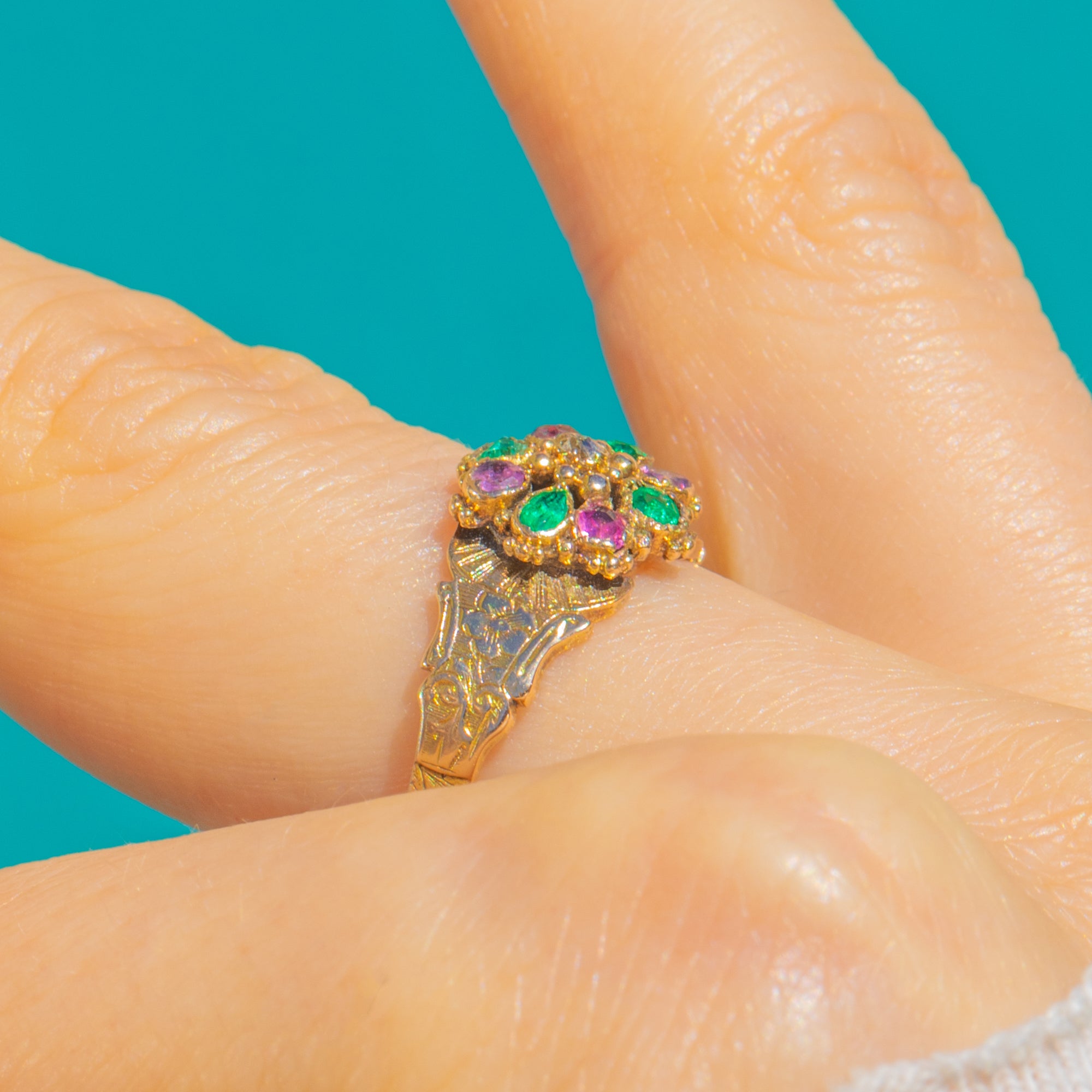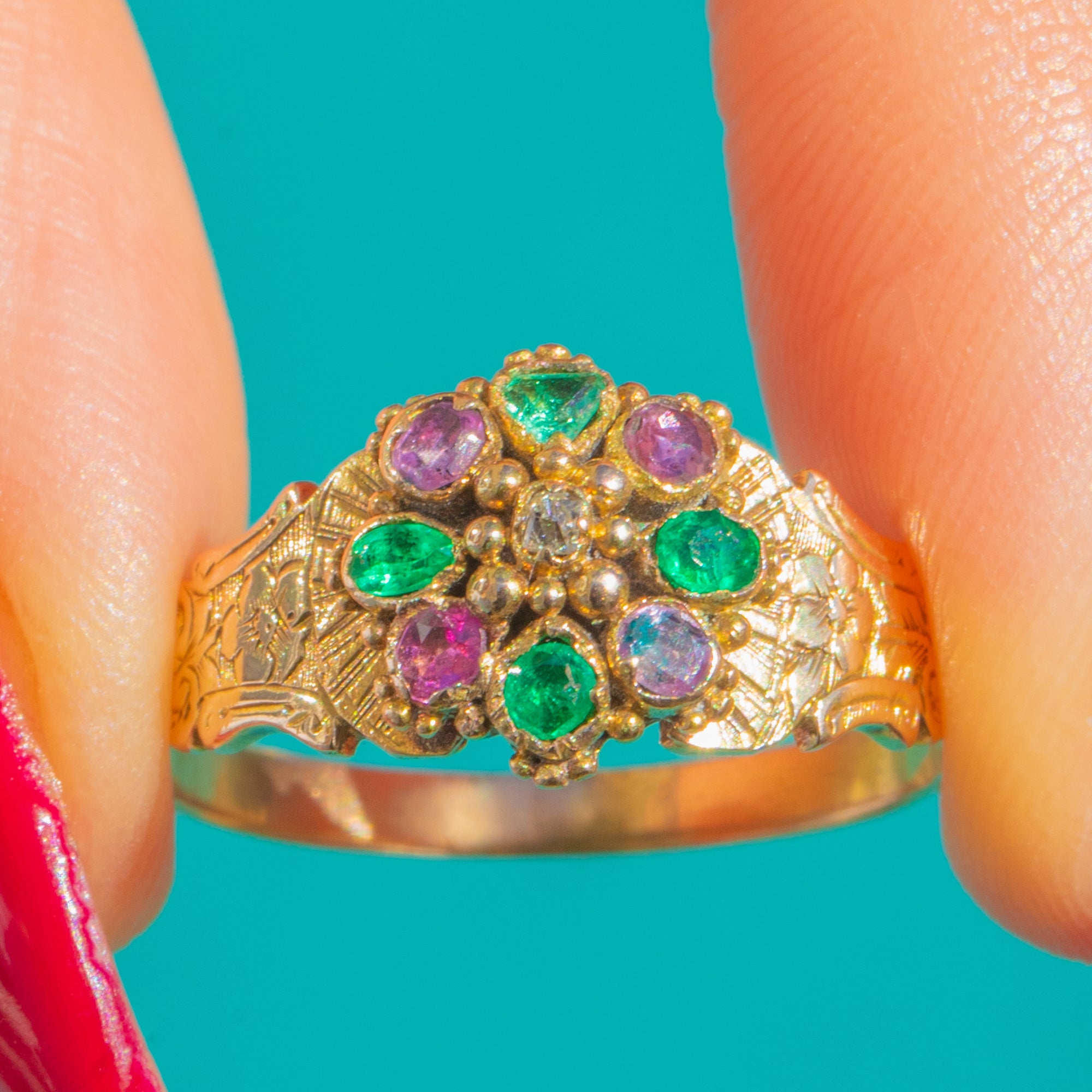 Georgian Engraved 18ct Gold Amethyst Emerald Diamond Flower Ring