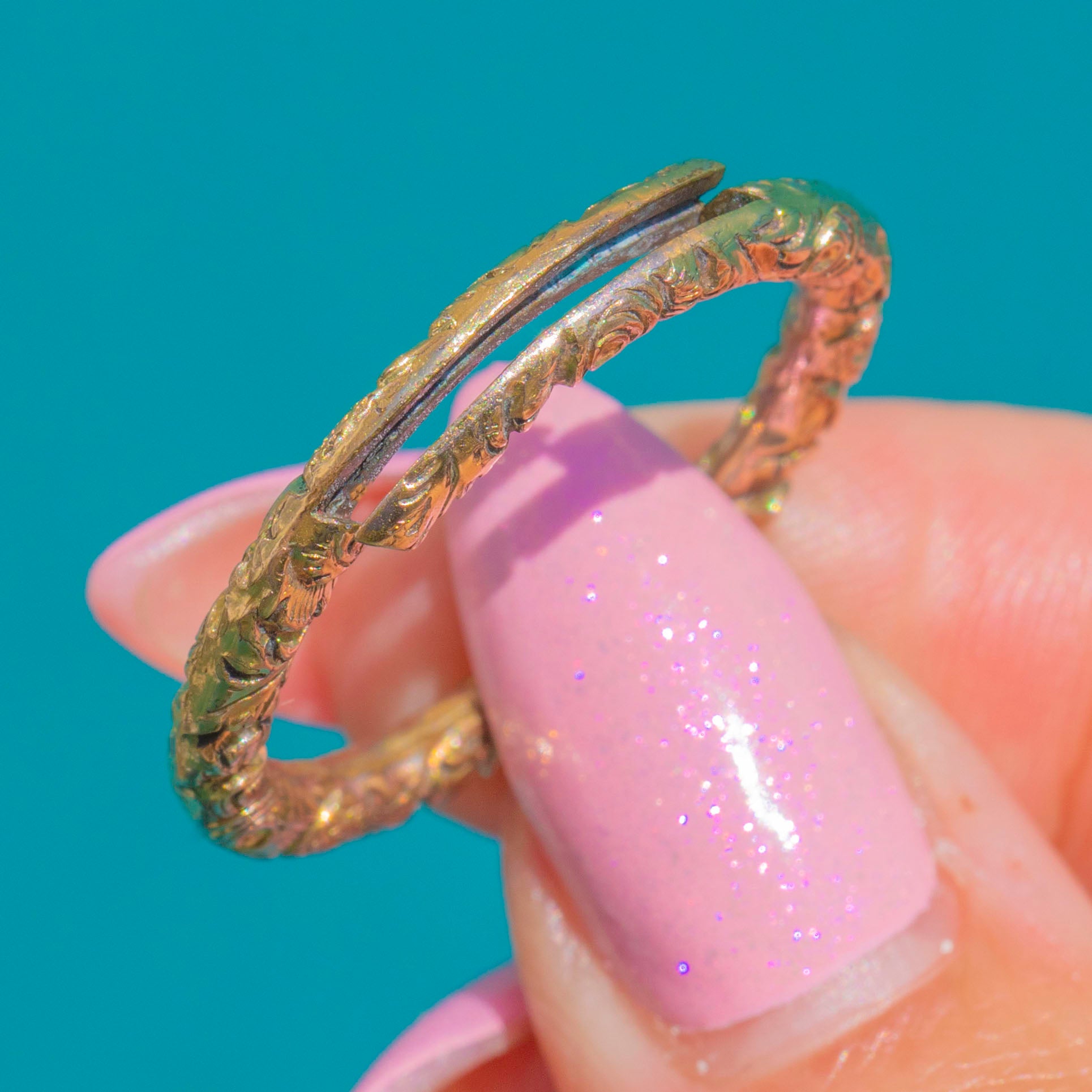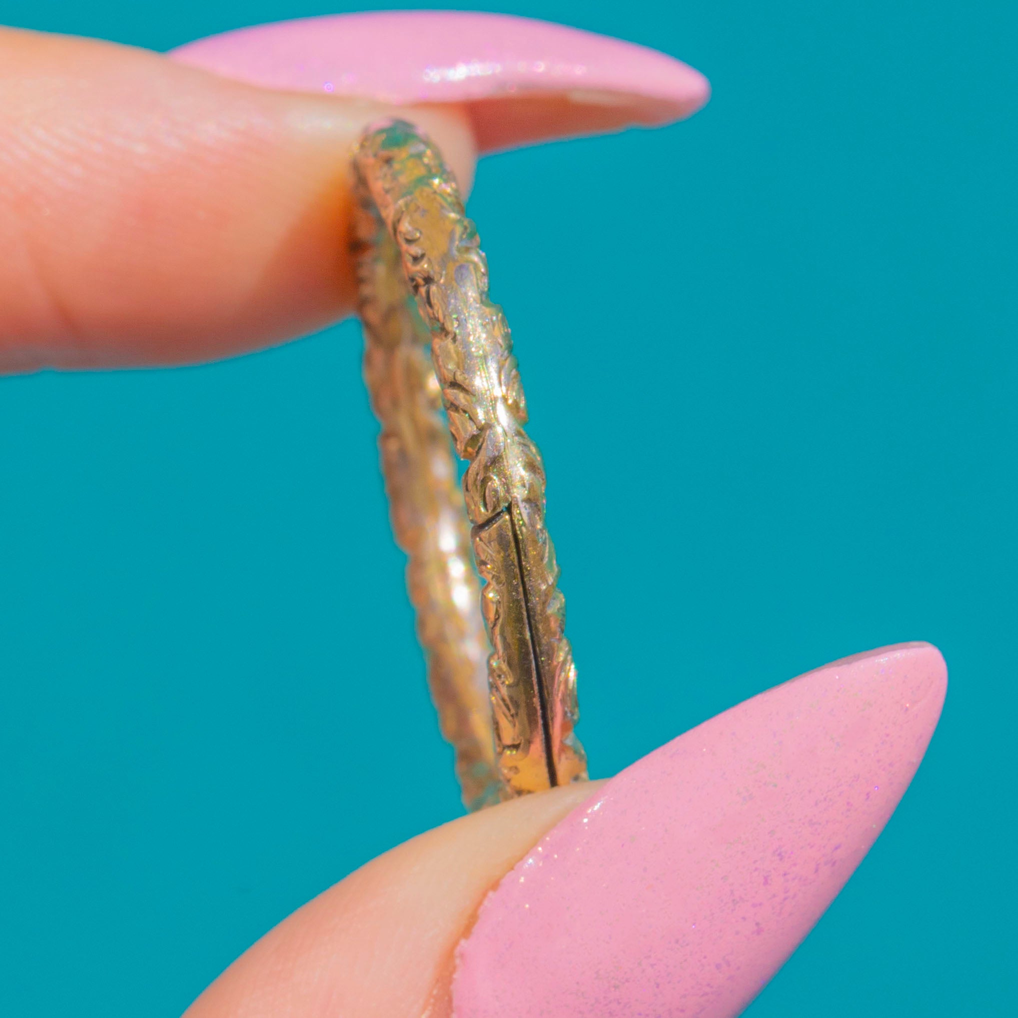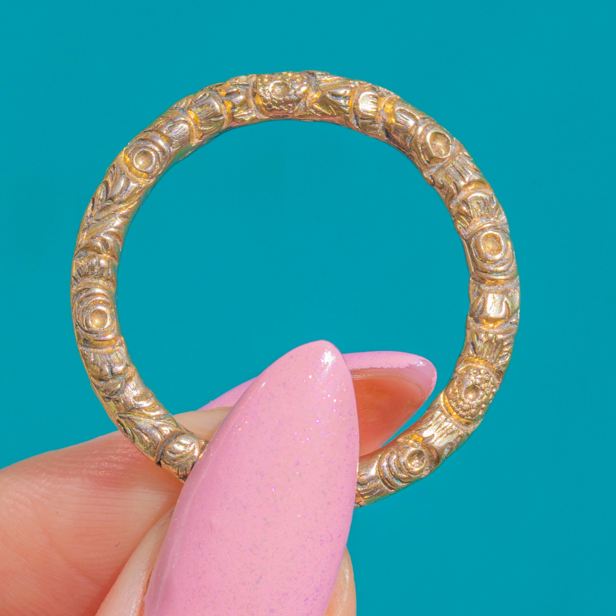 Beautifully ornate and wonderfully practical, this extra-large Georgian Gold-Cased engraved split ring is a treasure of crisp detail and warm glow. Its broad circular form is worked all around with foliate scrolls, rosettes and tiny beaded accents, creating a richly textured surface that catches the light with every movement.