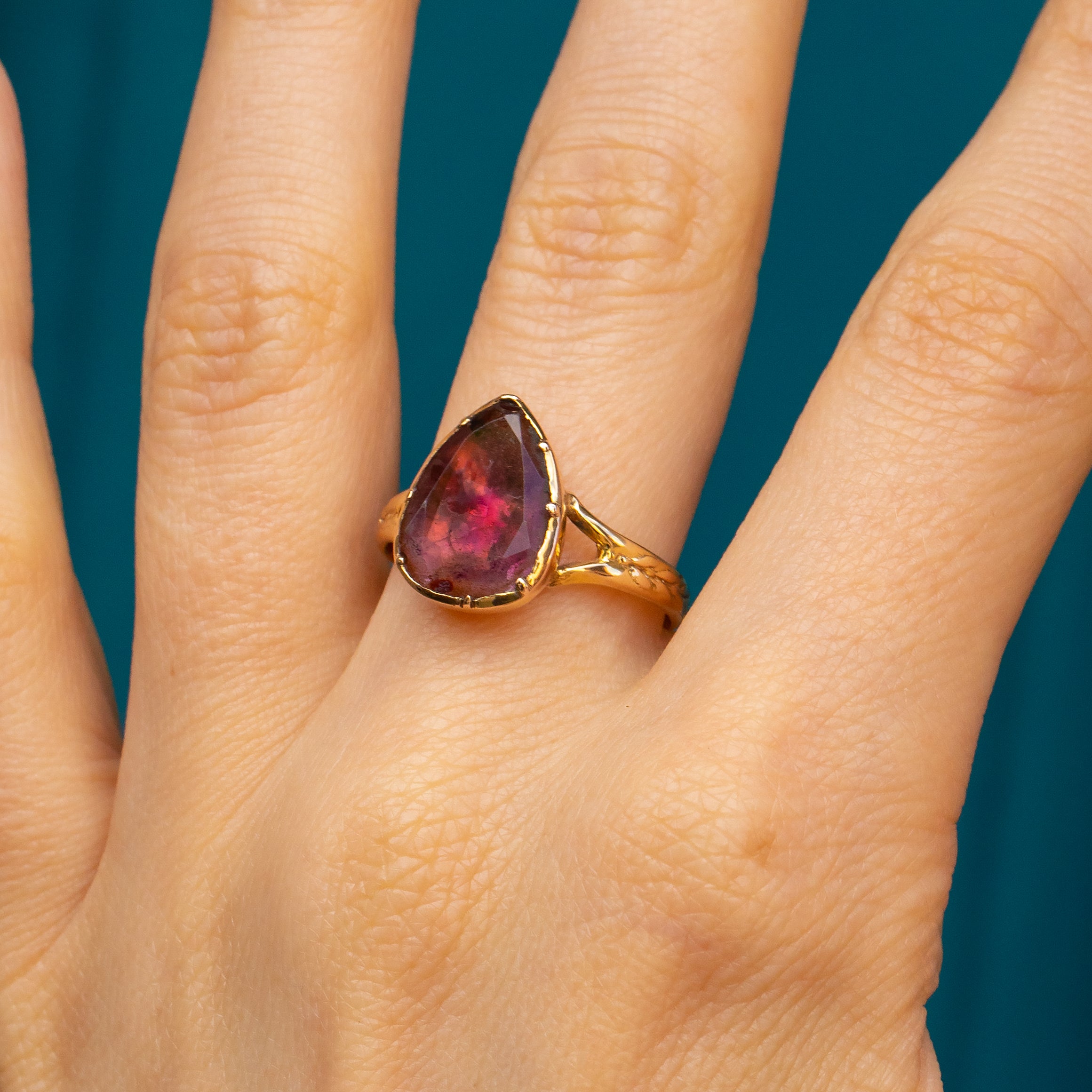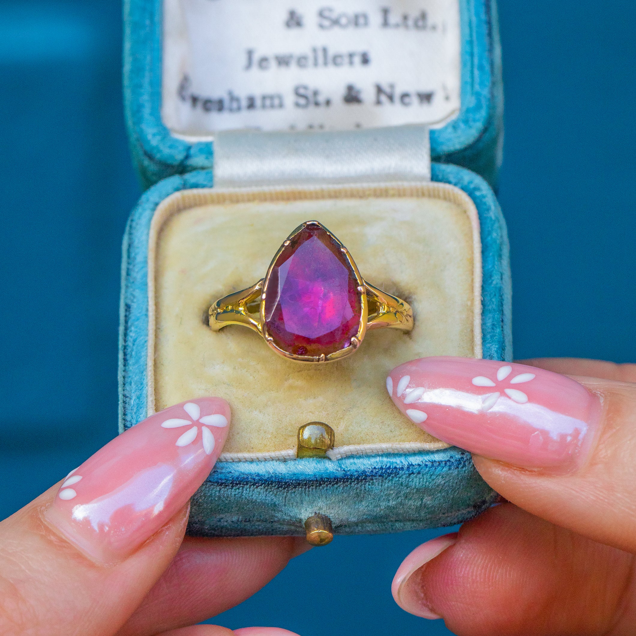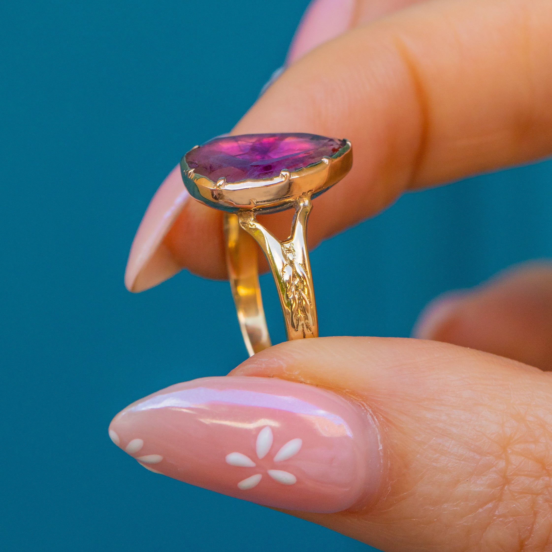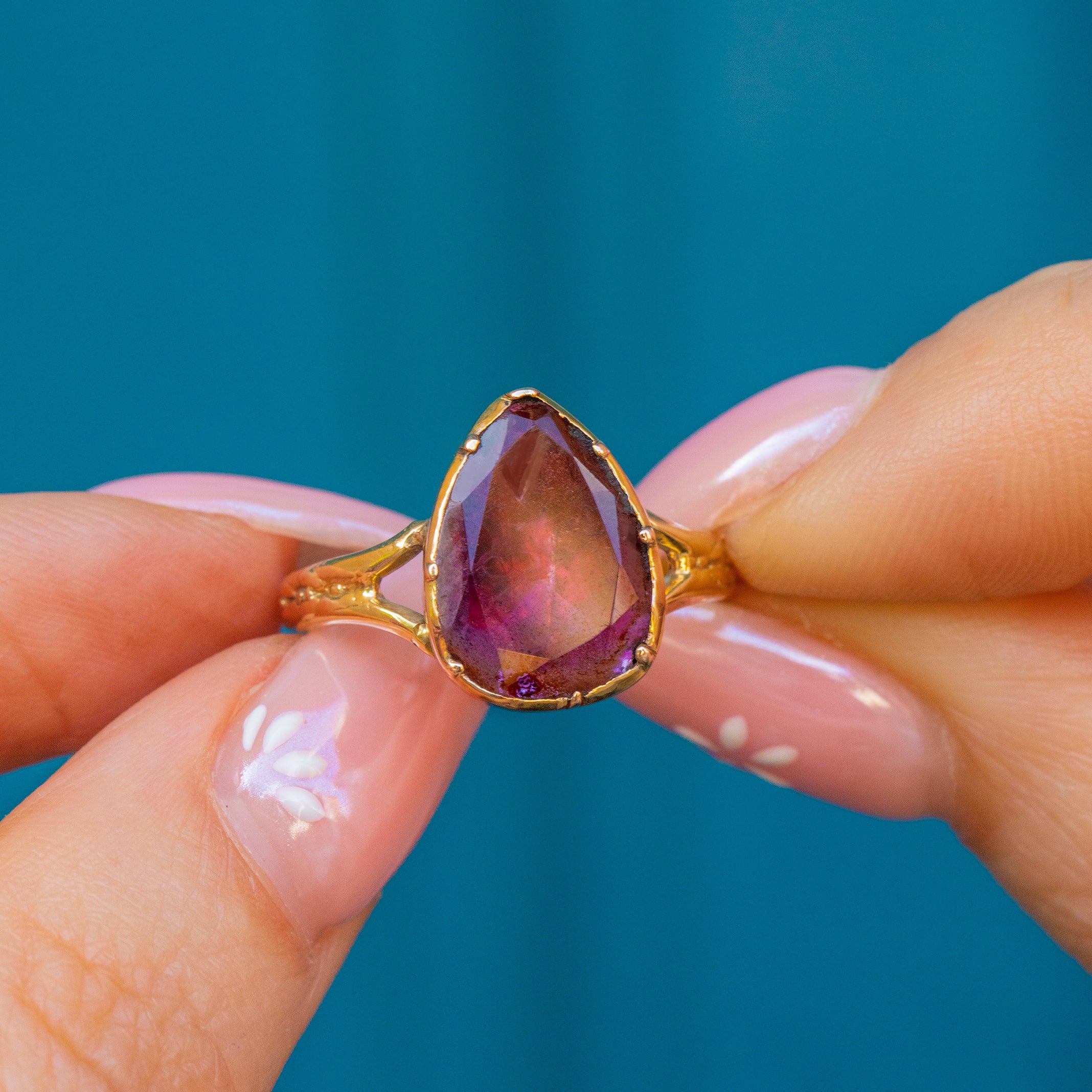 VERY GOOD. This antique flat-cut Garnet pear shaped ring is in very good condition! The flat-cut Garnet is set securely within its settings, fabulously faceted, flaunting a unique mystical purple hue. The Gold has a lovely blush finish, with wonderful reflective qualities. There is some surface wear on the back of the domed setting where we believe she was previously converted, but this doesn't affect comfortability, and it's likely the shank is a later addition. This antique ring is perfect for bringing a punch of personality to any ring stack!