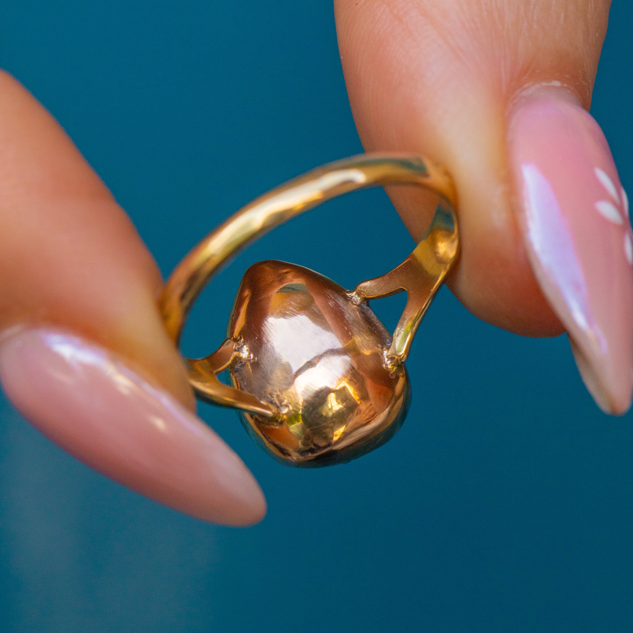 Pie crust settings crafted entirely from sun-kissed 9ct Gold hug the pear-shaped Garnet securely, displayed between tapered shoulders with delicate engravings. With an elegant form throughout, this Georgian Garnet ring elongates your hand, bringing a touch of regality. With a smooth domed back, this pear Garnet ring glides onto your hand a dream, allowing you to display her beauty in comfort.