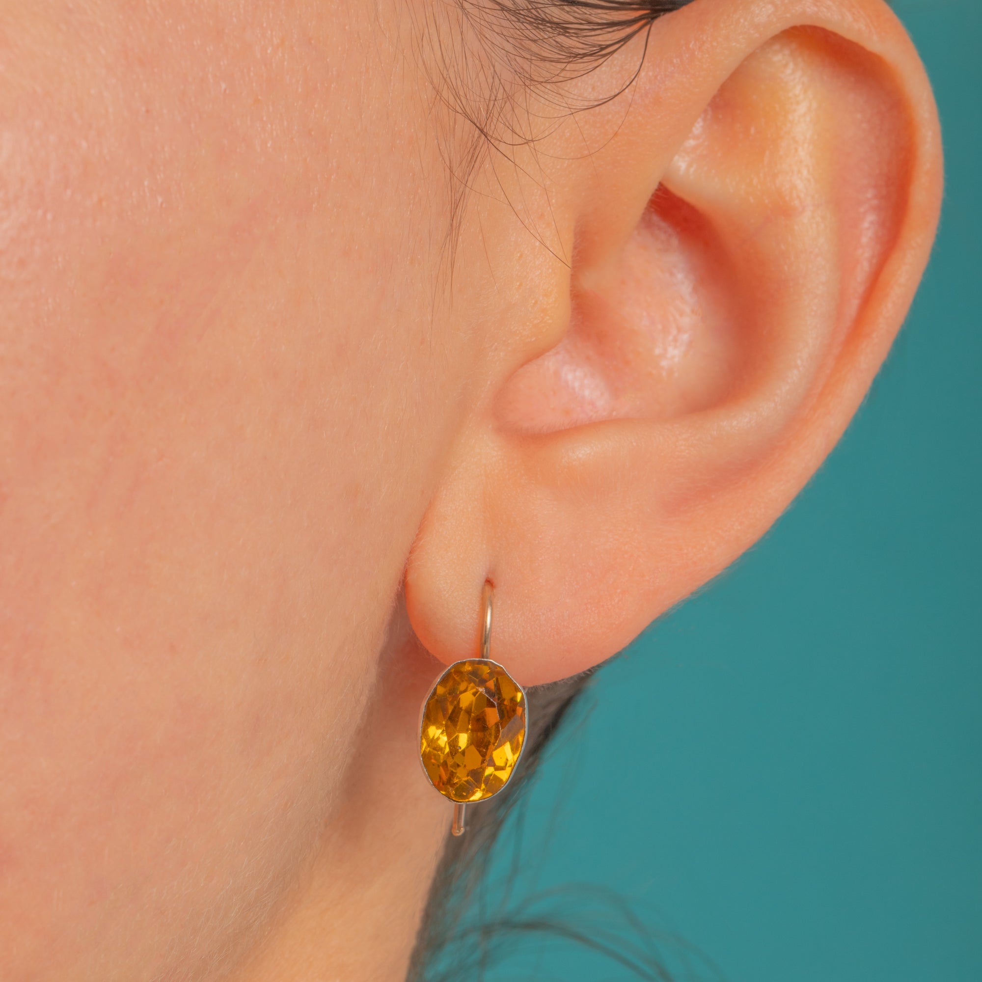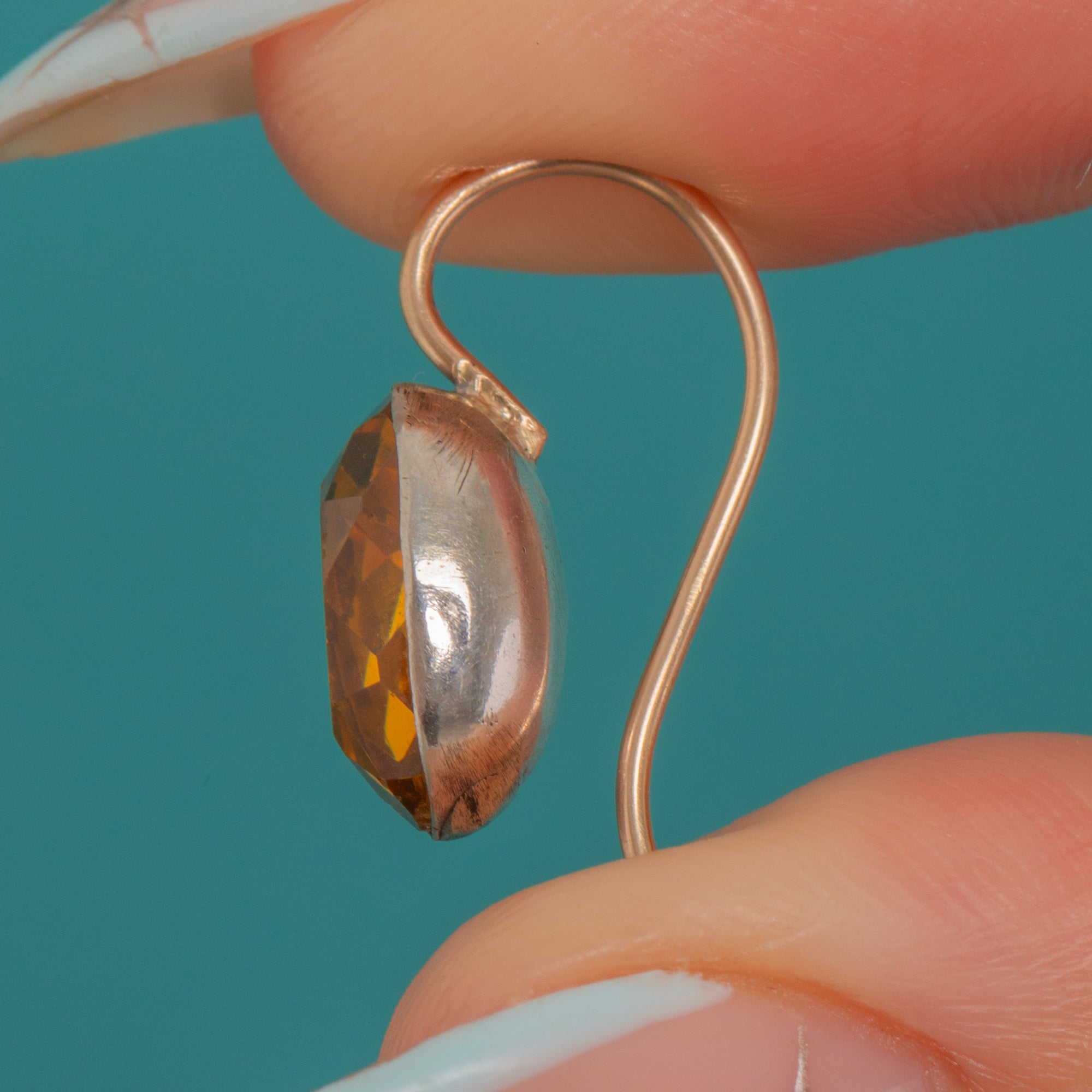 A sweet Georgian treasure, these petite drop earrings glow with foiled Yellow Paste in refined bezel settings. The oval stones radiate warm, Citrine-esque hues, their colour deepened by the traditional foil backing and framed by smooth rubover bezels for a refined, gem-forward look.