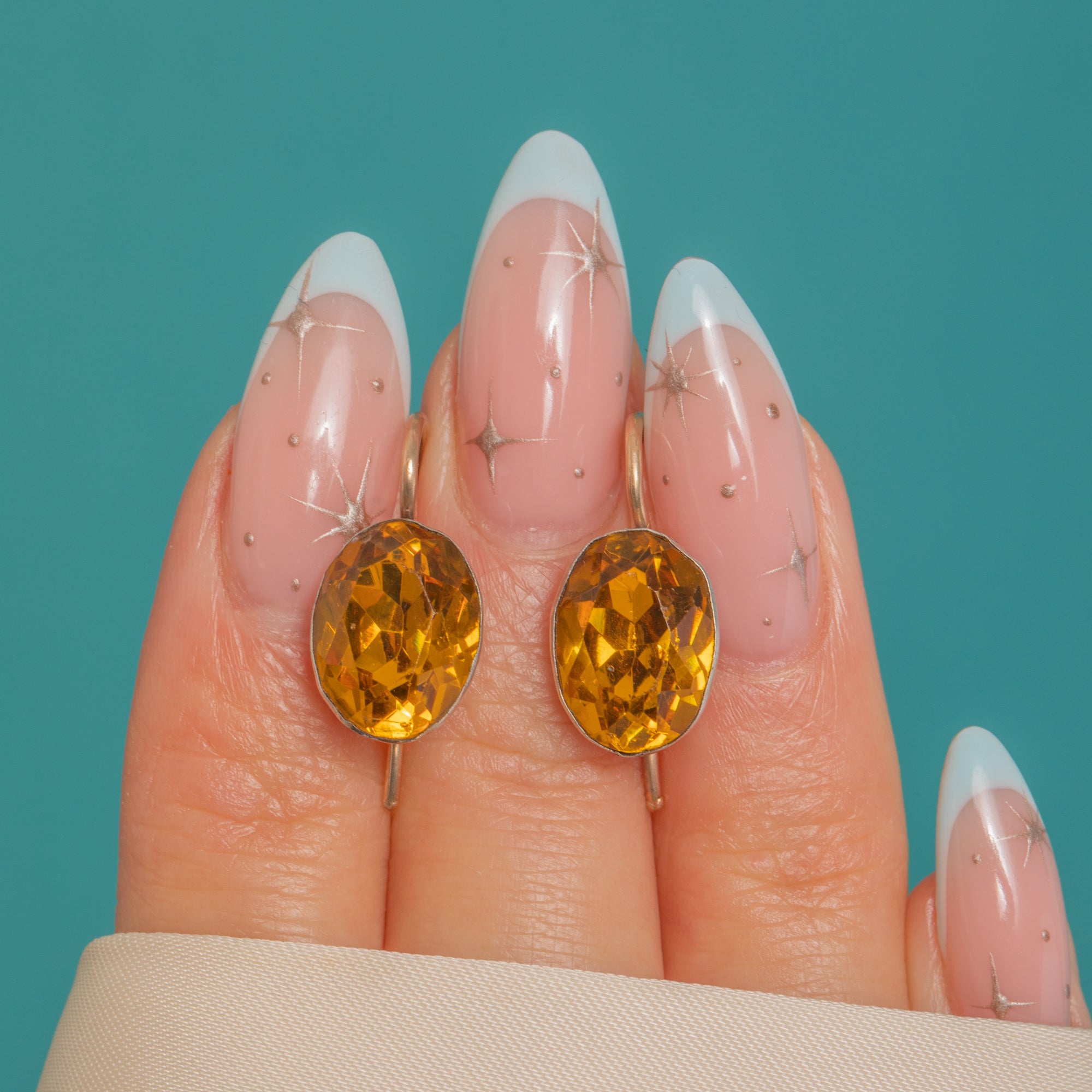 MATERIALS: Tests as 9ct Gold French hooks, Silver settings, Yellow Paste.