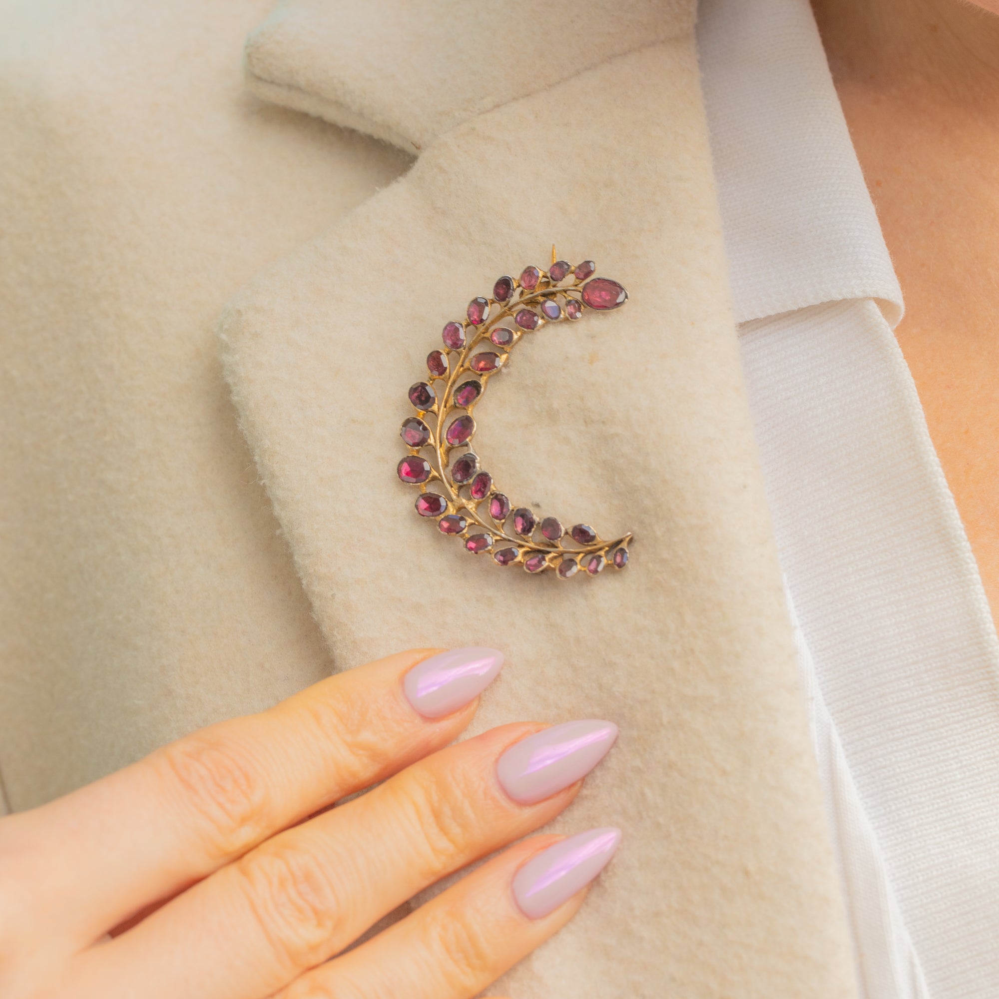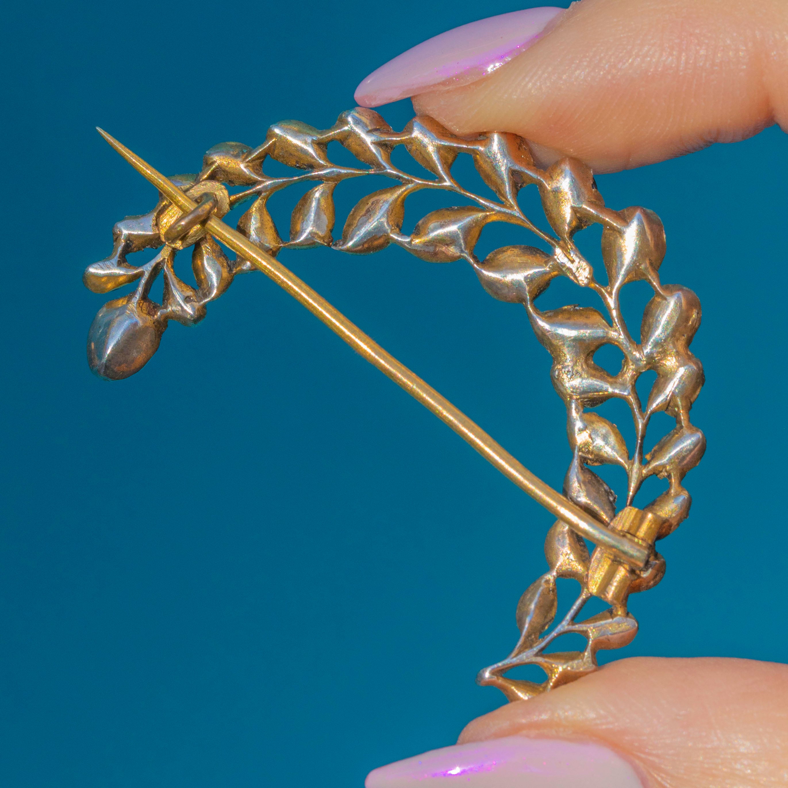 The sparkling stones graduate gently along the crescent, giving lovely rhythm and movement, while the warm gilt adds a rich antique glow.