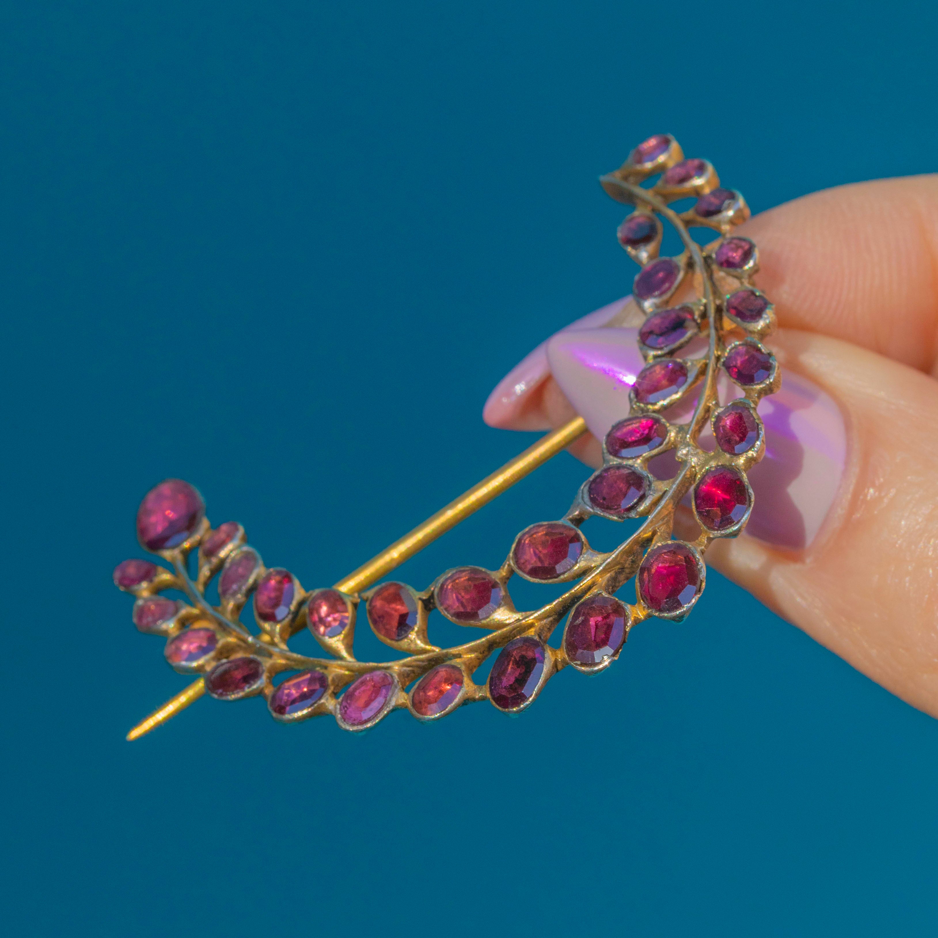 A beautiful Georgian brooch modelled as a curving leafy spray, set throughout with vivid red Garnets in Gilded Silver.