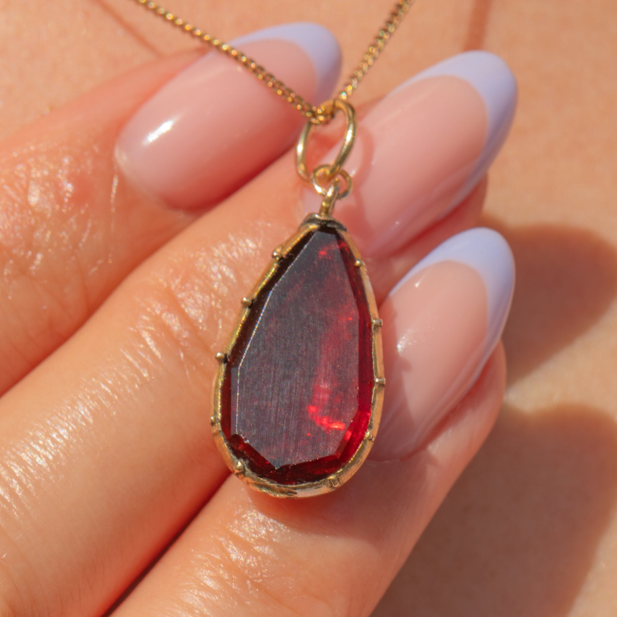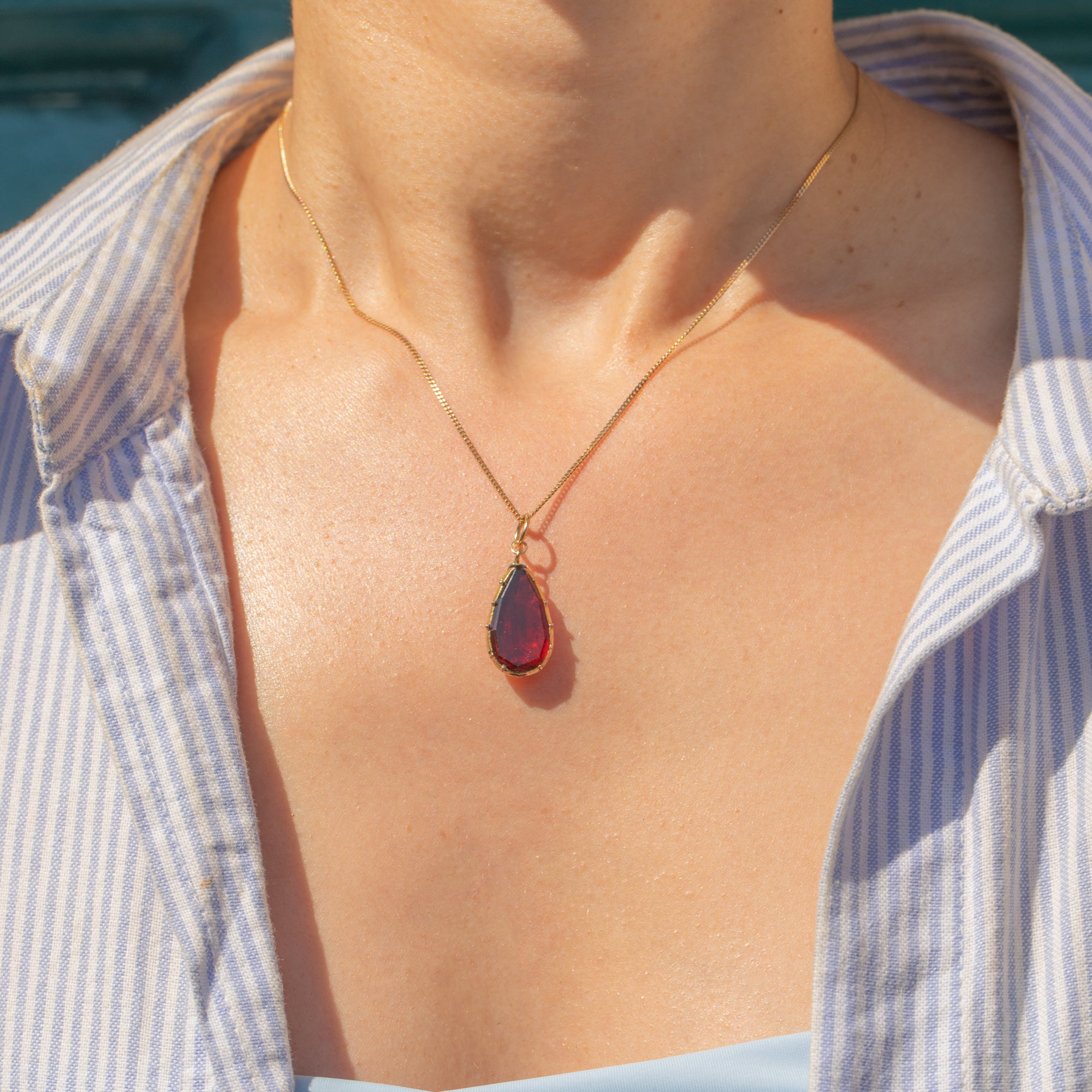 This Georgian Garnet Paste pear pendant is a tasty little treat! The flat-cut Garnet Paste has a gorgeous burgundy hue, revealing seductive flashes of crimson as its foiled backing catches the light.