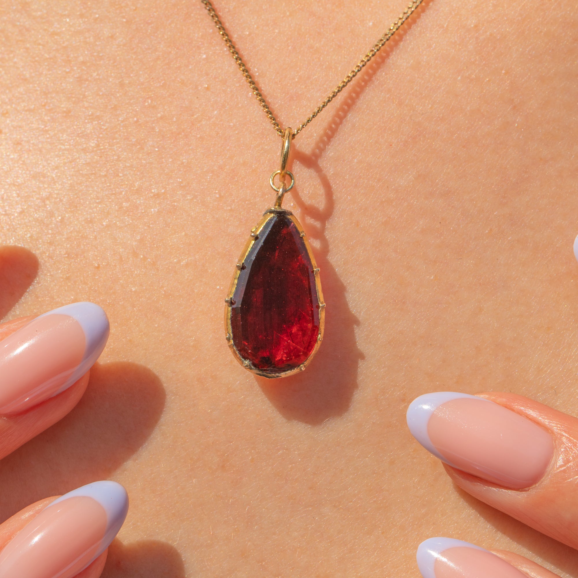 The deep red hue of the Paste is perfectly complemented by the saturated Gold-toned metal, with its piecrust settings adding a distinct Georgian edge. Endlessly wearable, this Georgian pendant will bring a touch of gothic glamour to your repertoire!