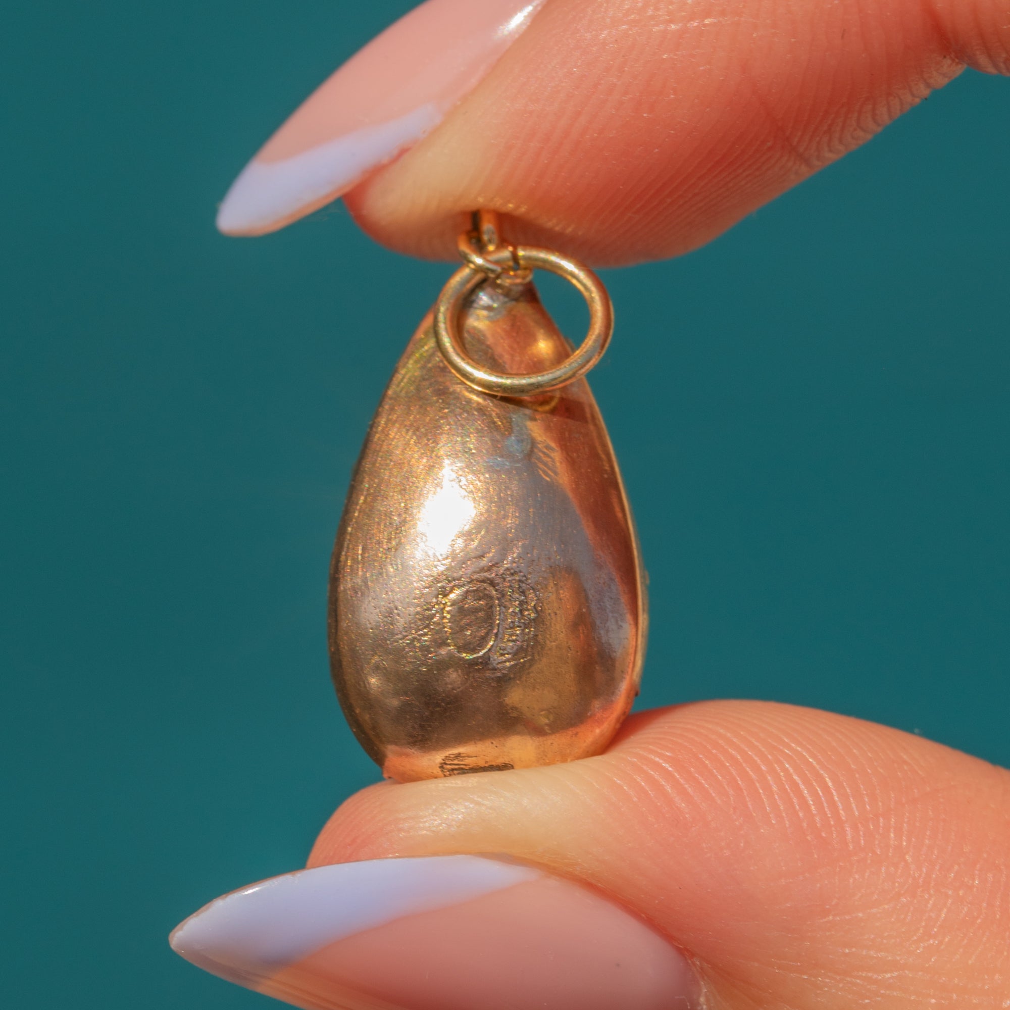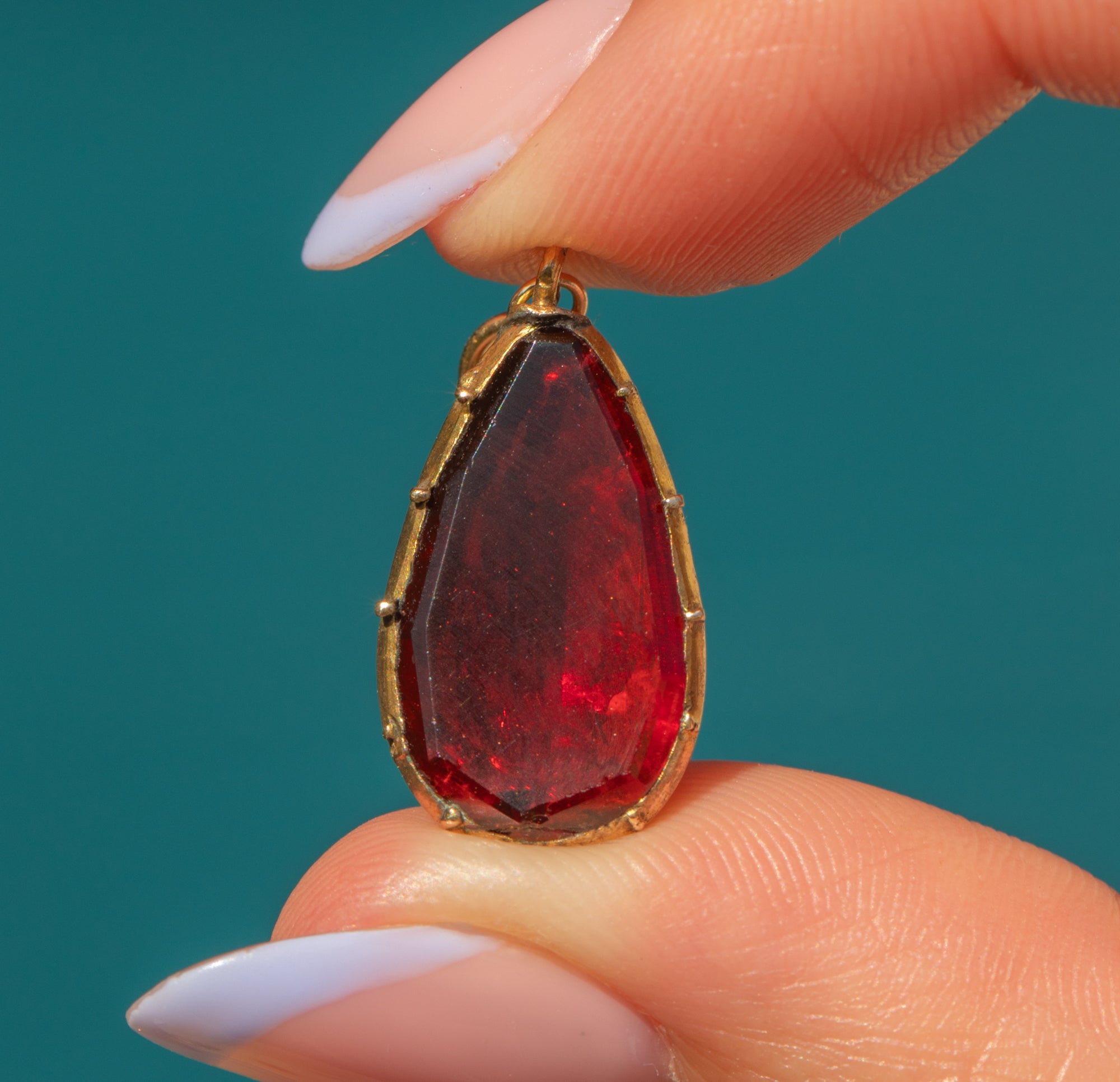 VERY GOOD: This Georgian Garnet Paste pear pendant is in very good condition, which is quite remarkable given its considerable age! The Paste has been wonderfully preserved, with a deep red hue and only a couple of very minor fleabites around the edge. The Gold-toned metal is buttery and the crimped settings are defined. Under close inspection, there is some wear around the setting, but the Paste is securely set. There are some areas of wear on the back, but this is not visible from the front, and it feels comfortable against the skin. If you have a penchant for Georgian jewels, this antique Paste pendant will make a lovely addition to your collection!