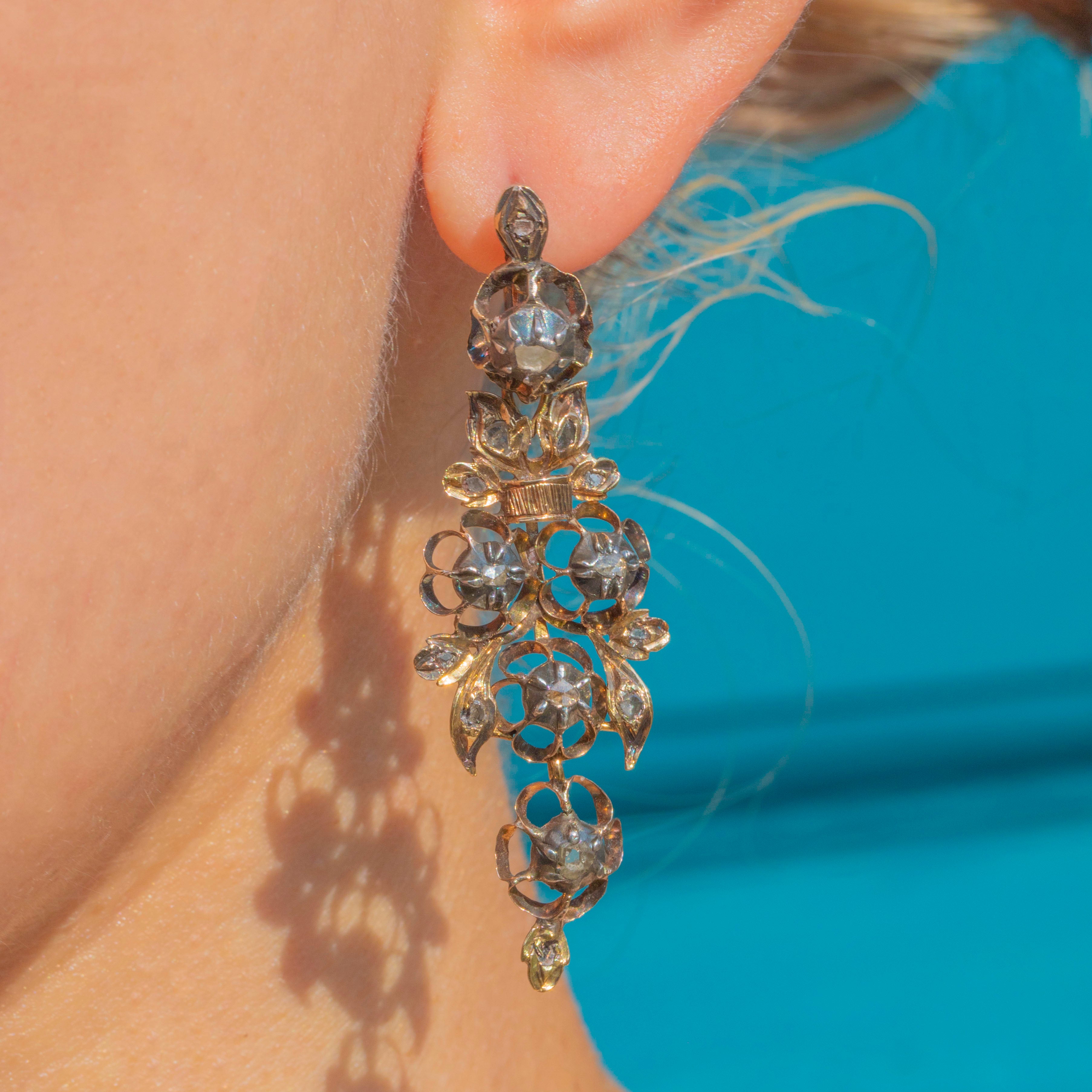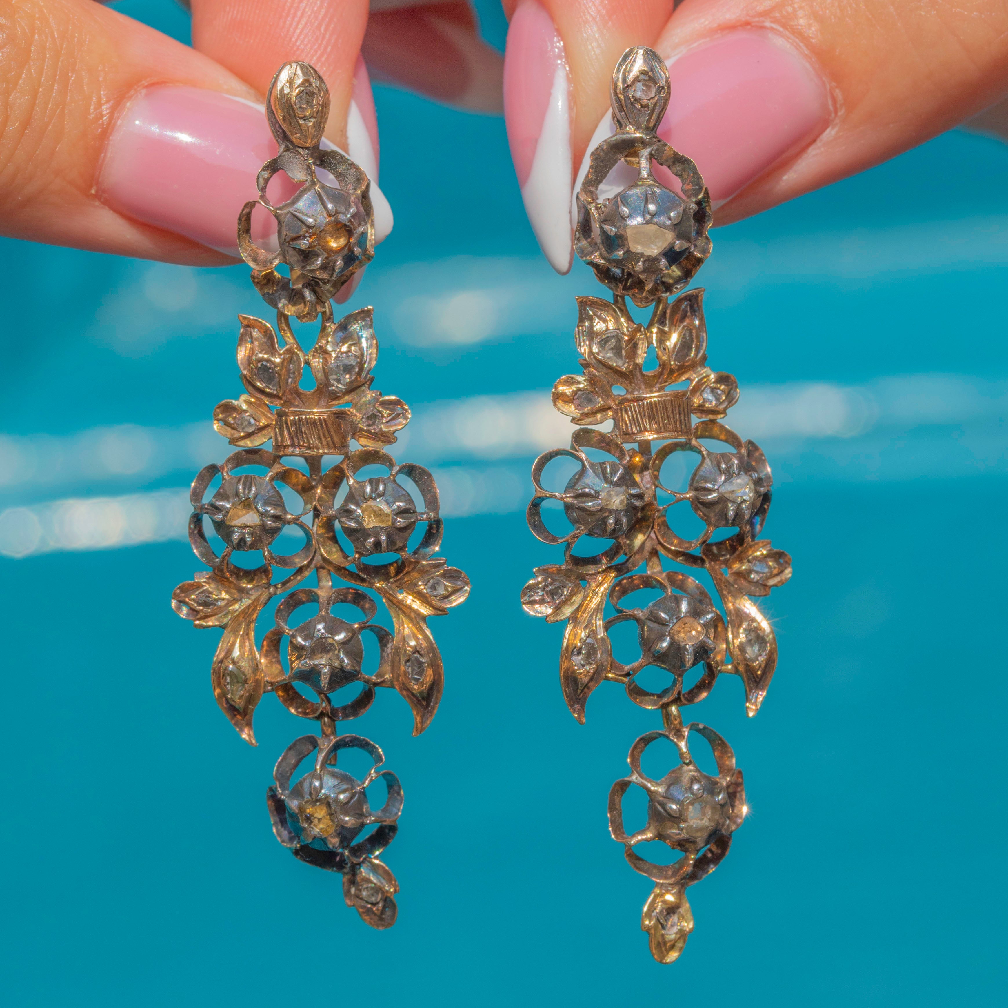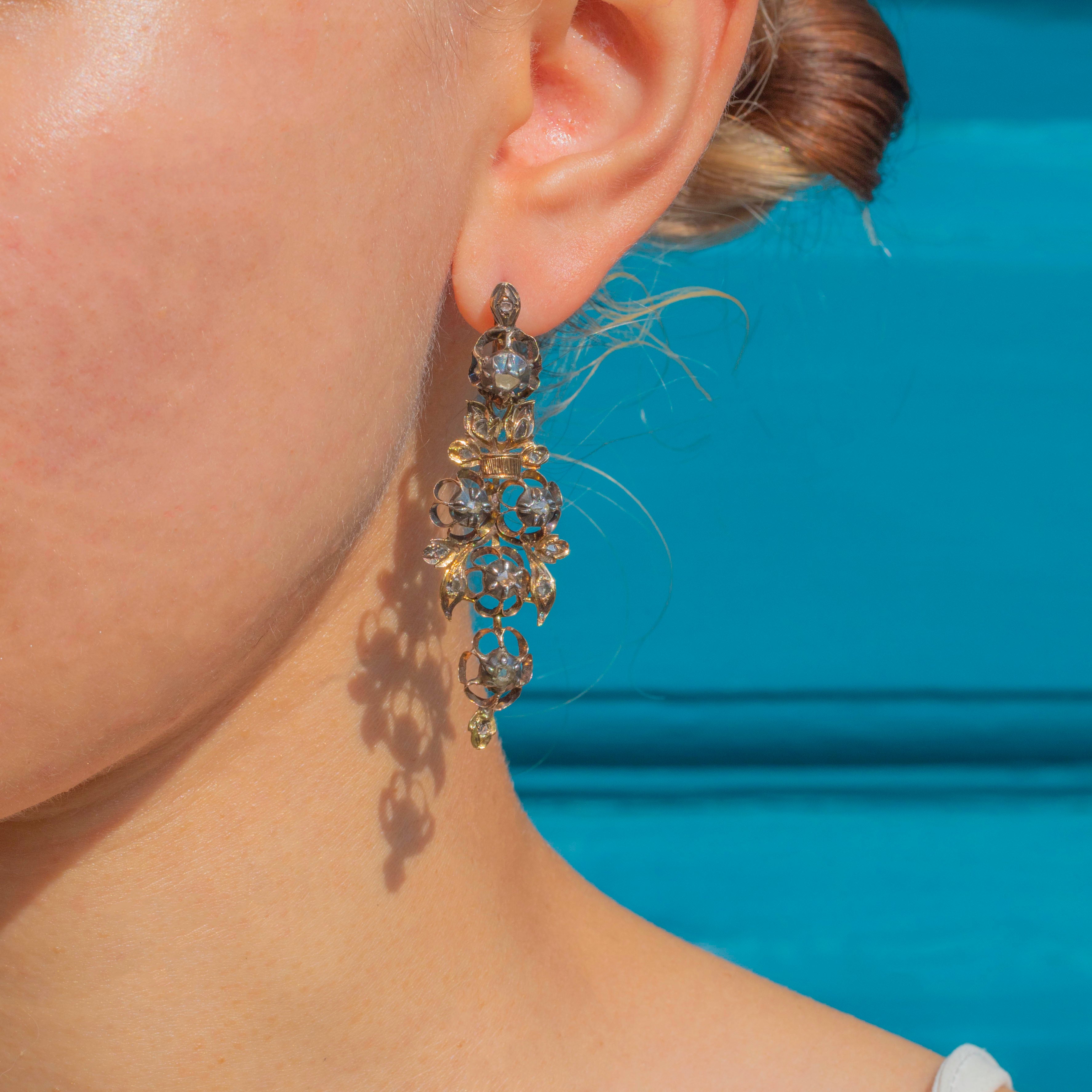 Likely of Catalan or Spanish provenance, these drop earrings are intricately decorated with floral motifs and ornate details, providing a rich texture and depth. The detachable day & night design allows the wearer to transform the earrings from a sophisticated daytime style to a more glamorous evening look, making them a versatile addition to any jewellery collection!