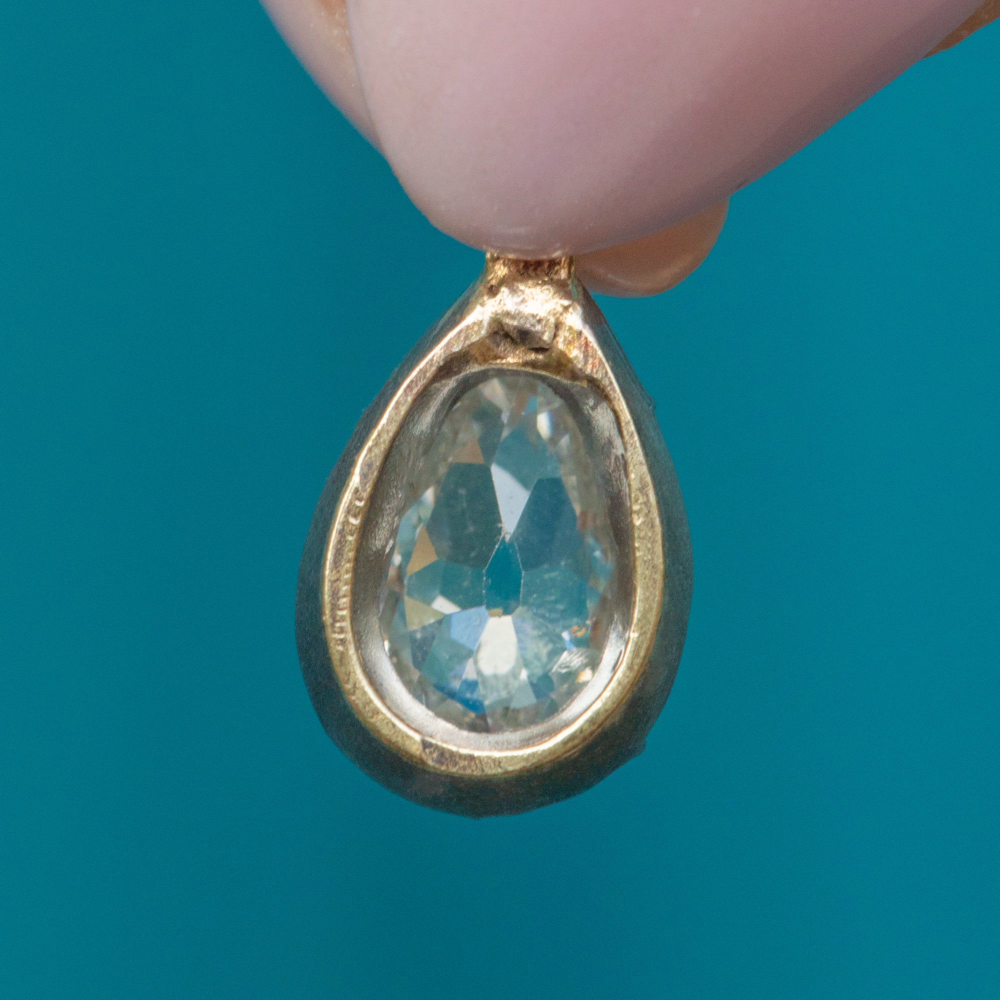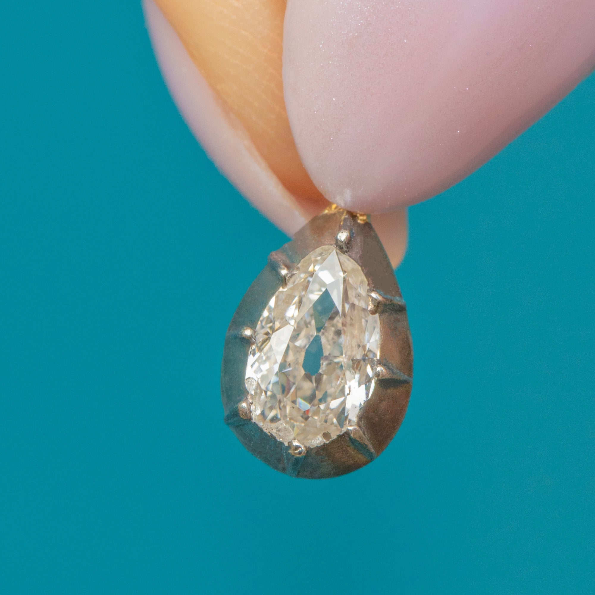 VERY GOOD-EXCELLENT. This Georgian pear-cut Diamond pendant is in excellent condition! The Diamond sits securely within its setting, with a fabulously faceted form and only a small nick on the front of the Diamond, which is only noticeable under the inspection of a jeweller's loupe. With a soldered jump-ring, this Georgian pendant can be worn with the utmost confidence!