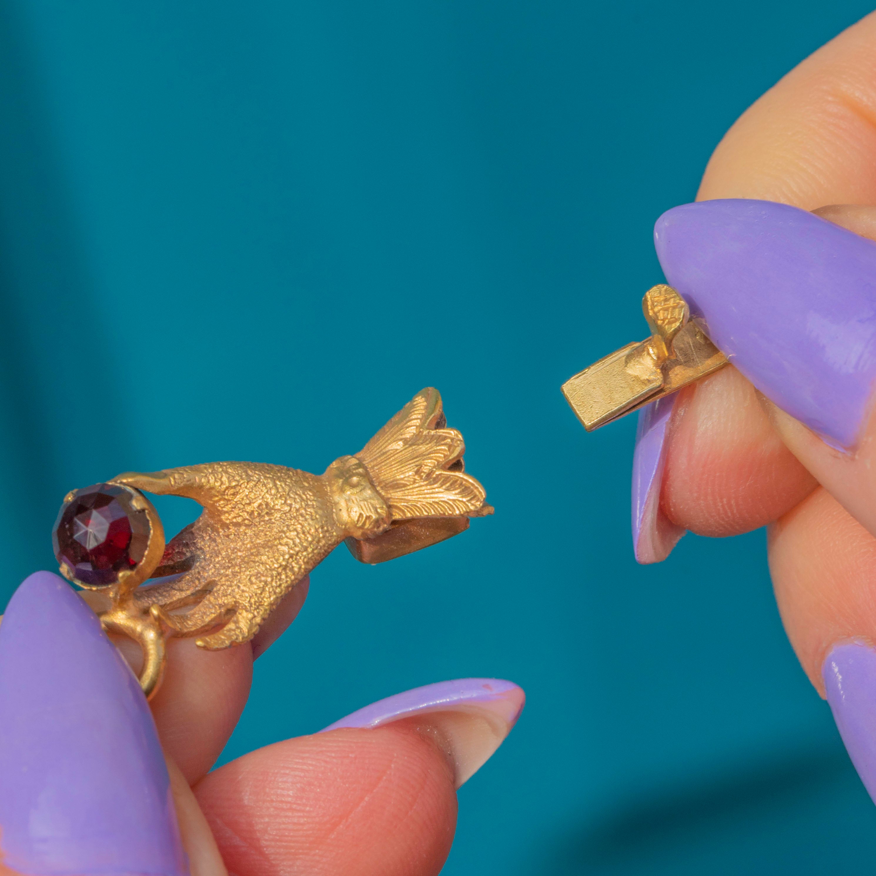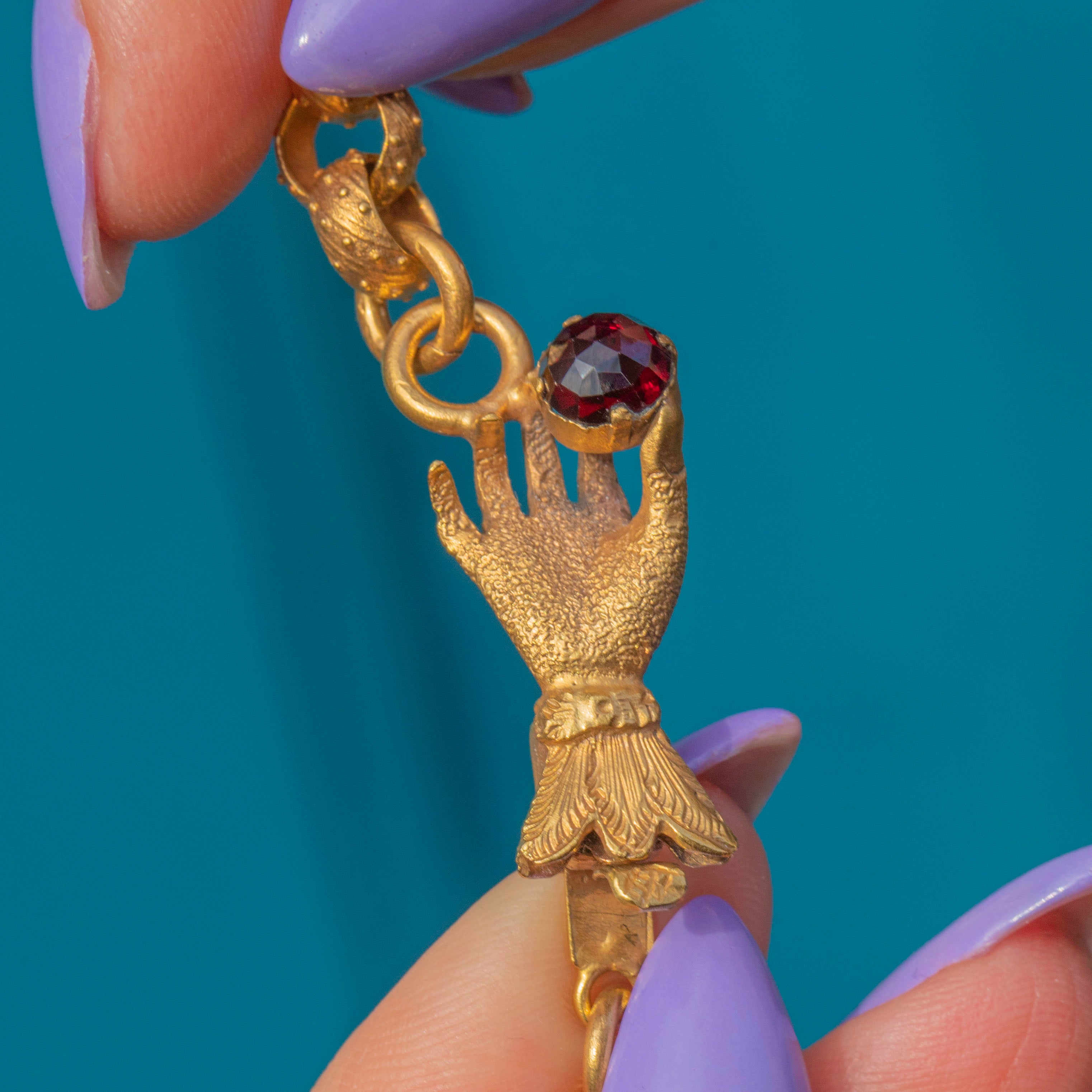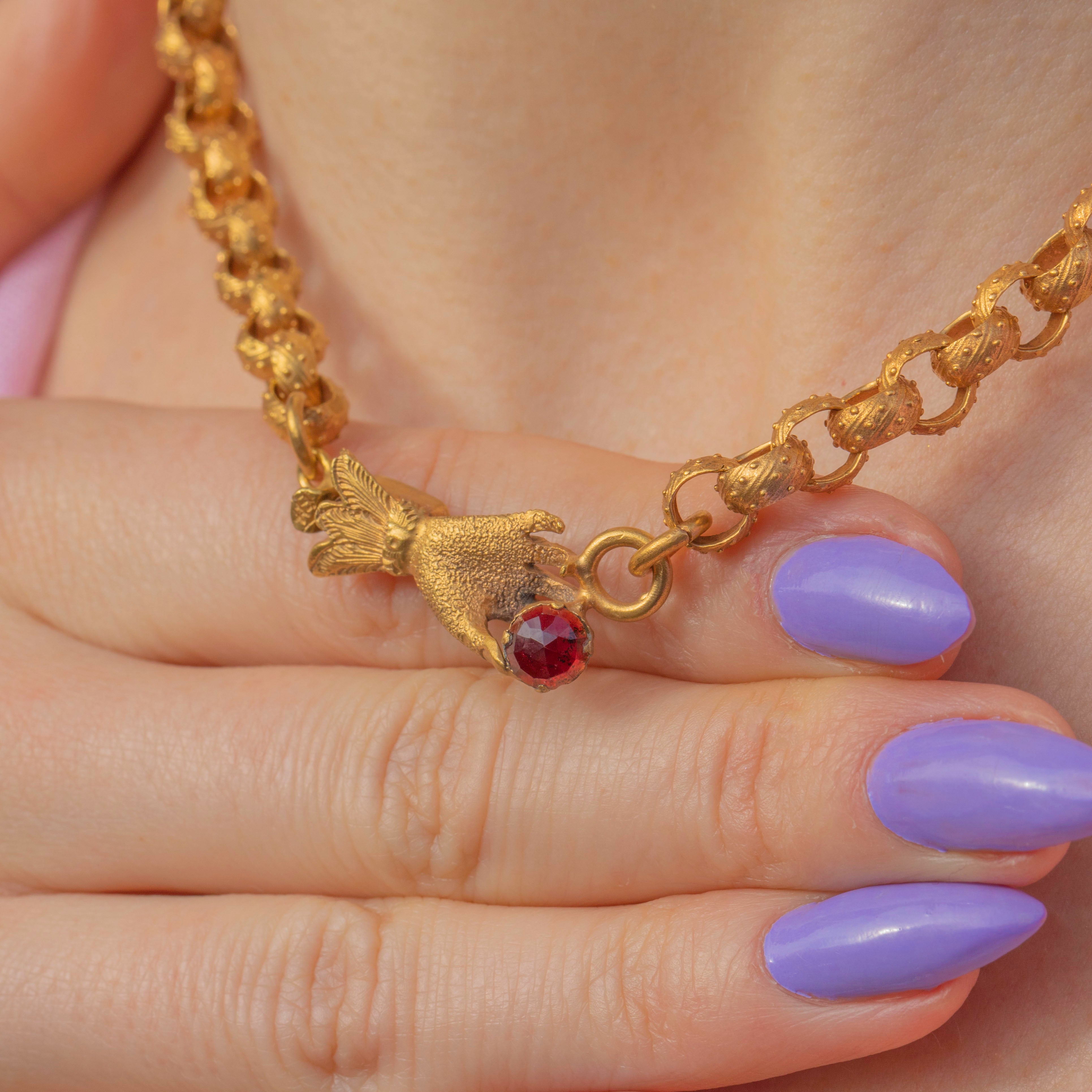 This Georgian Pinchbeck Garnet hand clasp necklace is a delightful dream! The chunky belcher links are secured by a hand-clasp grasping for a deep red Garnet, as if picking a berry from a tree. We simply adore the extravagance and theatrics of the Georgian piece!