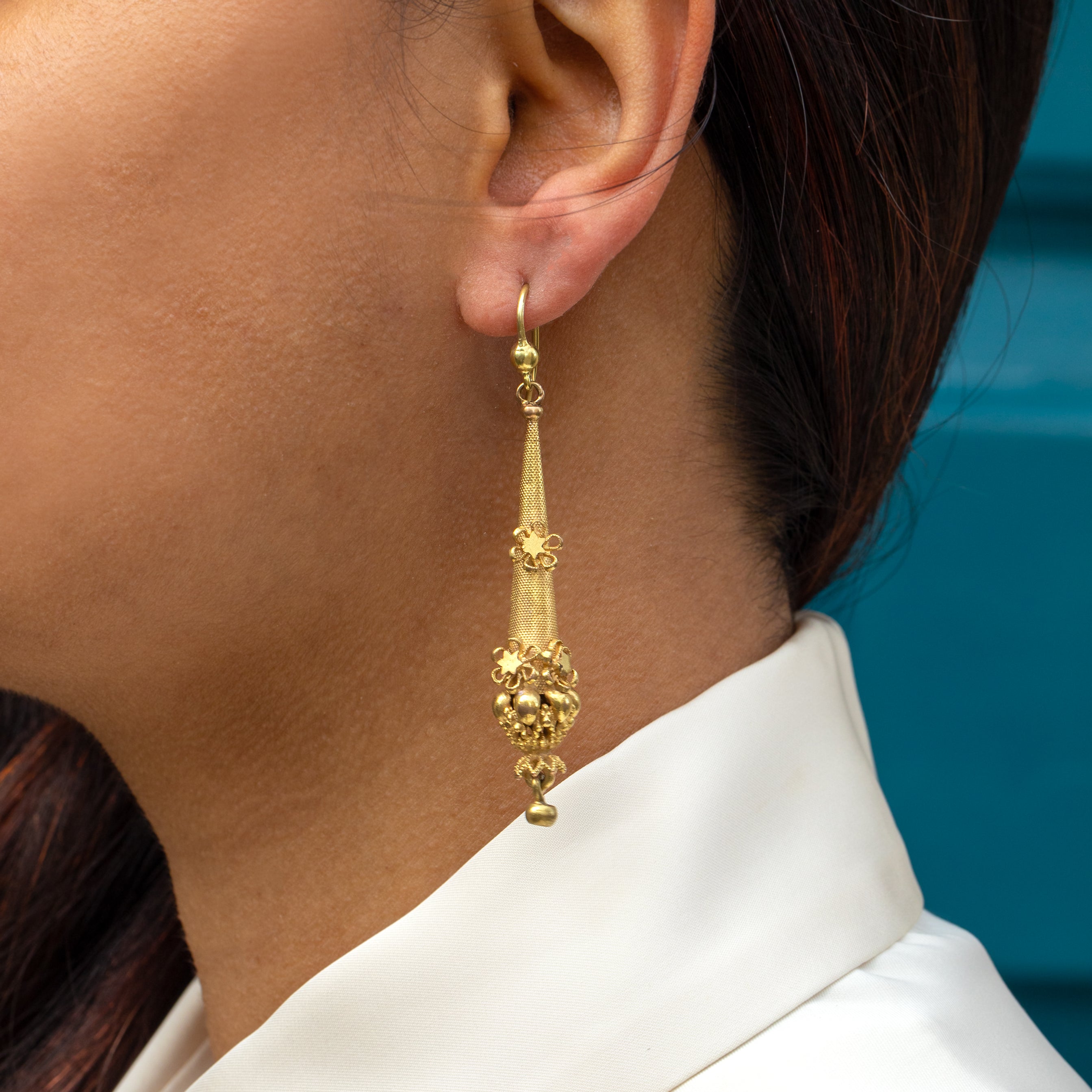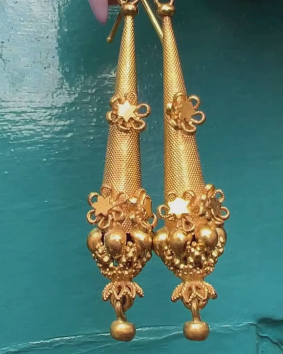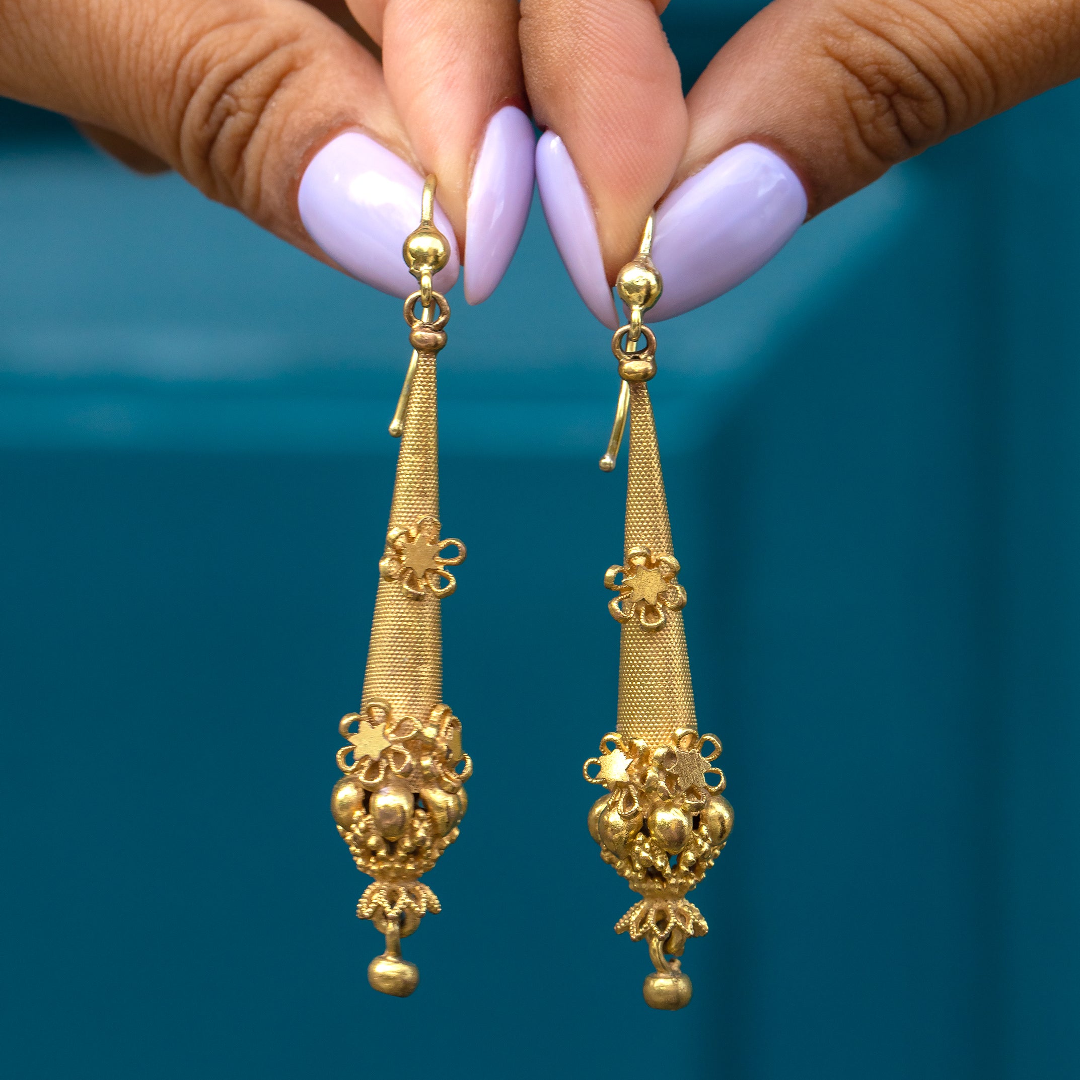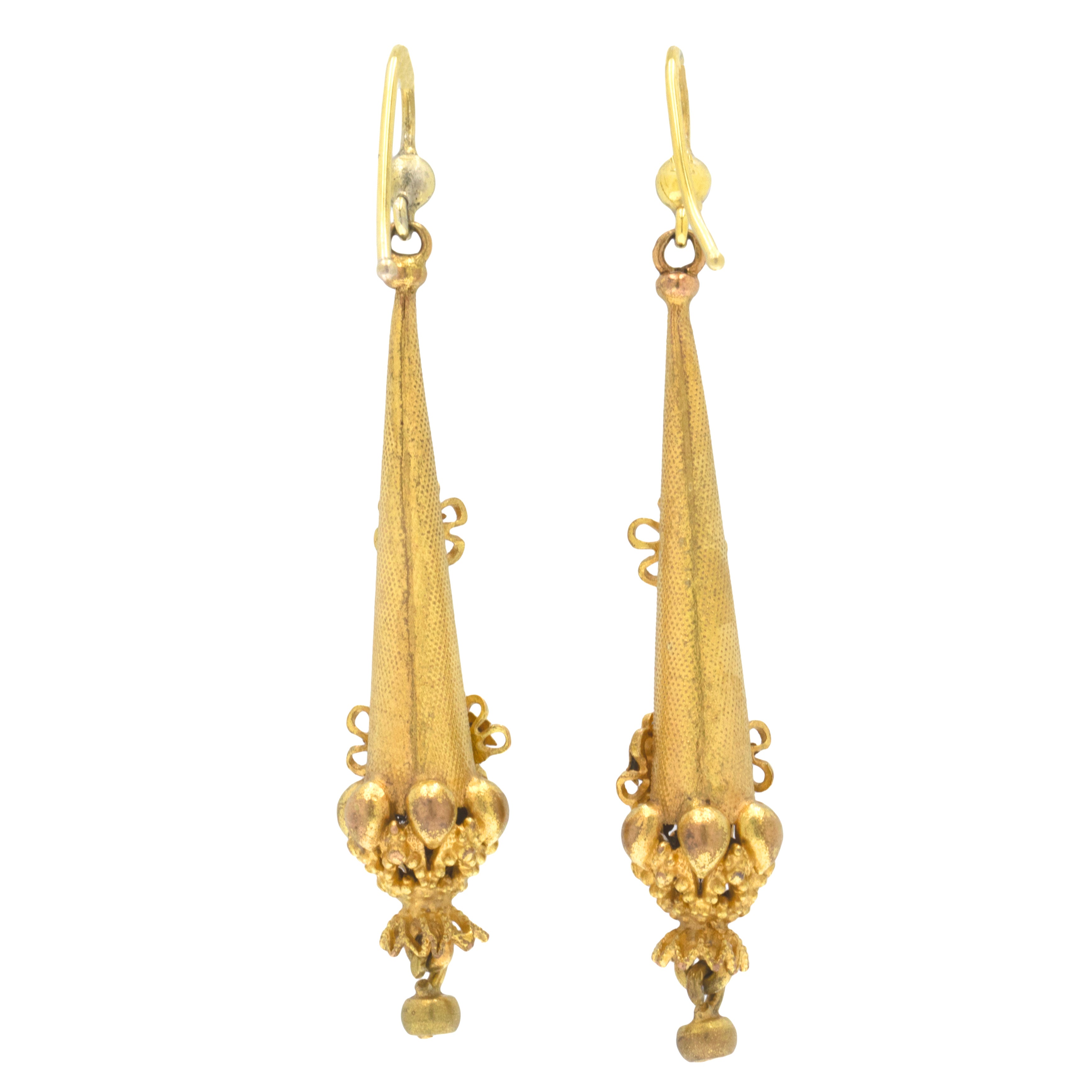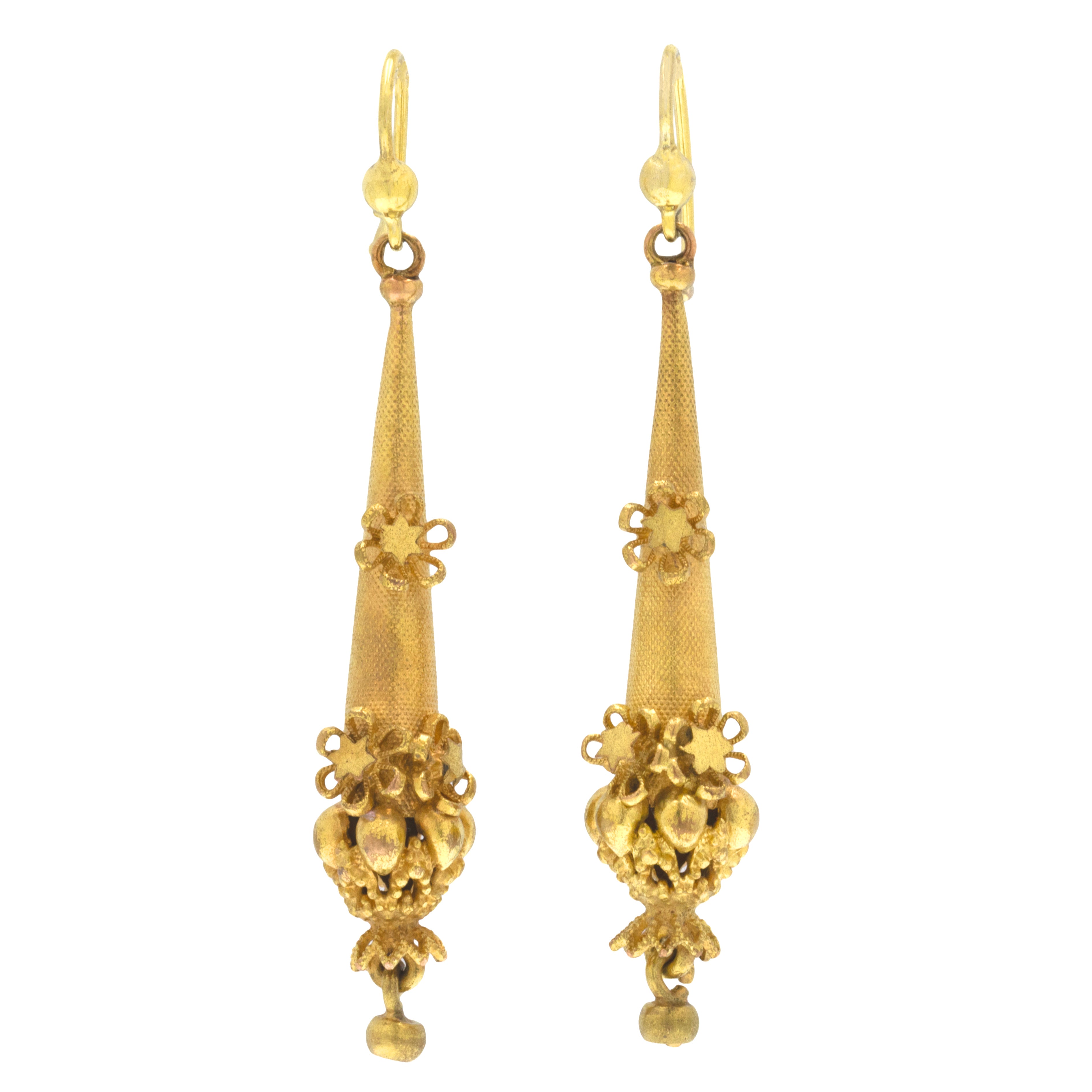 Boucles d'oreilles pendantes longues en Pinchbeck géorgien, crochets en or 18 carats