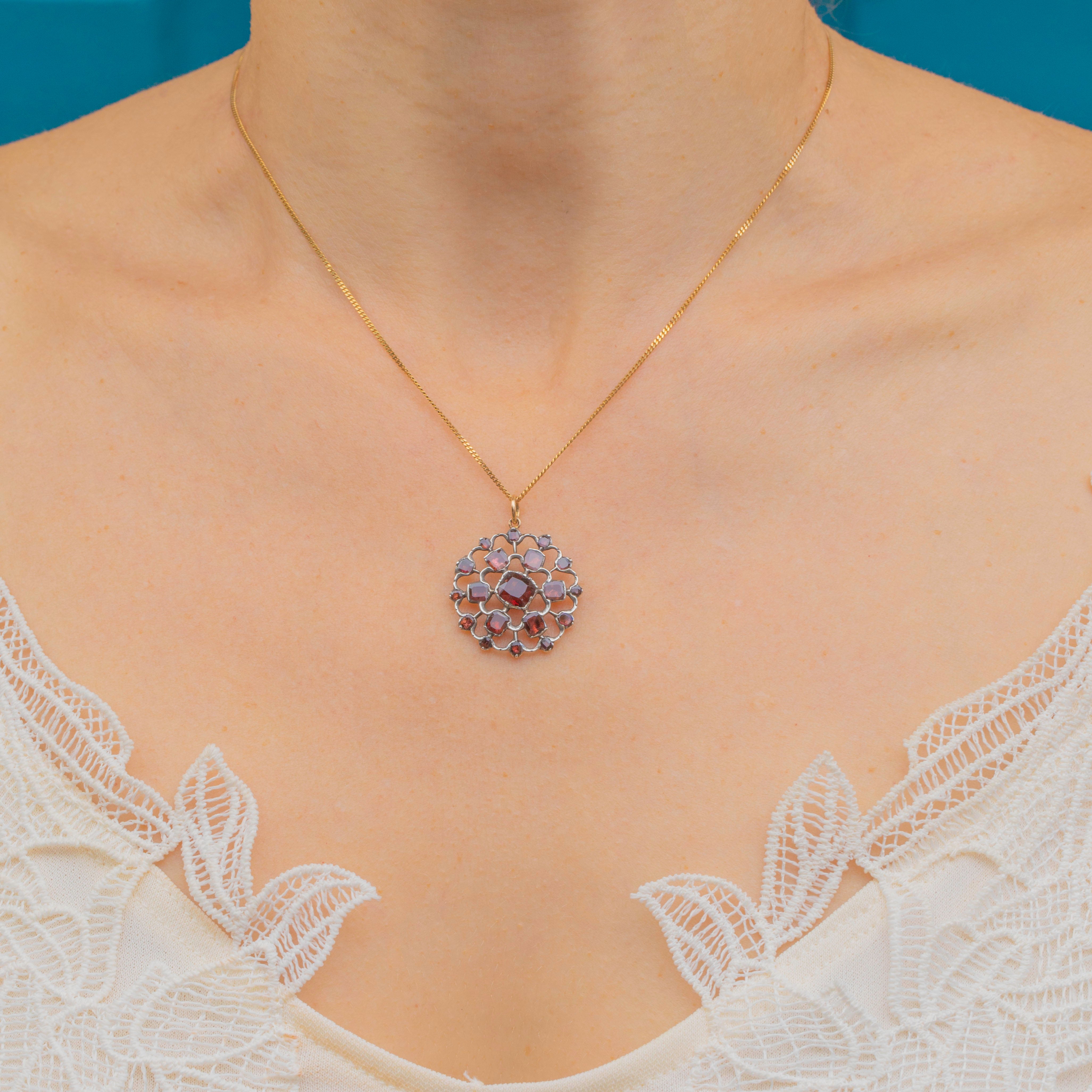 VERY GOOD: The Garnets are all present and securely set, with crisp facets, and have stood the test of time remarkably well. The central Garnet does have a hairline crack, visible under close inspection, but it remains secure within its setting. There is evidence of a conversion on the back, from where it likely used to be part of a larger suite of jewellery, though this is not visible from the front. Complete with a soldered 9ct Gold jump ring, you can wear this early 18th-century pendant with utmost confidence!