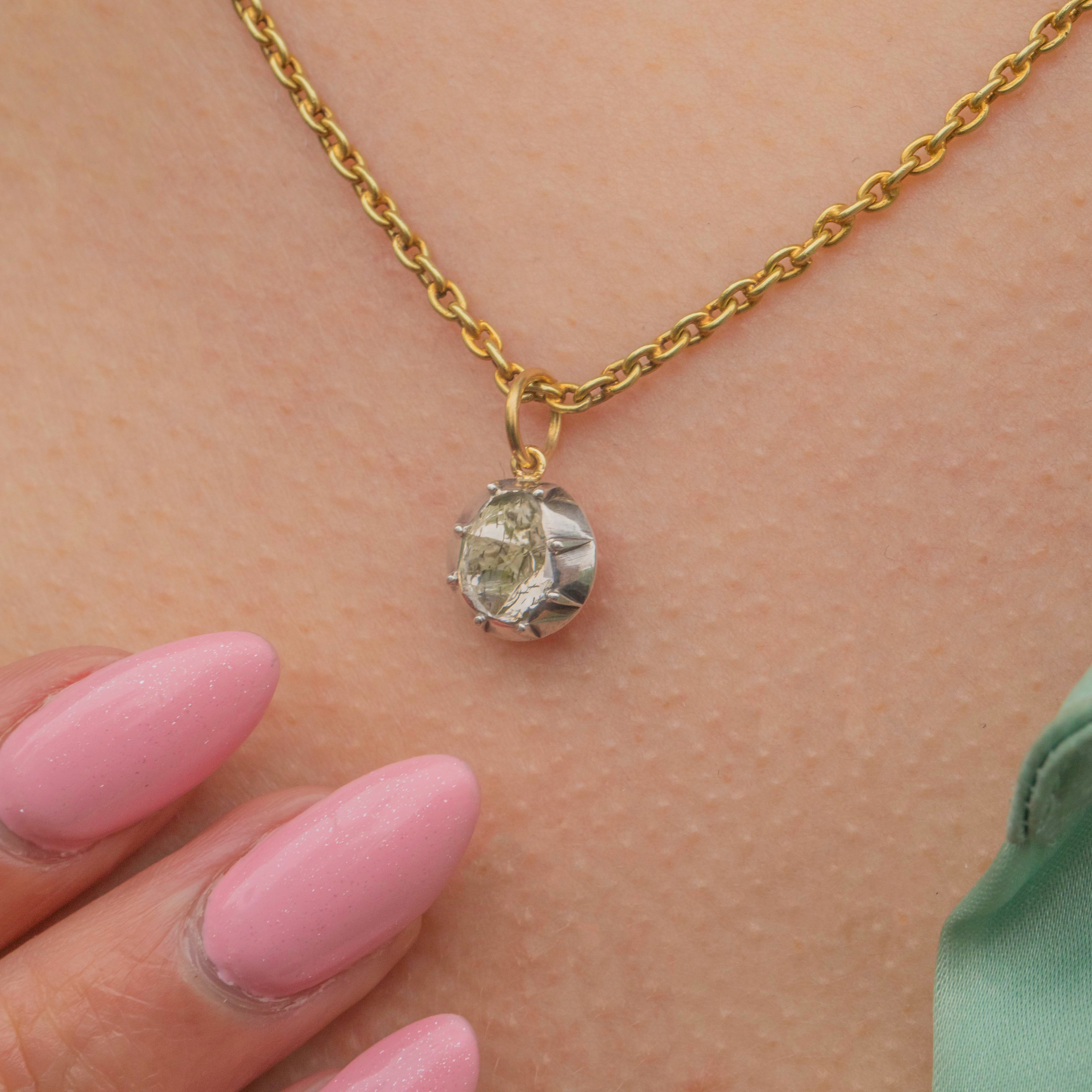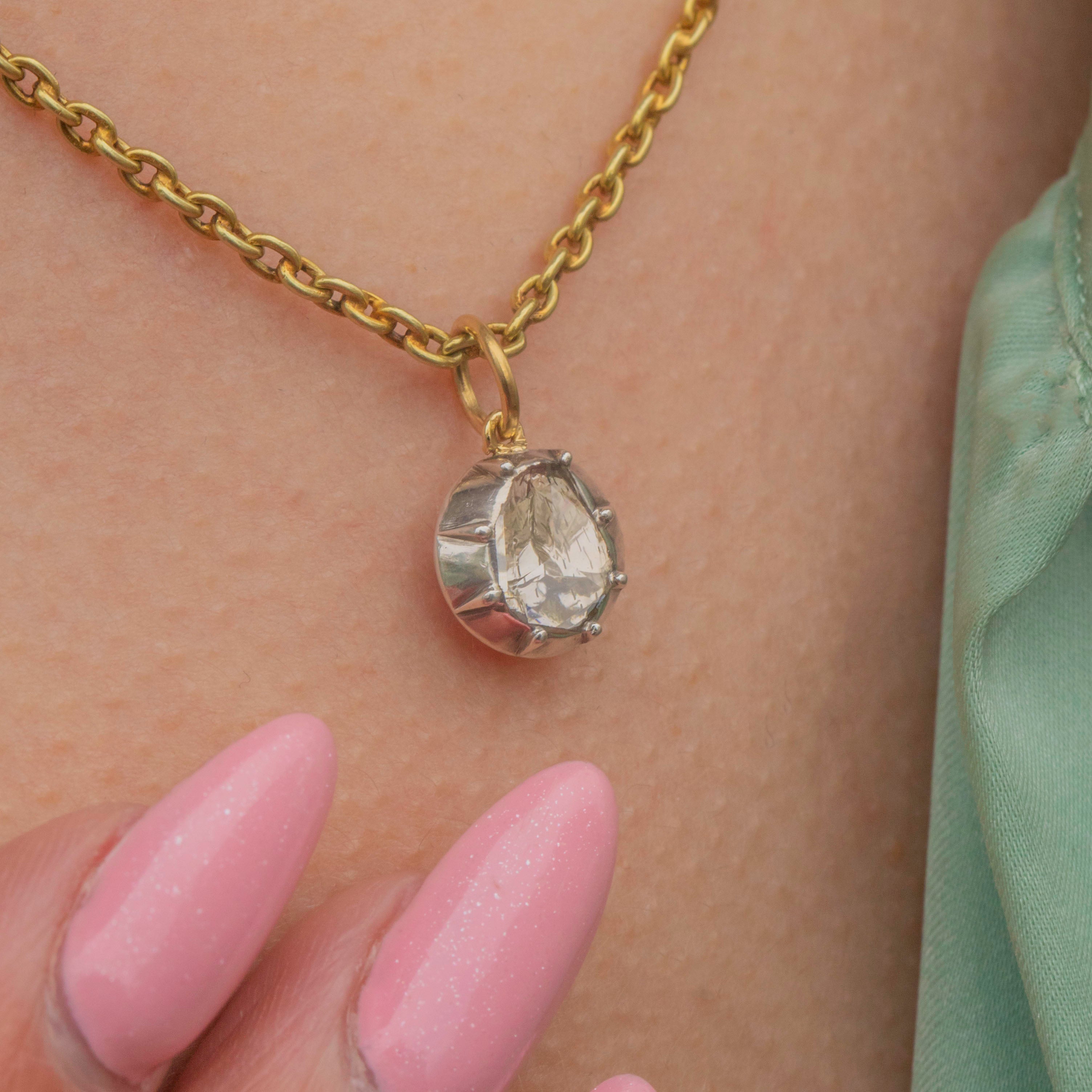 VERY GOOD-EXCELLENT: This Georgian rose-cut Diamond pendant is in lovely condition. The Diamond is radiant, with only very minor surface wear. She is set securely within her Silver settings, which has built up a patina over time, enhancing the Diamond's brilliance. There is some general surface wear throughout, mostly on the back, which can easily be forgiven when considering her grand age. With a secure jump ring, you can wear this Georgian Diamond pendant with confidence!