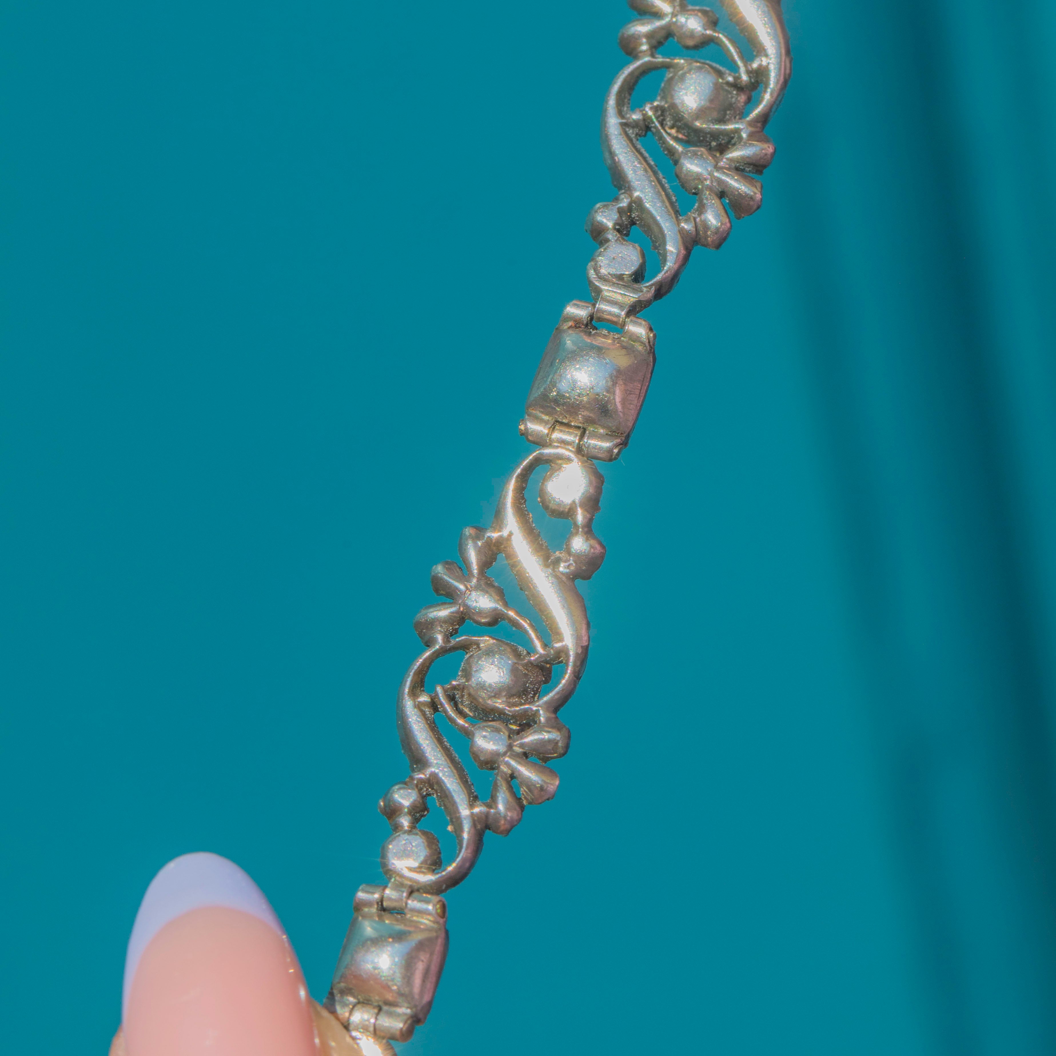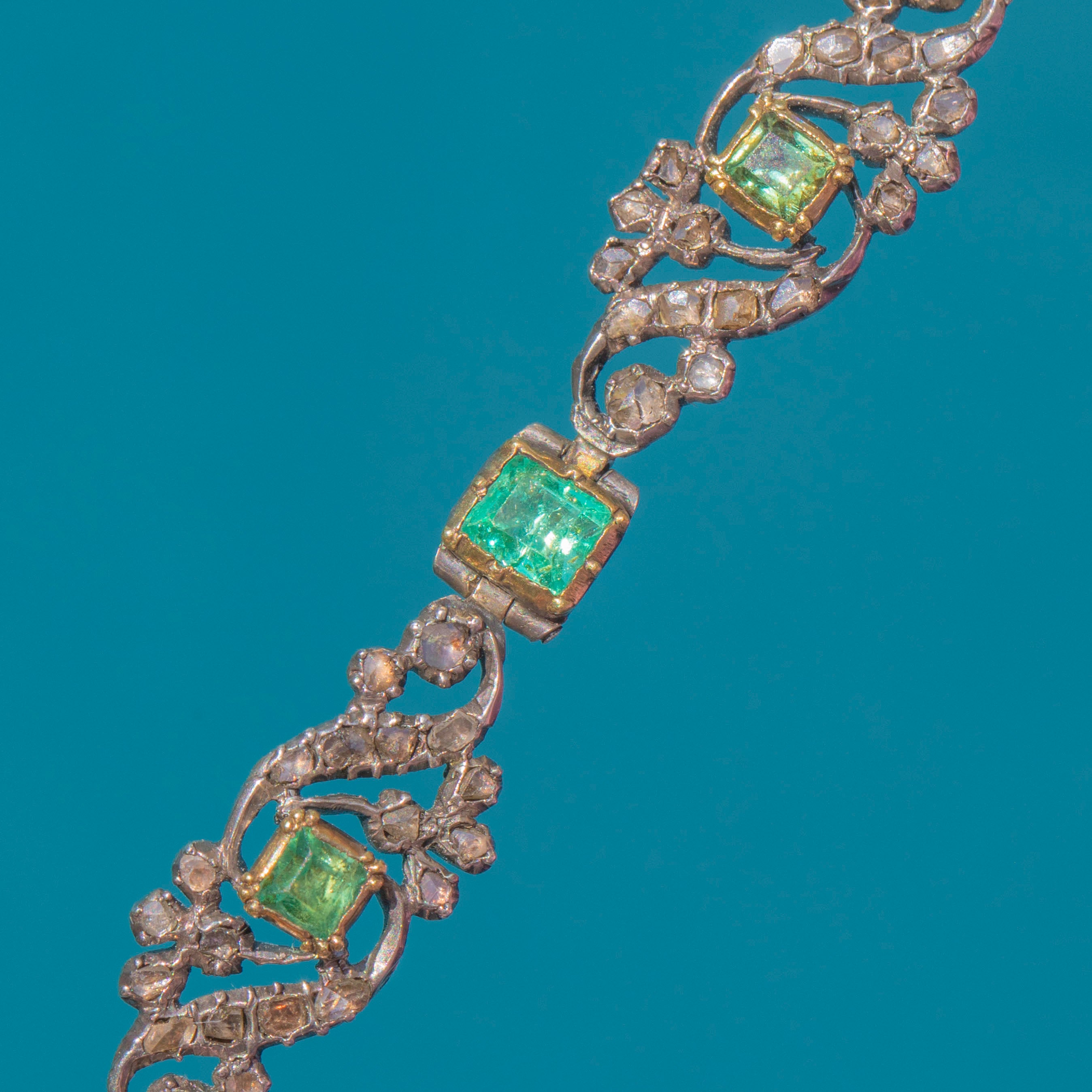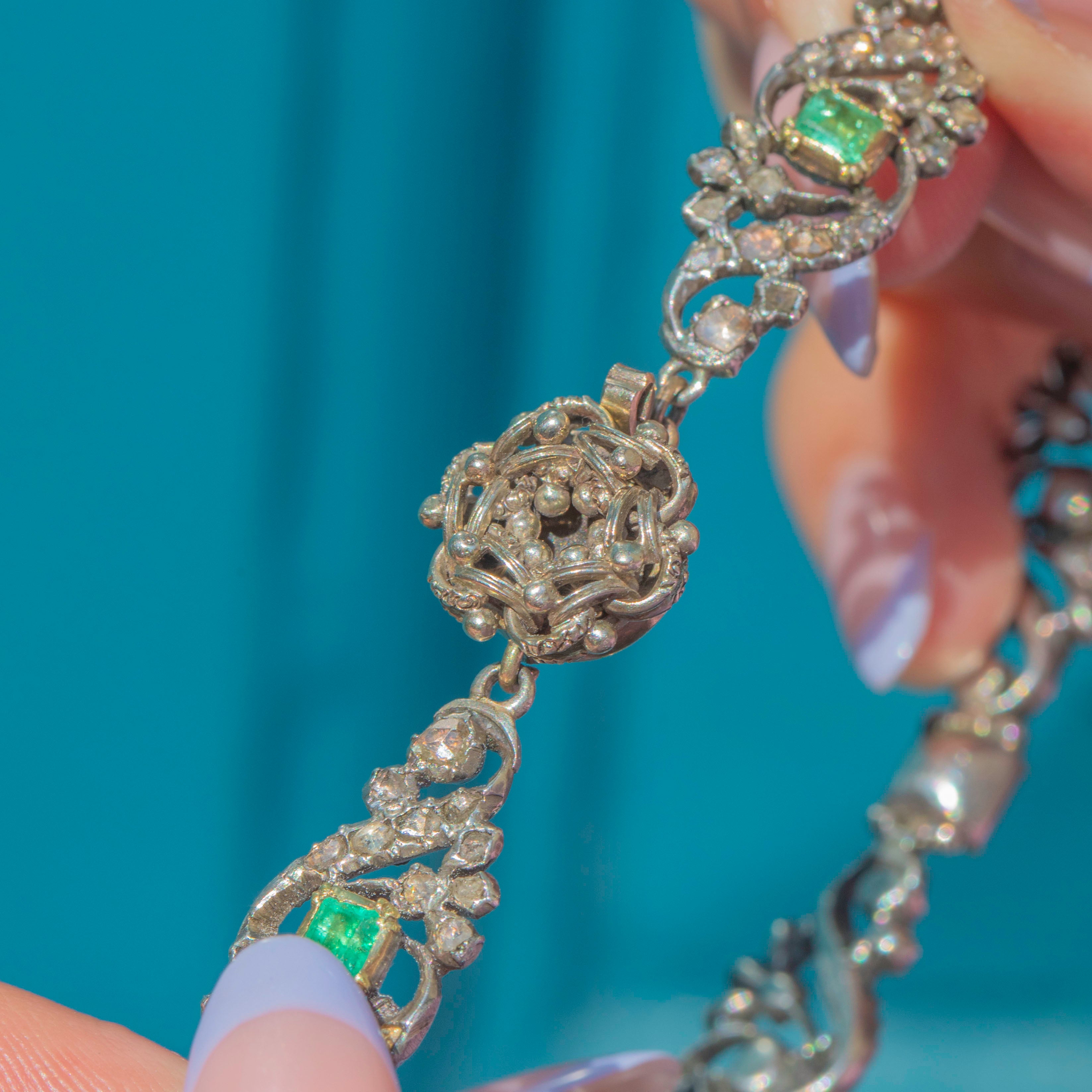 VERY GOOD: This Georgian Silver Emerald and Diamond floral bracelet is in very good condition. She has been crafted beautifully and has retained lovely form throughout the years. The gemstones are secure and while some Emeralds are less vibrant than others, each has a beautiful distinct tone. This Georgian bracelet has built up a nice patina, and though there are some signs of wear to the metal - including discolouration to the clasp - she is in perfect working condition meaning you can wear this antique bracelet with confidence.