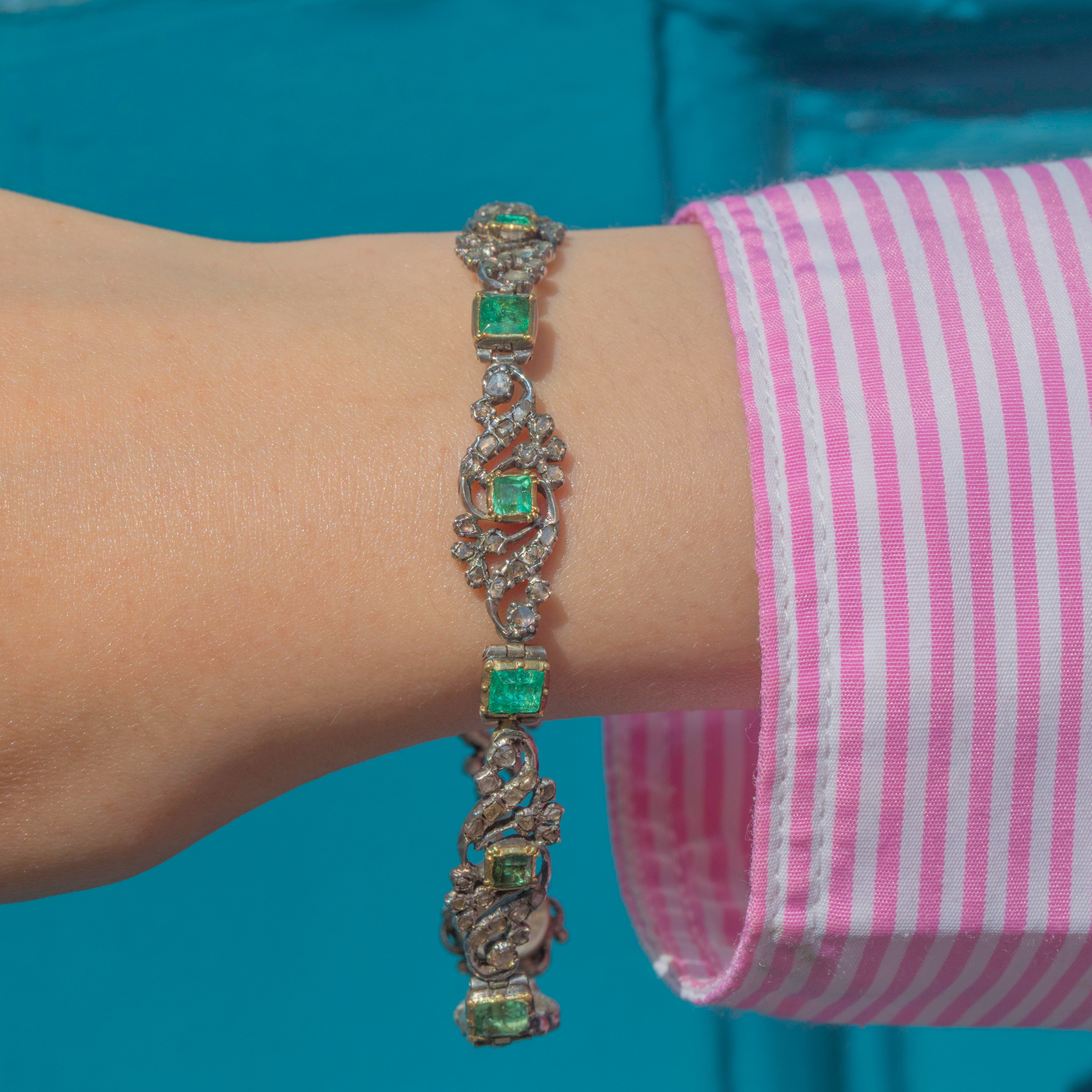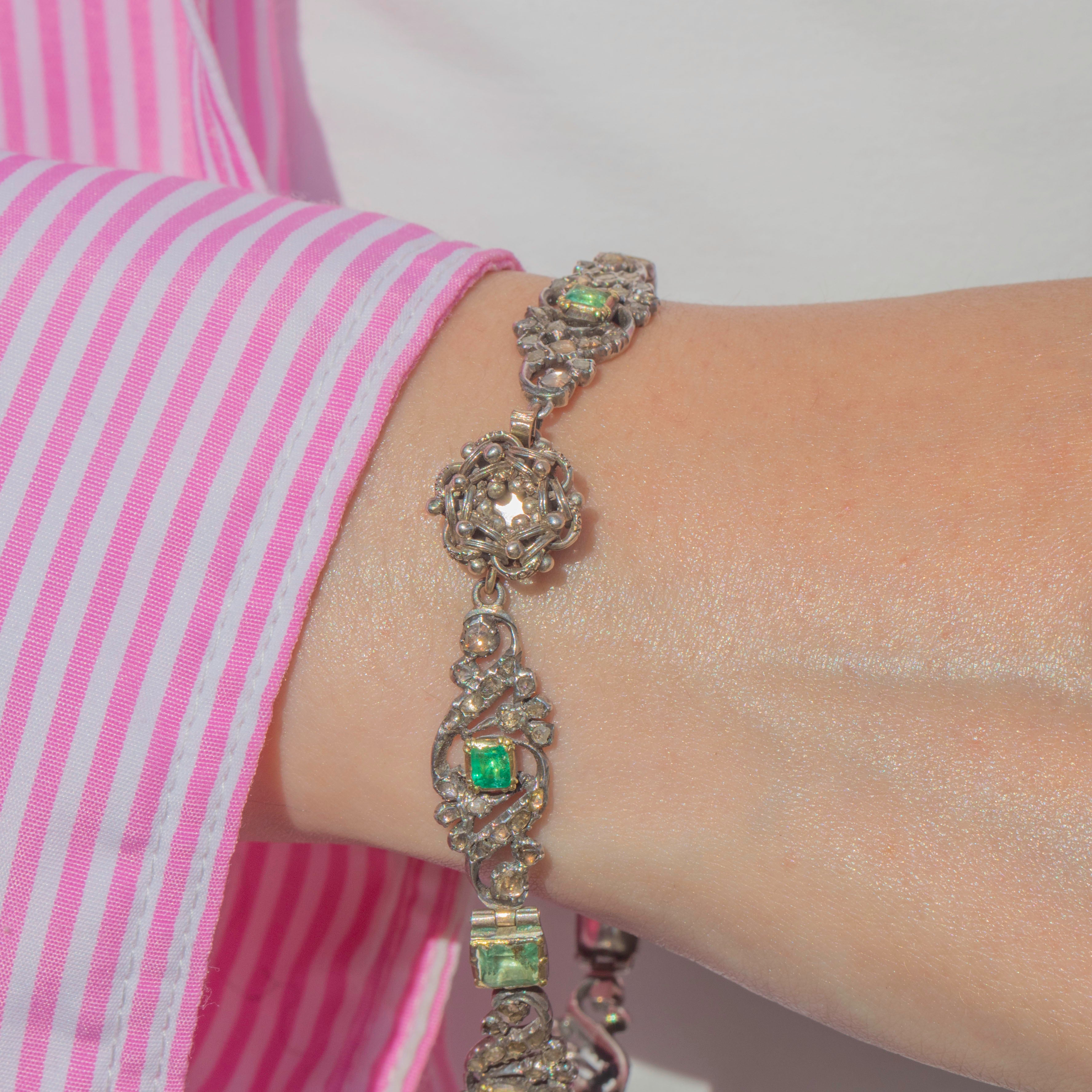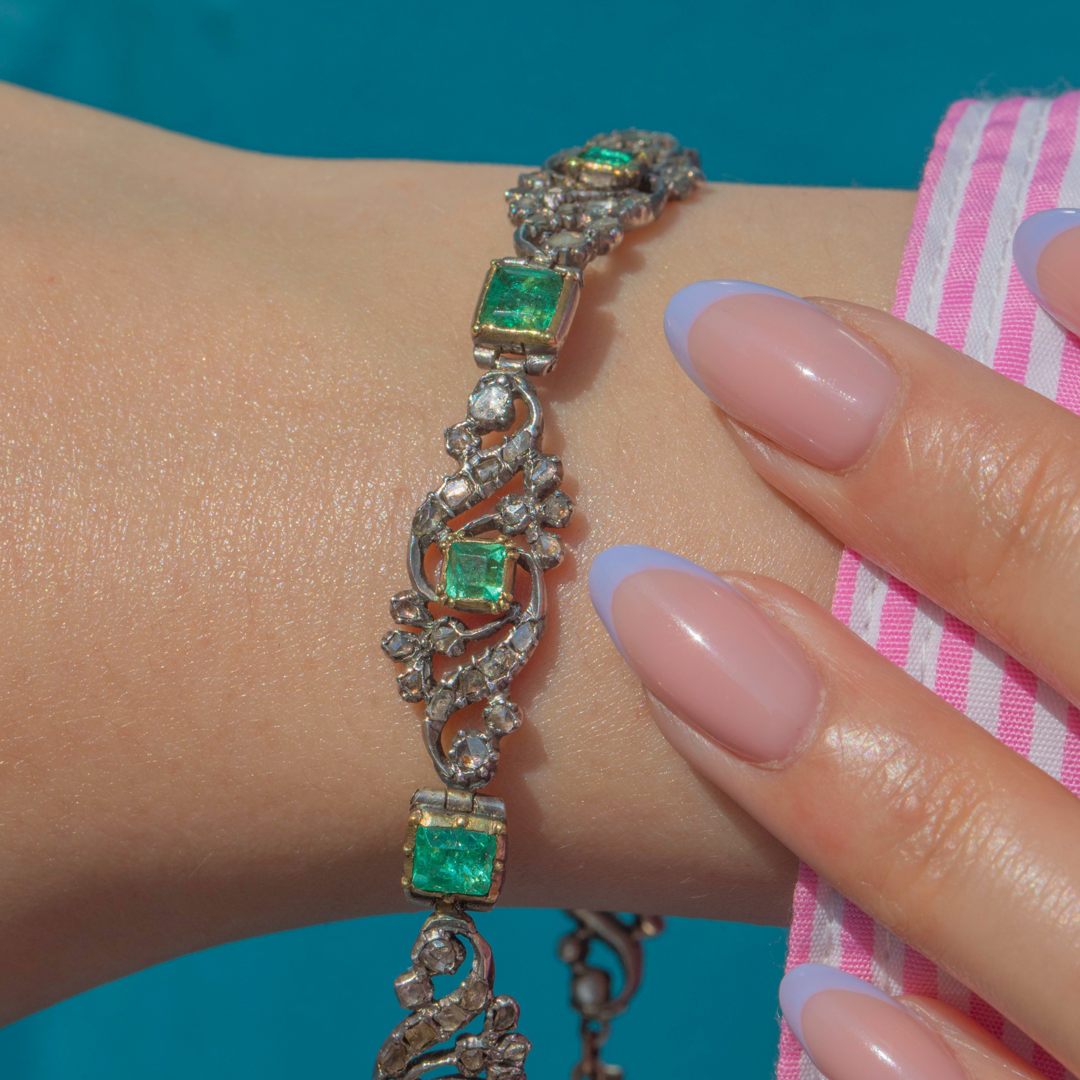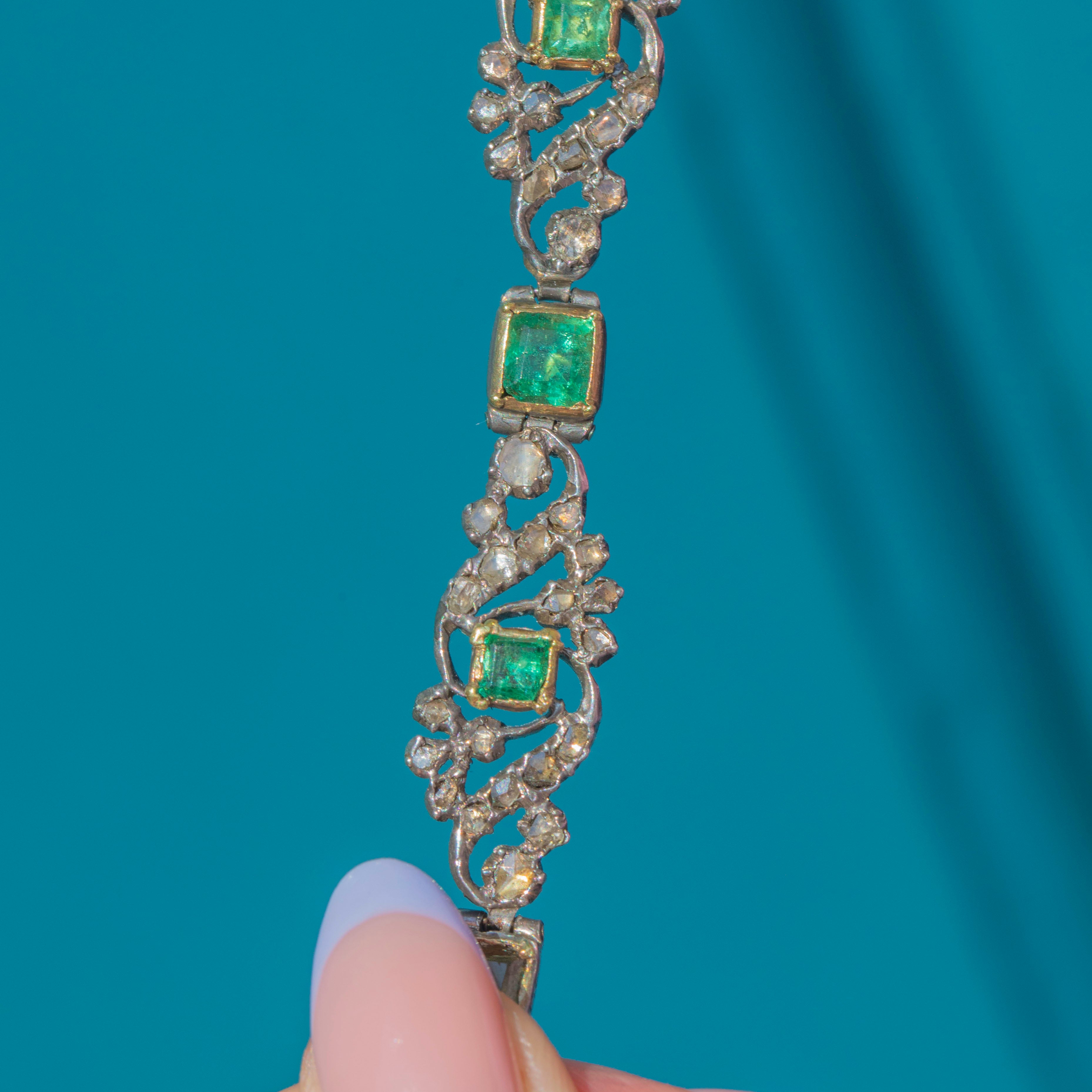 This Georgian Silver Emerald and Diamond floral bracelet is an antique treasure!