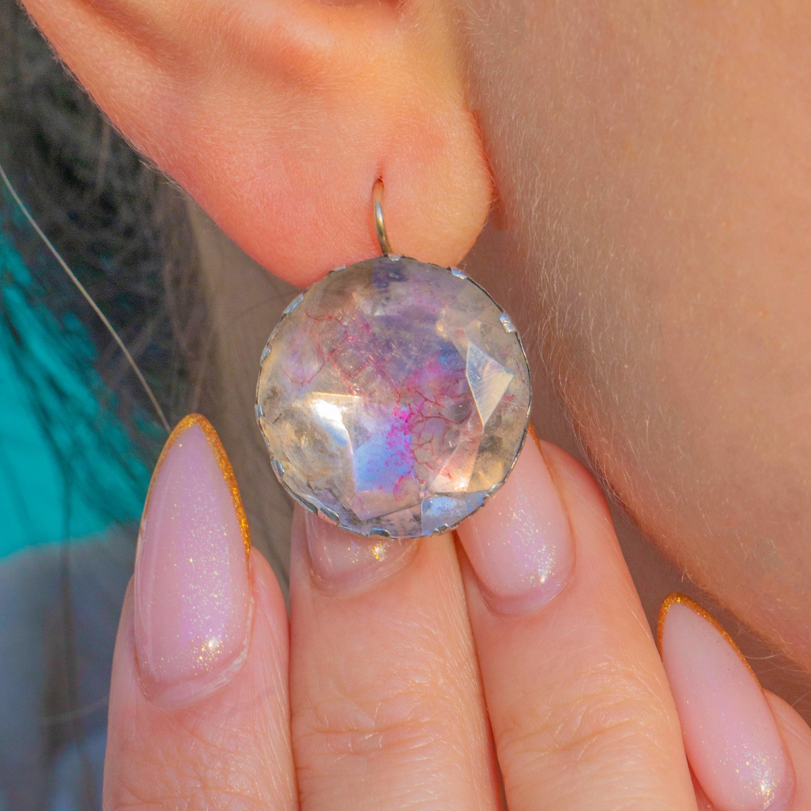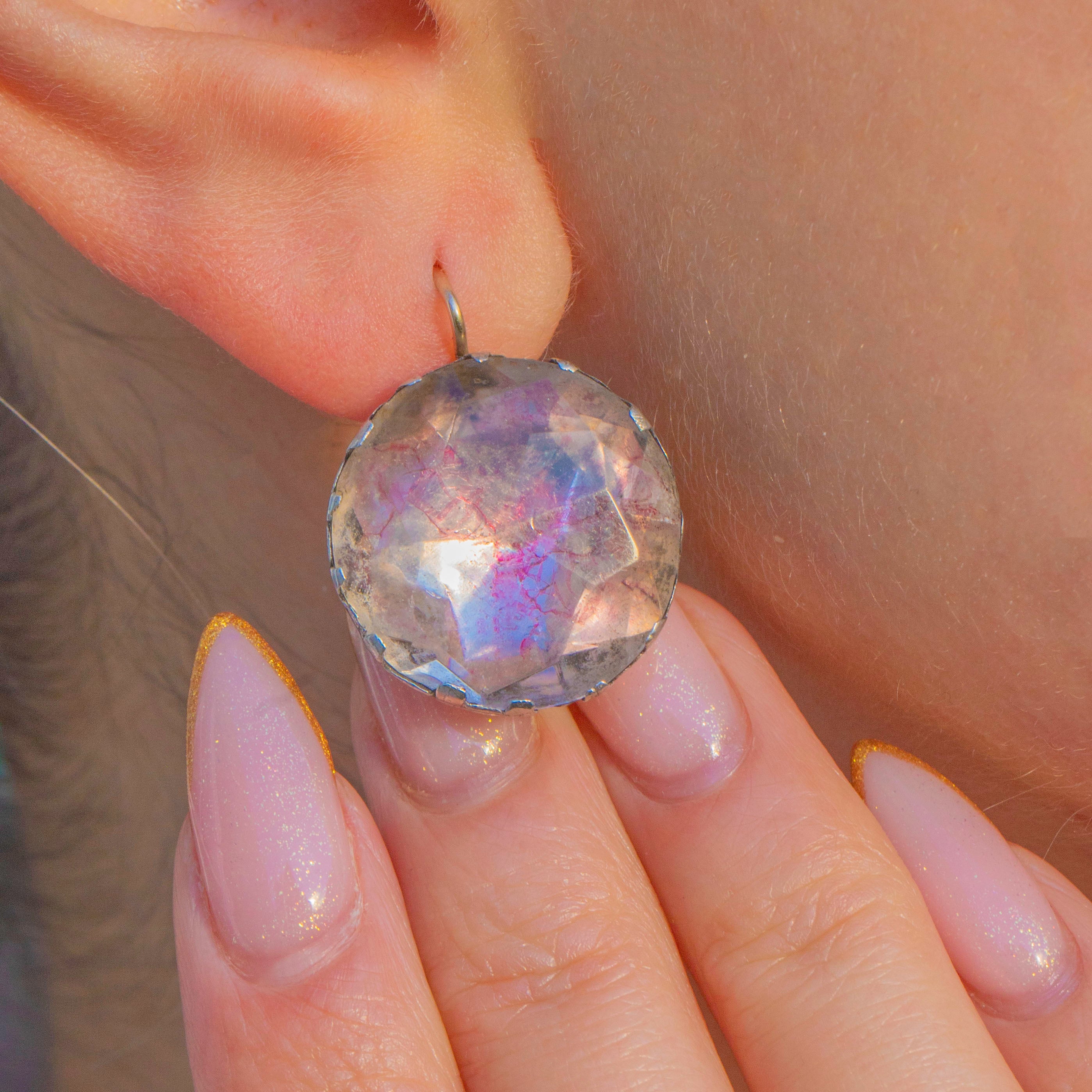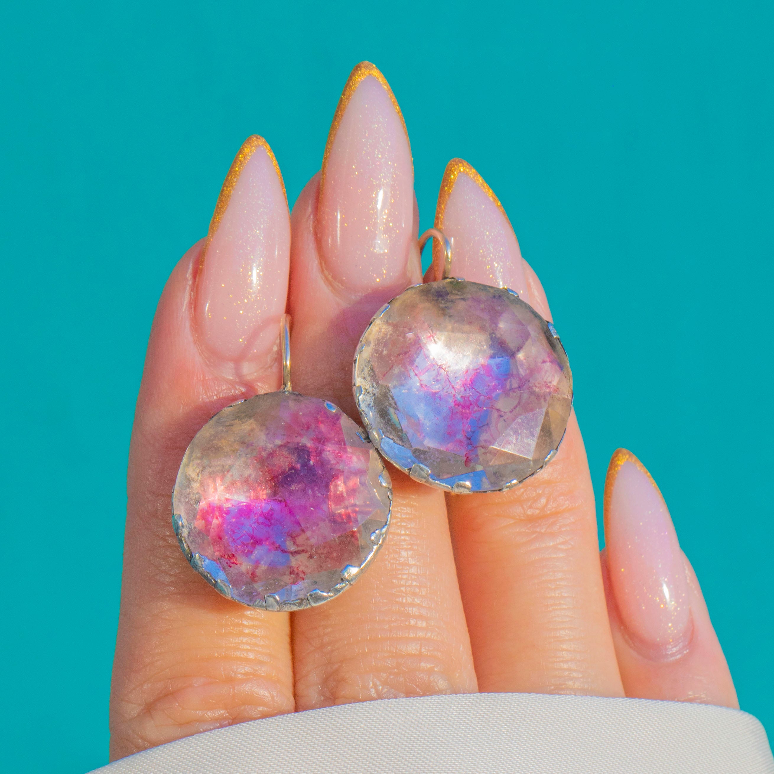 These bold Georgian drop earrings showcase large, foiled Rock Crystals that glow with soft lilac, pink and icy blue flashes when they catch the light!