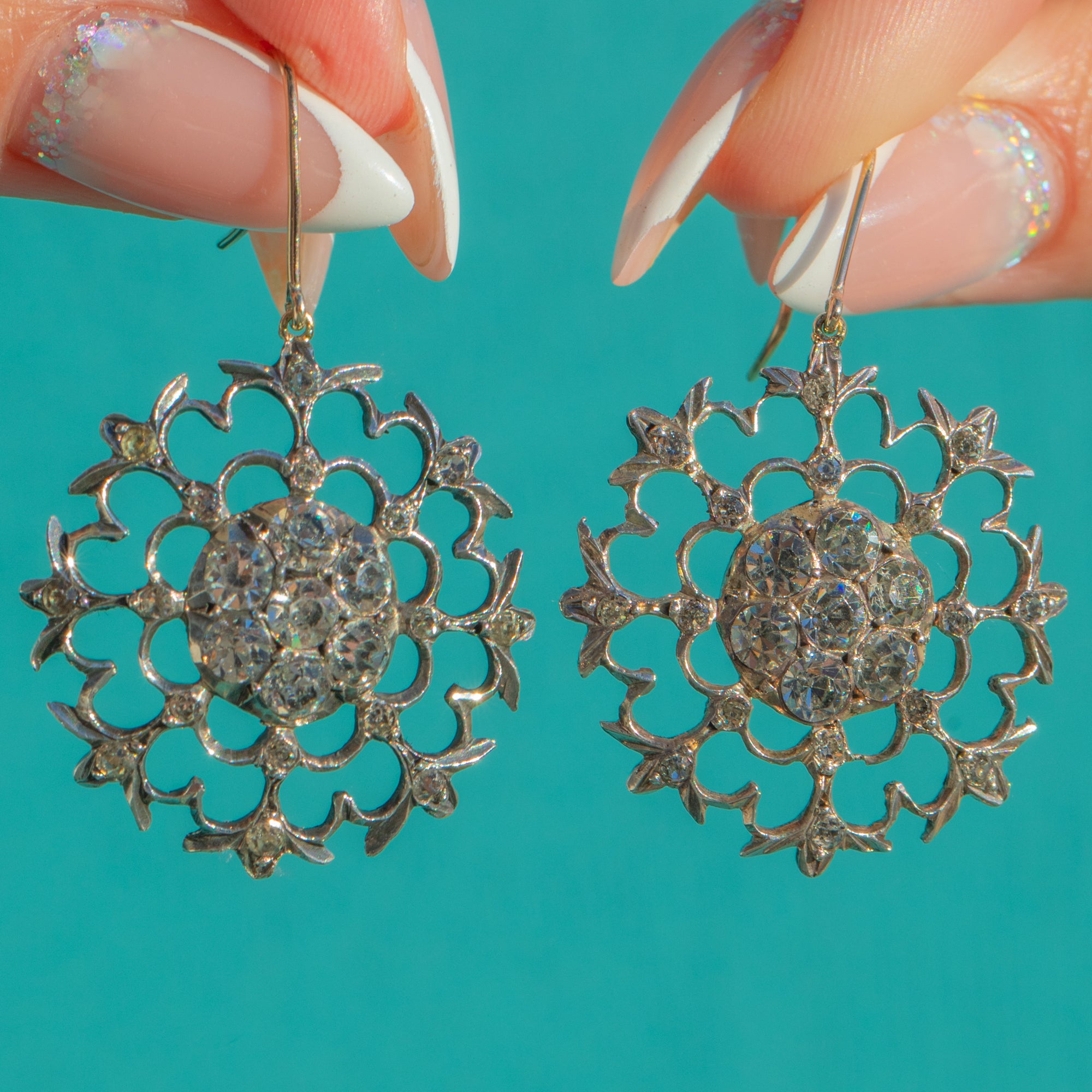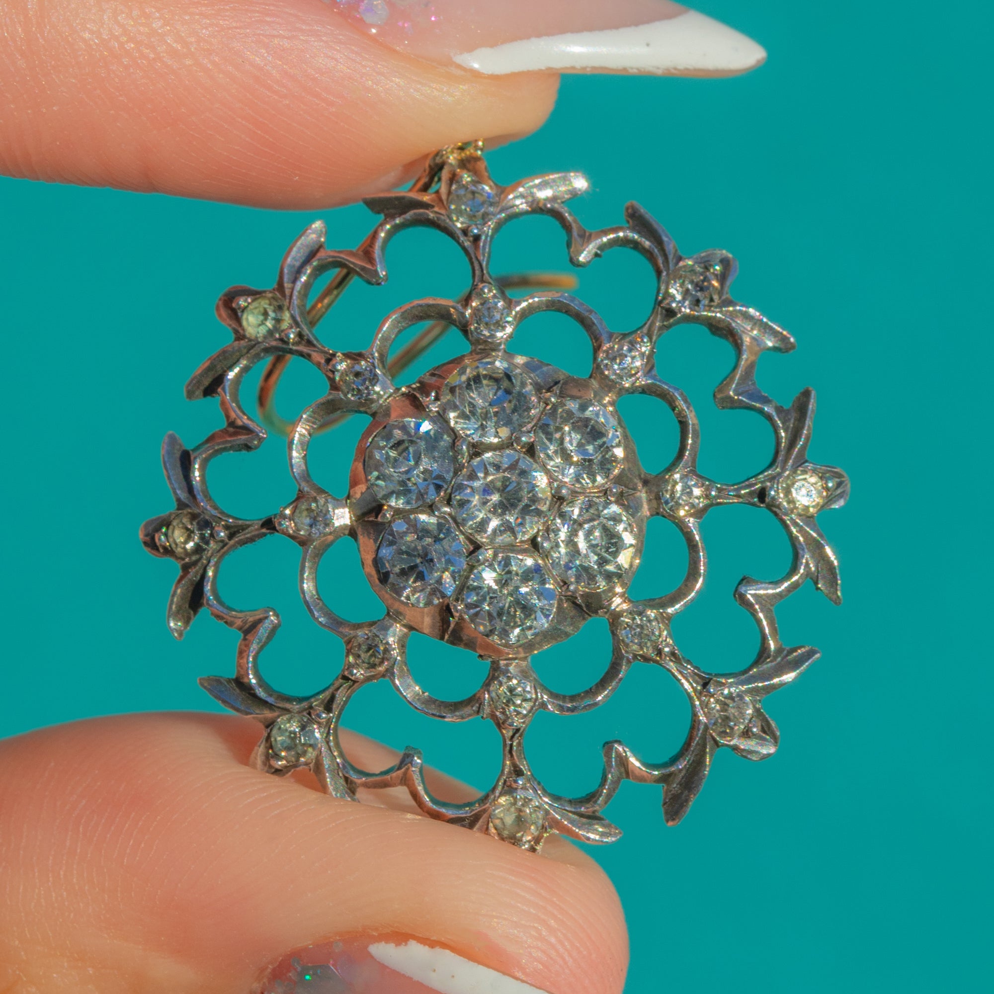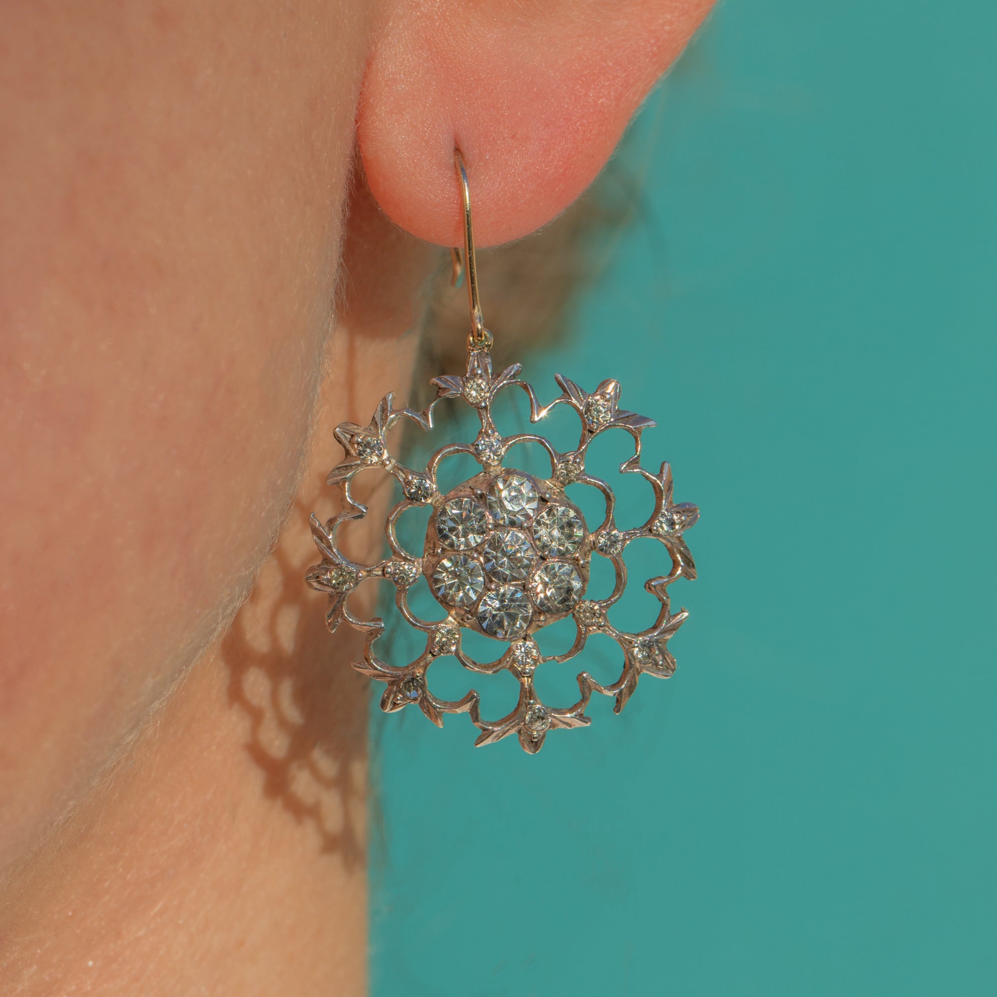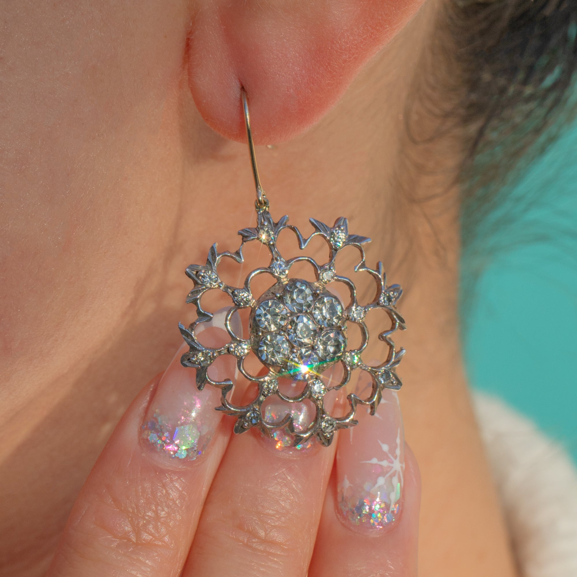 A captivating pair of Georgian Paste flower cluster earrings, crafted in Sterling Silver and finished with 9ct Gold French hooks. The lacy openwork rosettes shimmer with bright white Paste, arranged in a raised central cluster and a halo of petite accents to create a delicate, starburst sparkle.