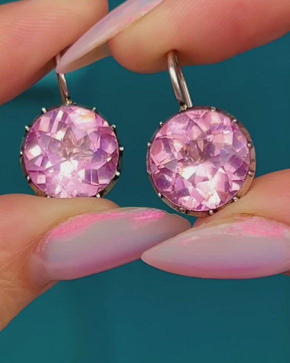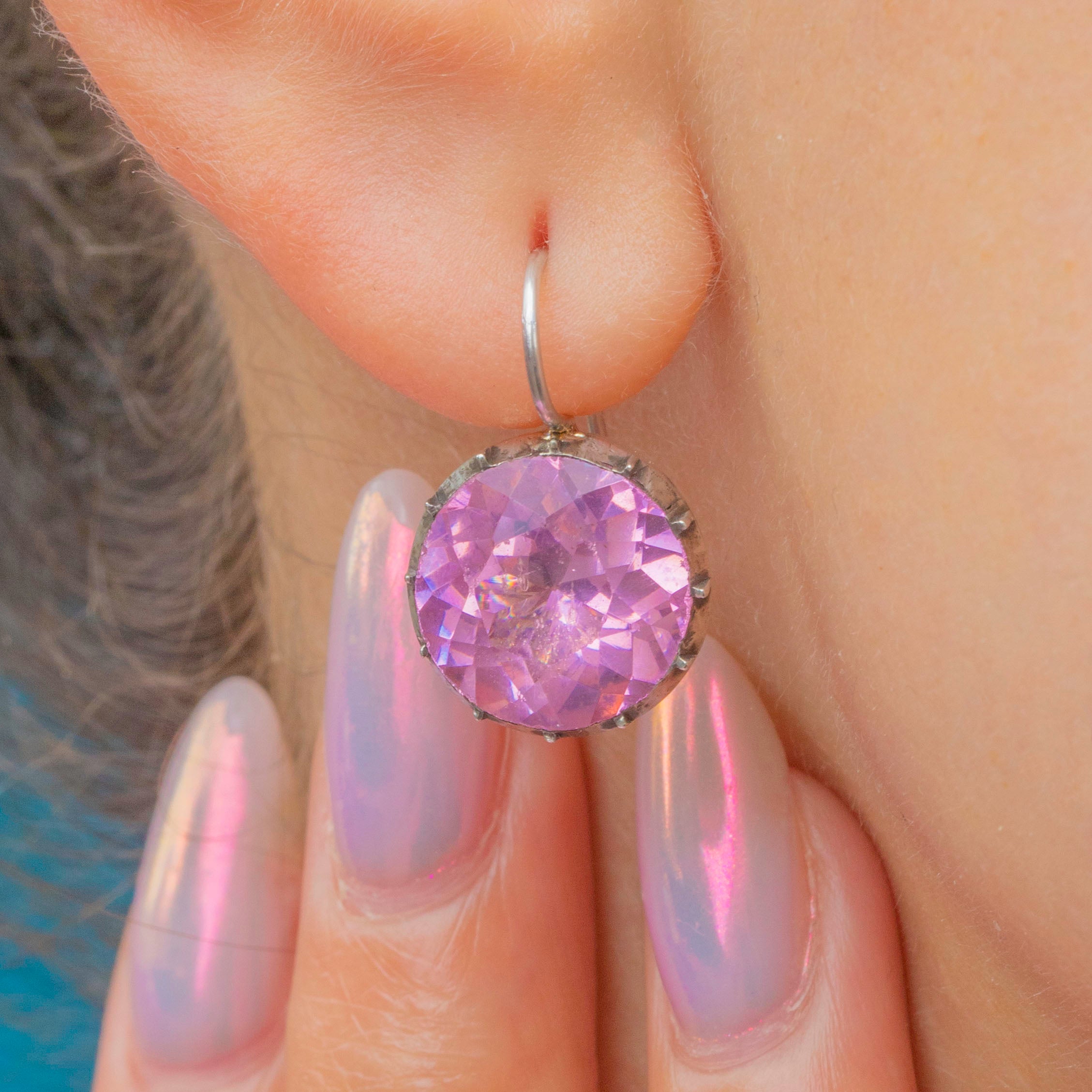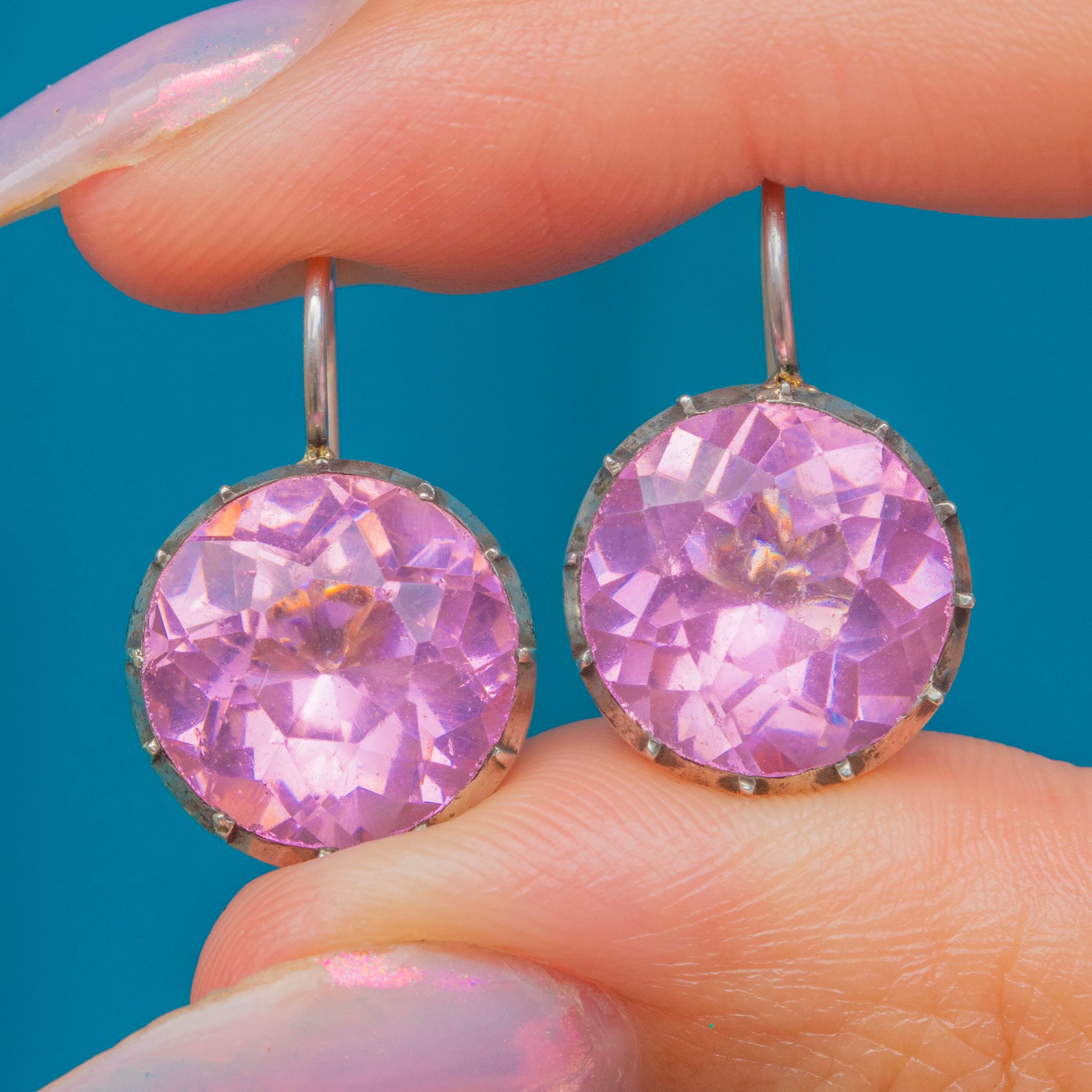 VERY GOOD-EXCELLENT: The pink Paste is radiant, with beautiful facets, and has retained a wonderful saturation. The Silver has built a nice patina over time and though there are some dinks and surface wear to the back of the earrings, this cannot be seen when wearing. With secure hooks, these antique Georgian earrings can be worn with utmost confidence.