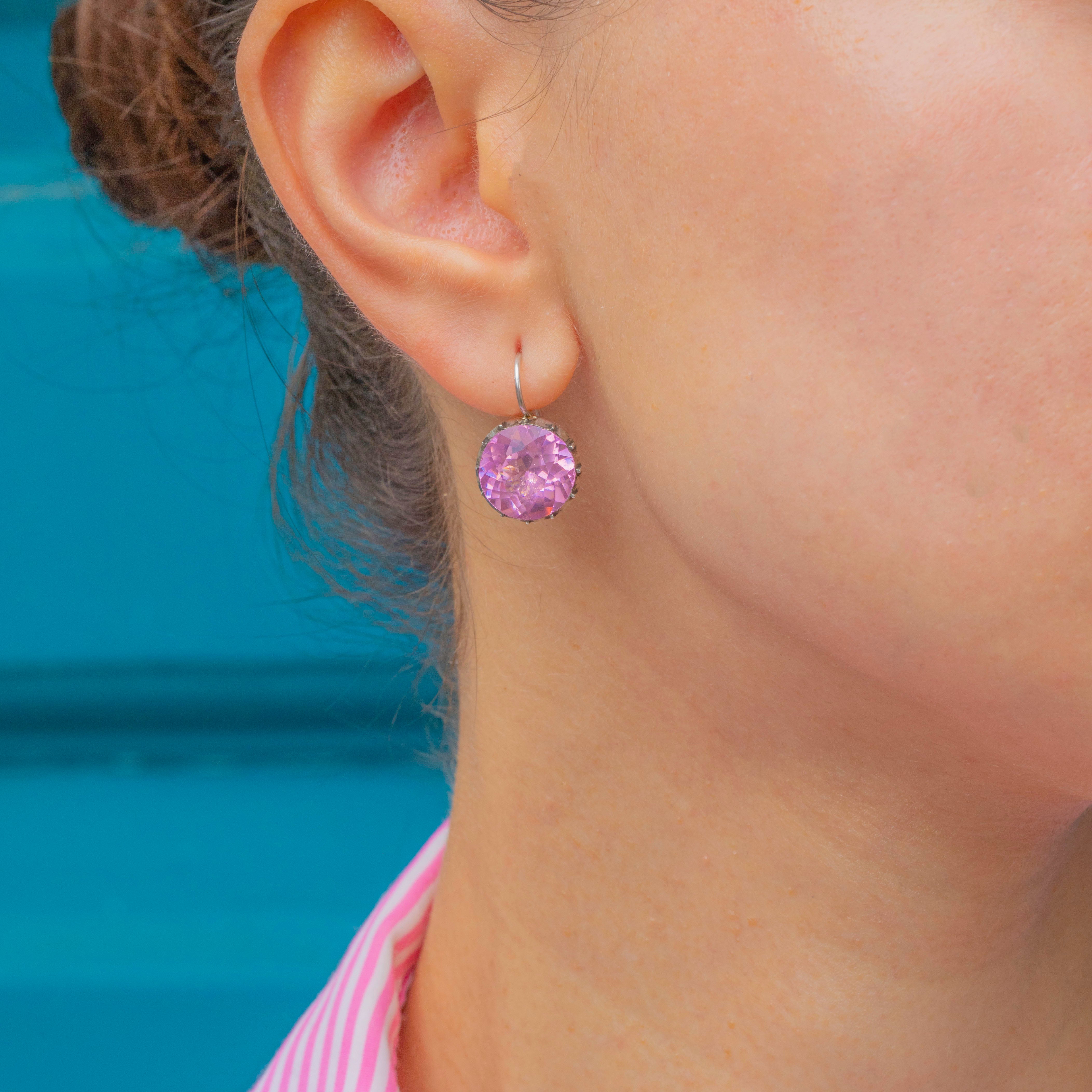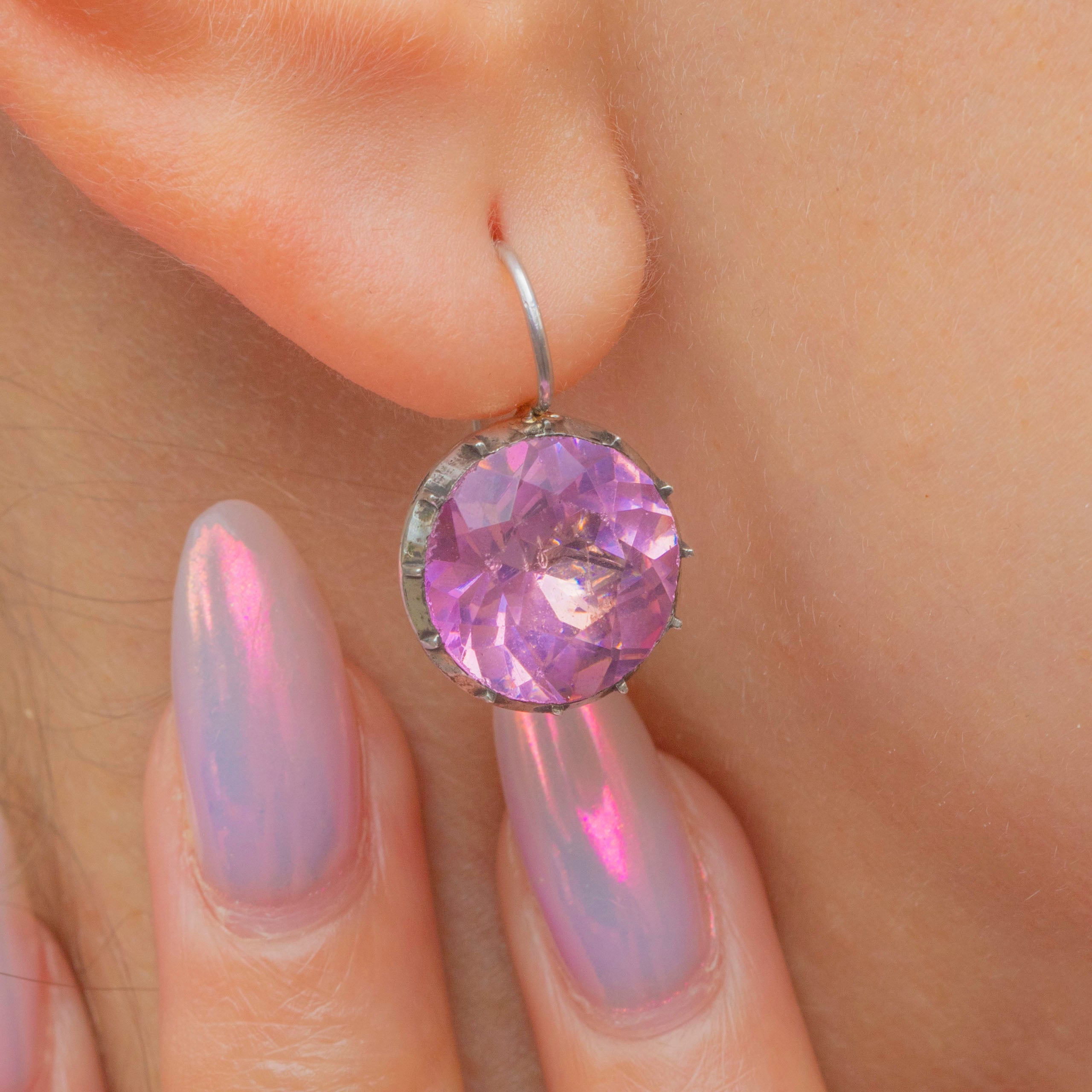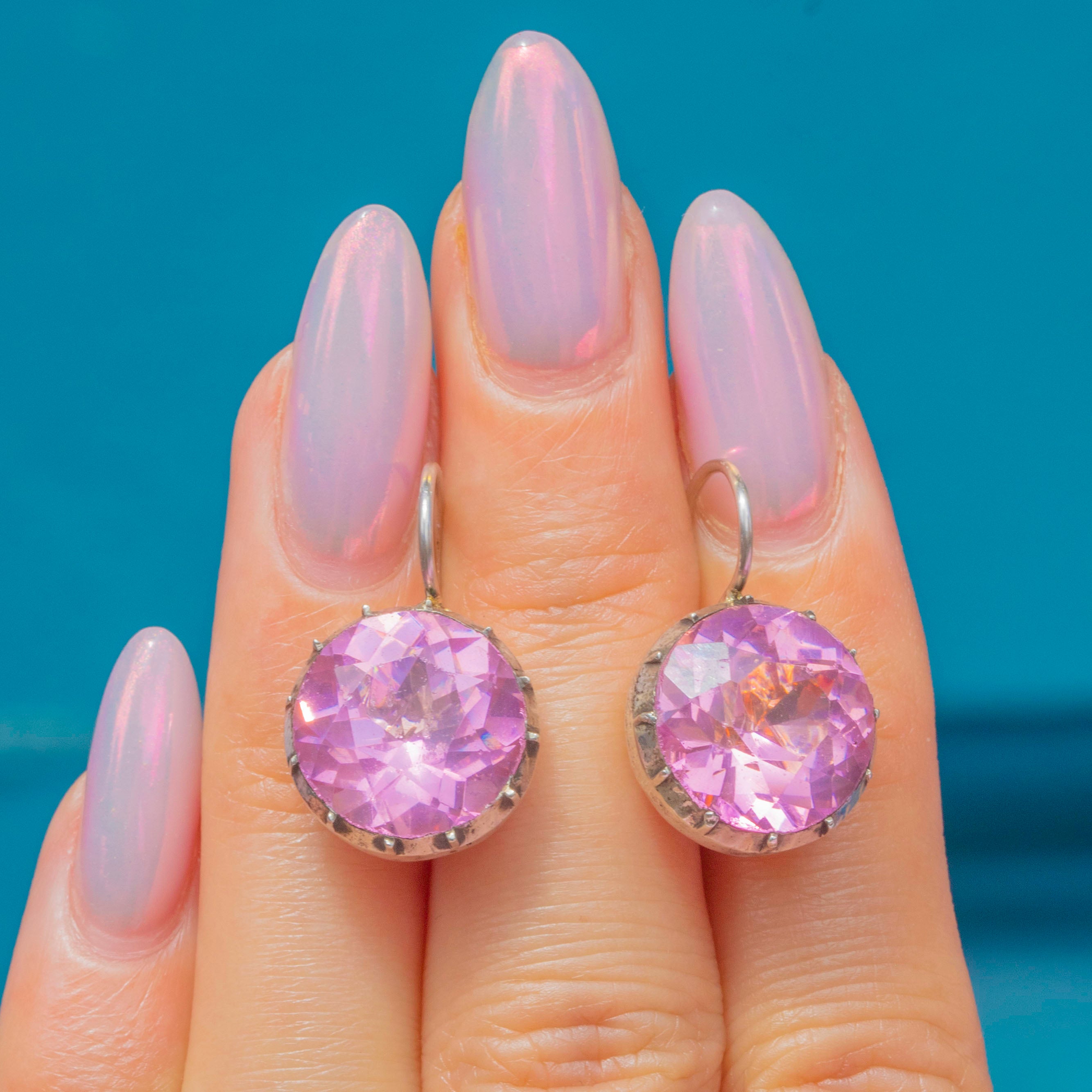 VERY GOOD-EXCELLENT: The pink Paste is radiant, with beautiful facets, and has retained a wonderful saturation. The Silver has built a nice patina over time and though there are some dinks and surface wear to the back of the earrings, this cannot be seen when wearing. With secure hooks, these antique Georgian earrings can be worn with utmost confidence.