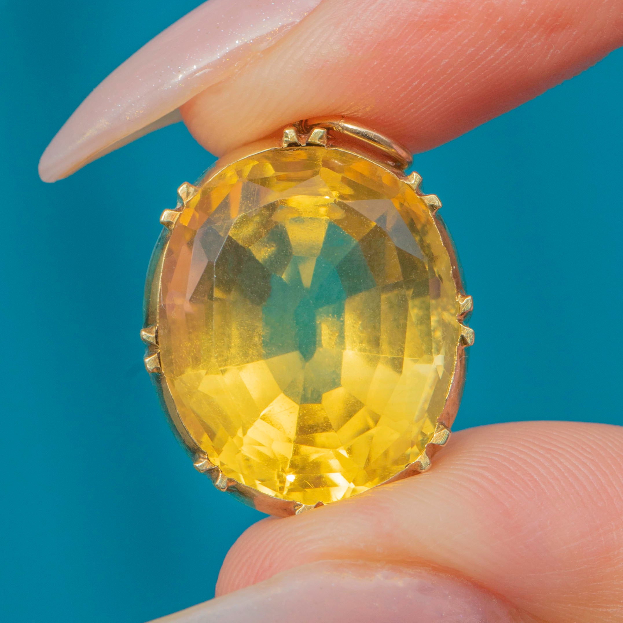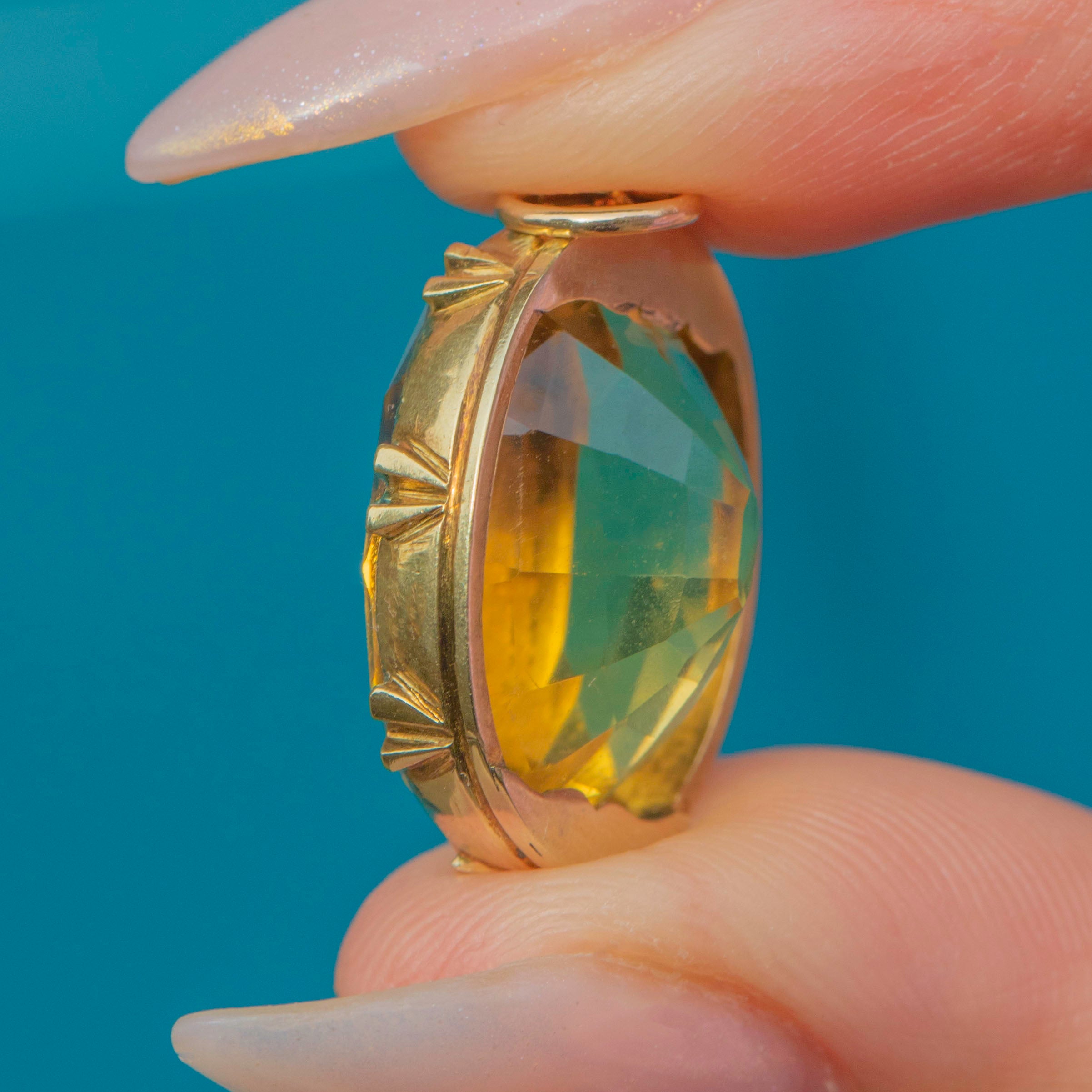 EXCELLENT: The Citrine is bright and clear, with no noticeable chips or abrasions. The facets remain crisp, enhancing the gemstone’s lively brilliance. The Gold setting is strong and secure, with minimal wear, remarkable for its age.