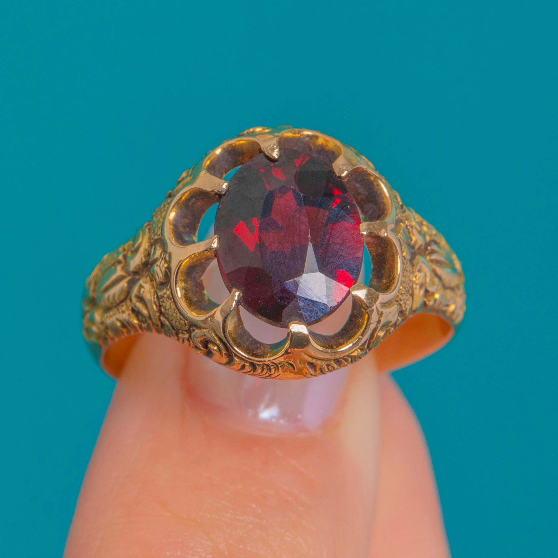 Opulent and romantic, this ornate antique 15ct Gold ring showcases a deep wine-red Garnet lifted high in a scalloped coronet "buttercup" setting. The stone’s rich hue glows beautifully in the open-back setting, while the tall profile creates a striking silhouette on the hand.