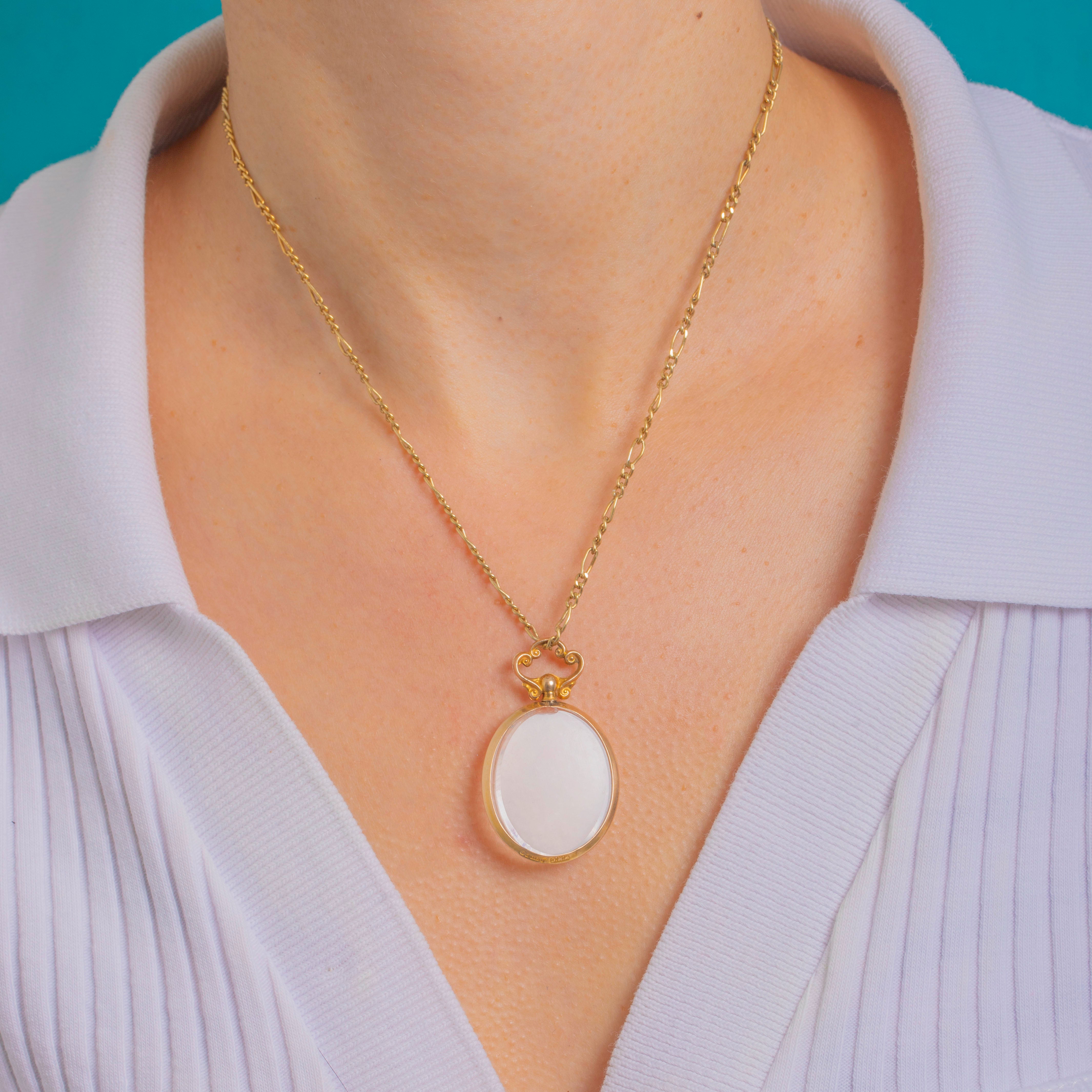 Elegantly minimalist with a flourish of ornament, this antique 9ct Gold oval portrait locket presents twin clear glass windows within a slim polished bezel, crowned by a delicate scrolled surmount. The integrated bail is joined by a neat knuckle, creating a graceful silhouette that feels both classic and refined.