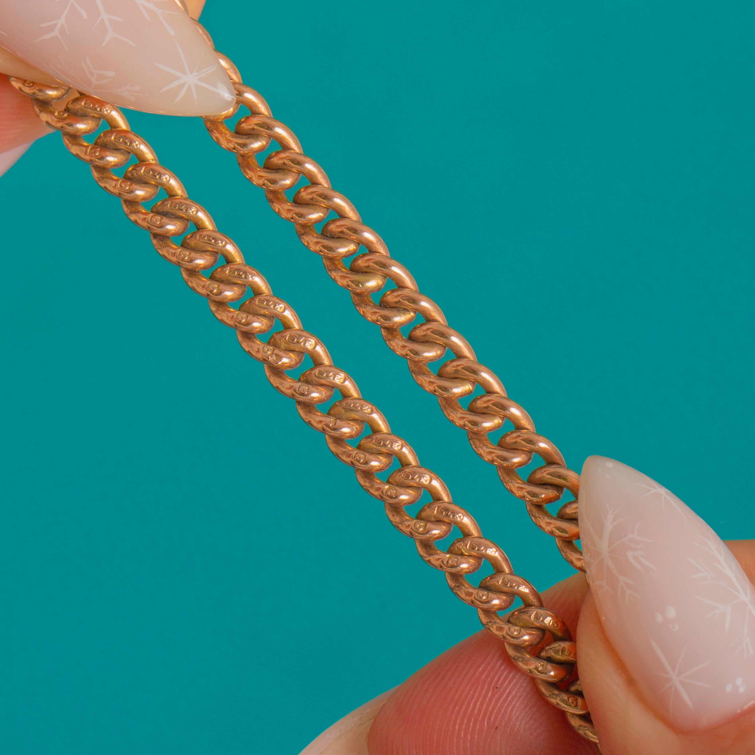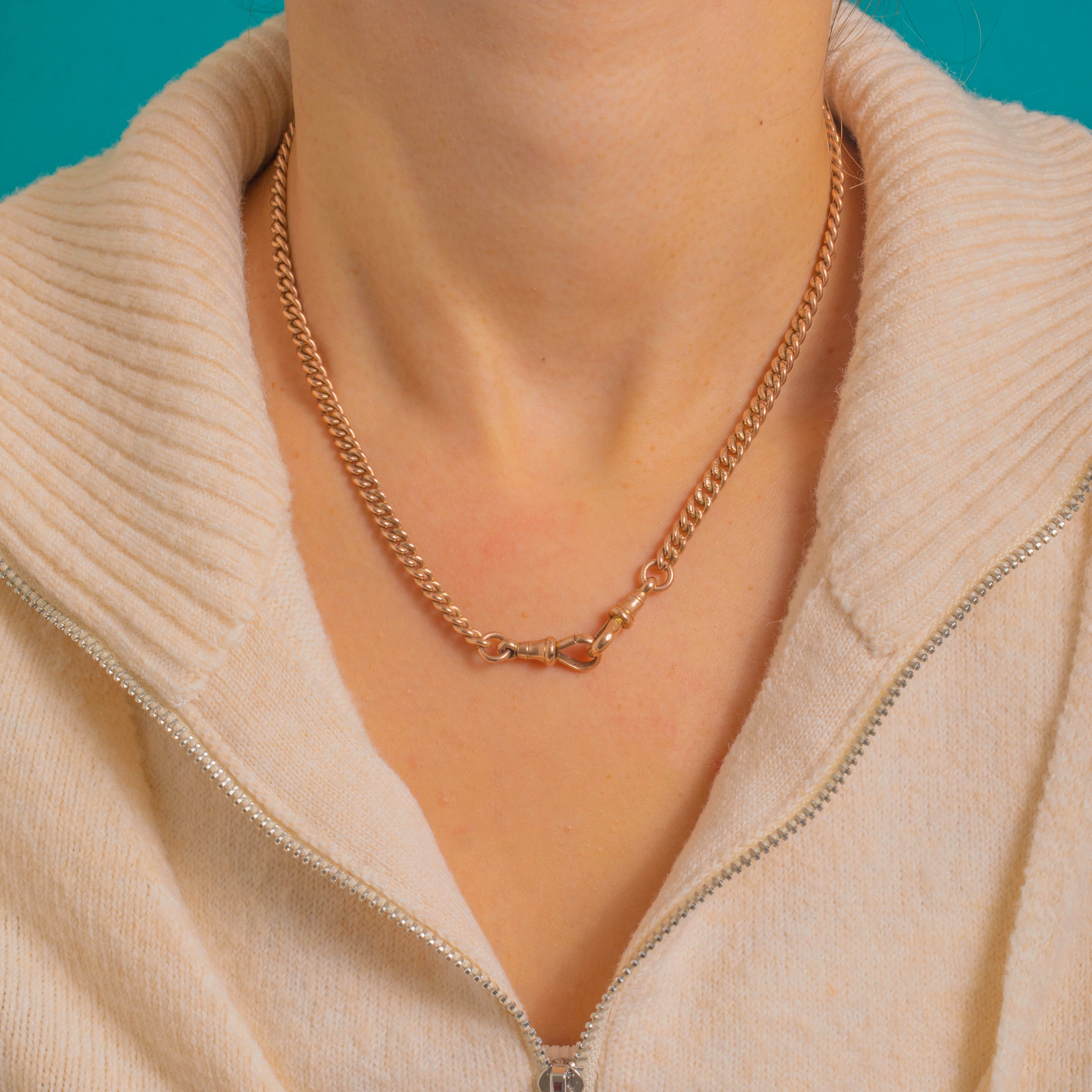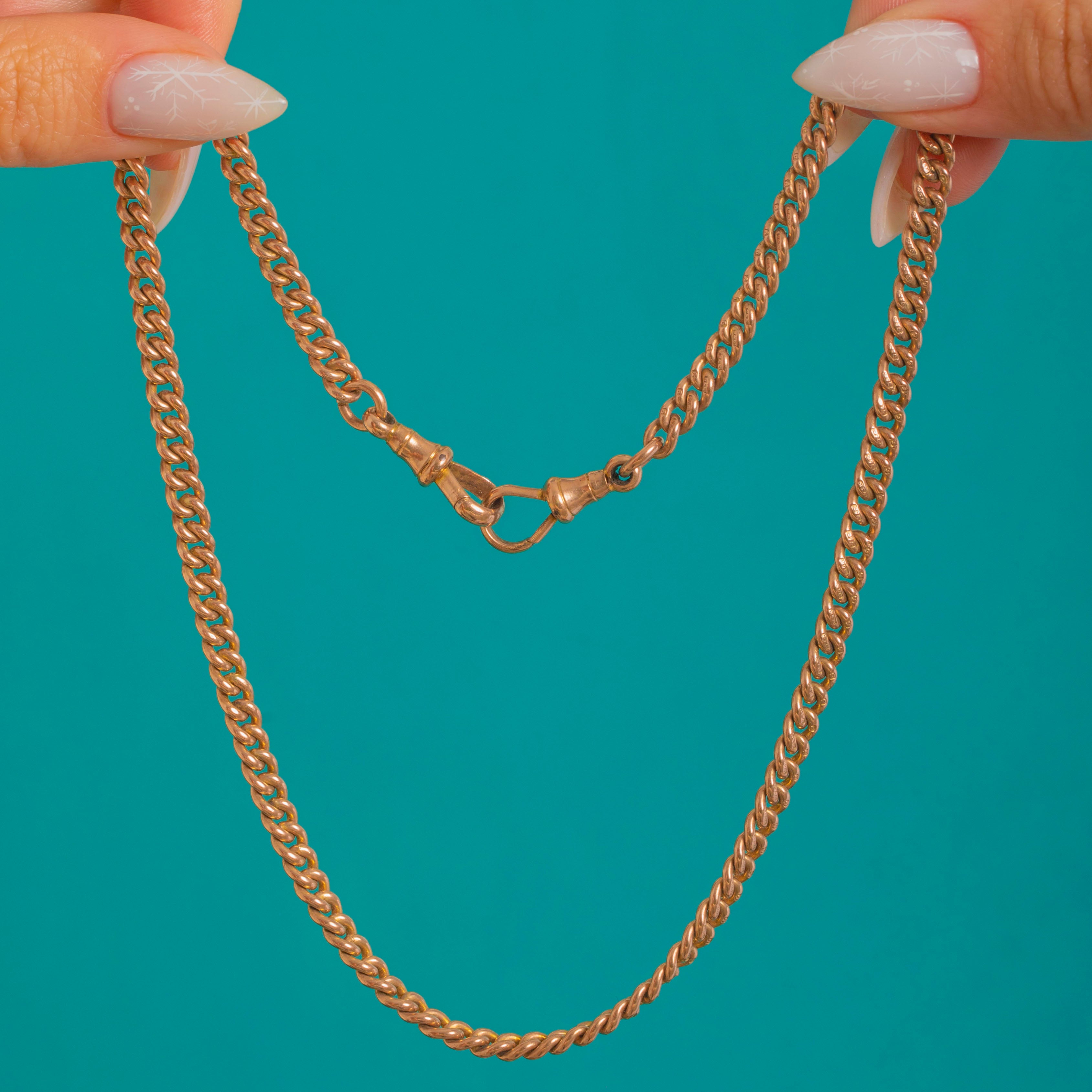 Richly tactile and wonderfully weighty, this Victorian 9ct Gold curb-link chain exudes that coveted antique glow. The uniform close-curb links flow with a smooth drape, finished with tapered ribbed end collars and two large dog-clip clasps for that classic Albert-chain look. The Gold has a warm rosy-yellow hue and a mellow patina that only time can create.