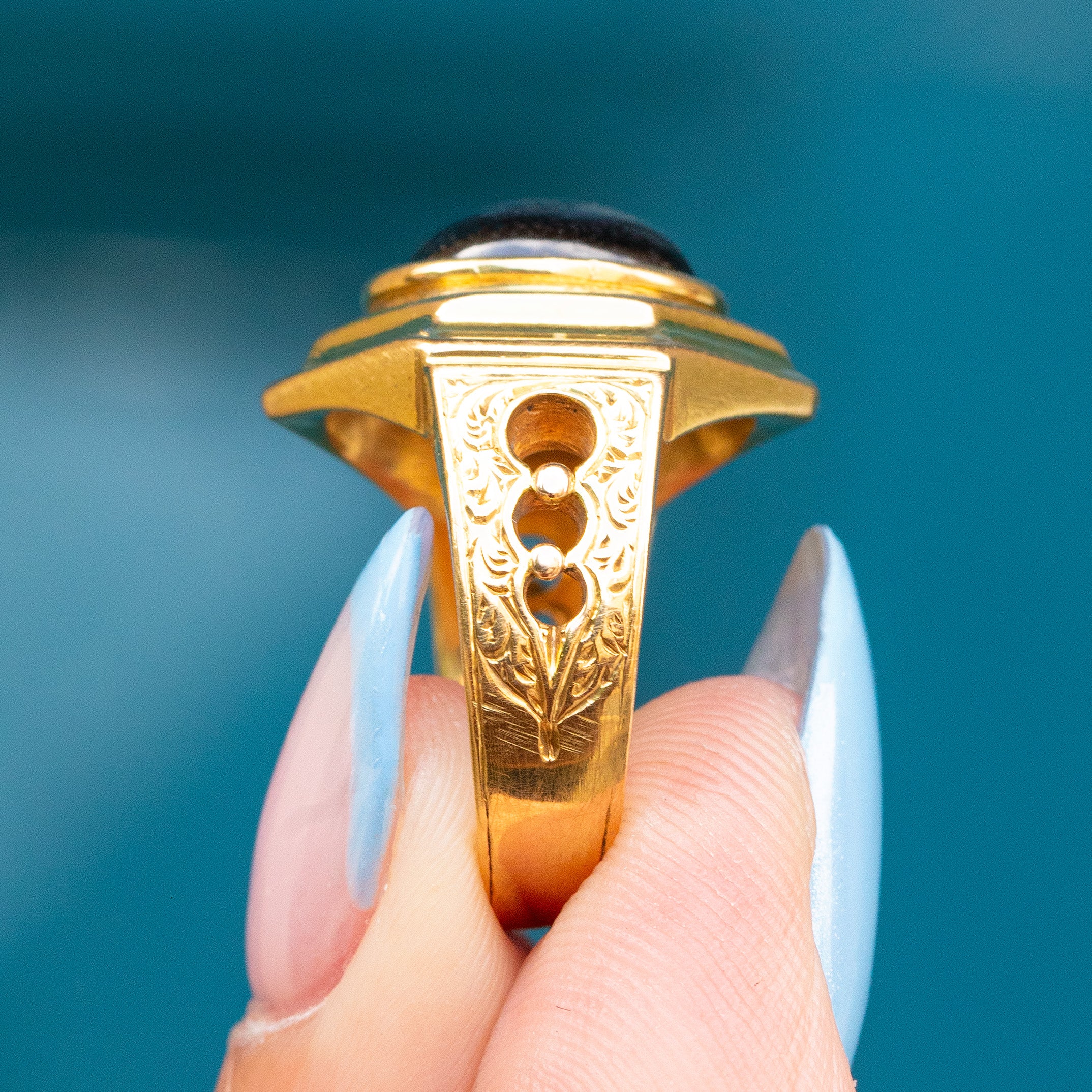 The bold form of the ring combined with the intricately detailed shoulders perfectly capture the unique designs to come from the Victorian era!
