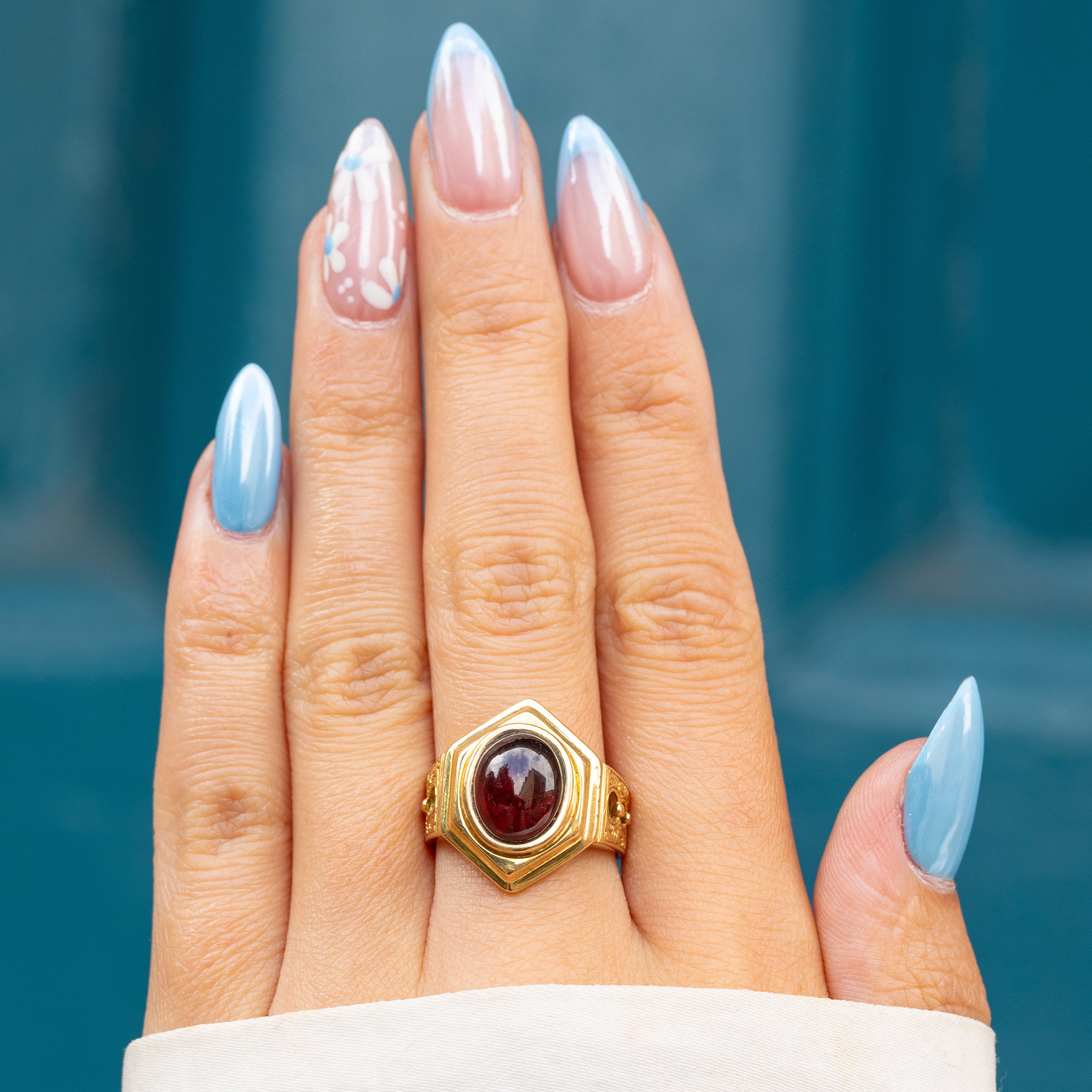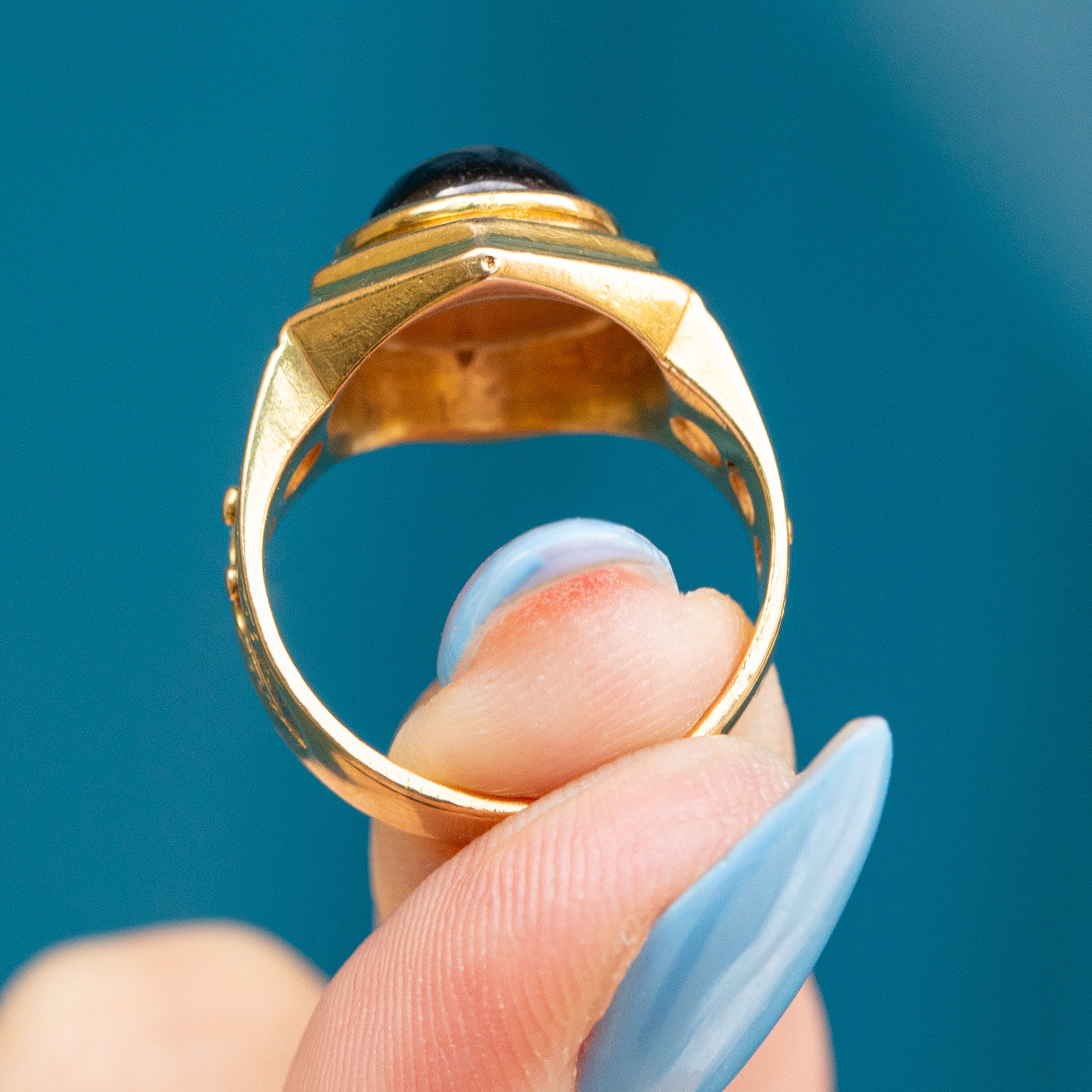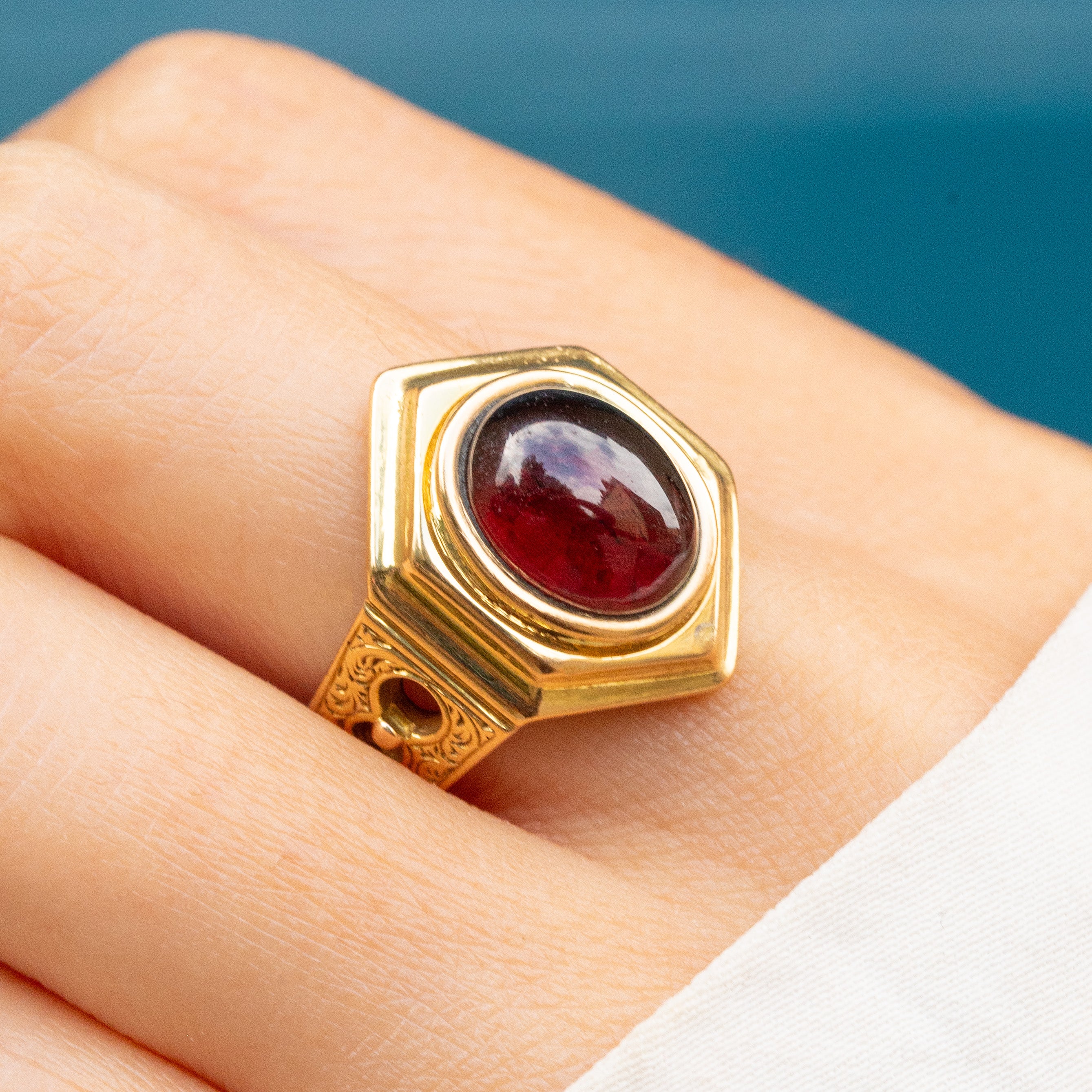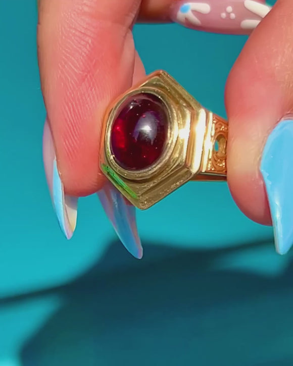 With a full set of English hallmarks dating to 1867, this Victorian Garnet ring is a fine collector's piece! Crafted entirely from solid 18ct Gold, the impressive hexagonal ring face is inlaid with a 2.16ct Garnet cabochon, with a deep crimson hue that will seduce you the moment you lay eyes on her.