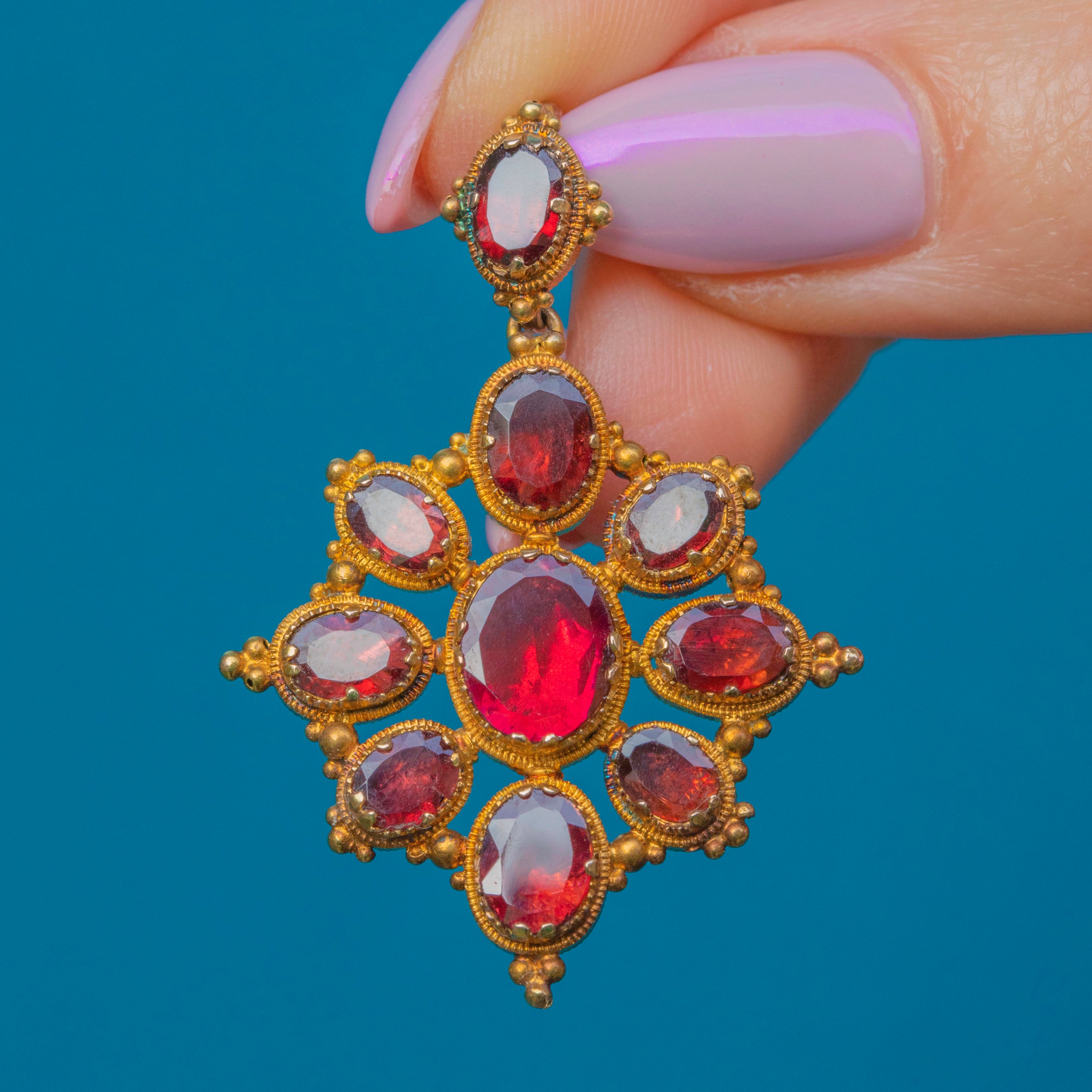 This impeccable Georgian pendant, c.1820, is designed in a striking cruciform cluster set with rich red Garnets. Each stone is framed by fine cannetille and granulation details, demonstrating the skilled craftsmanship of the early 19th century.