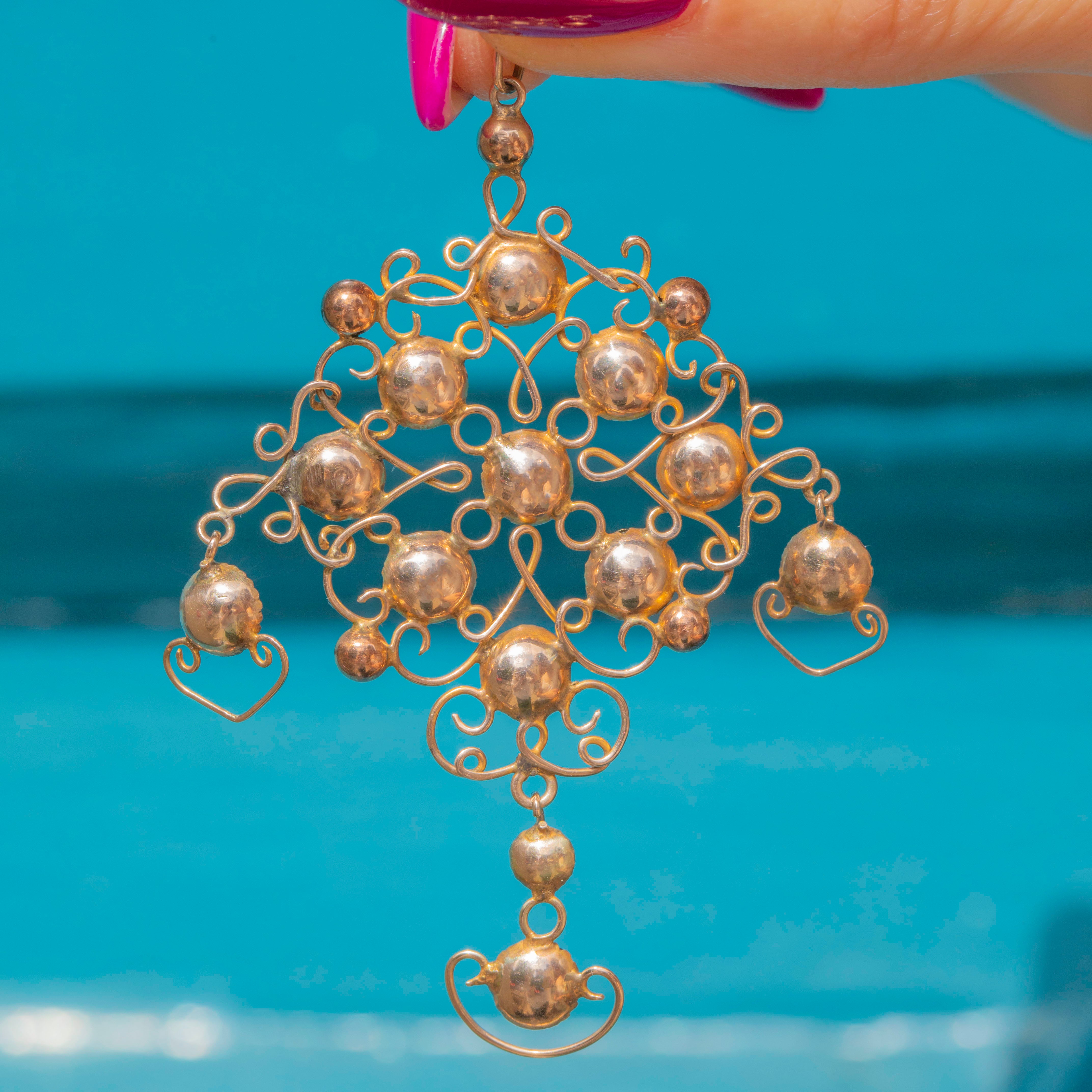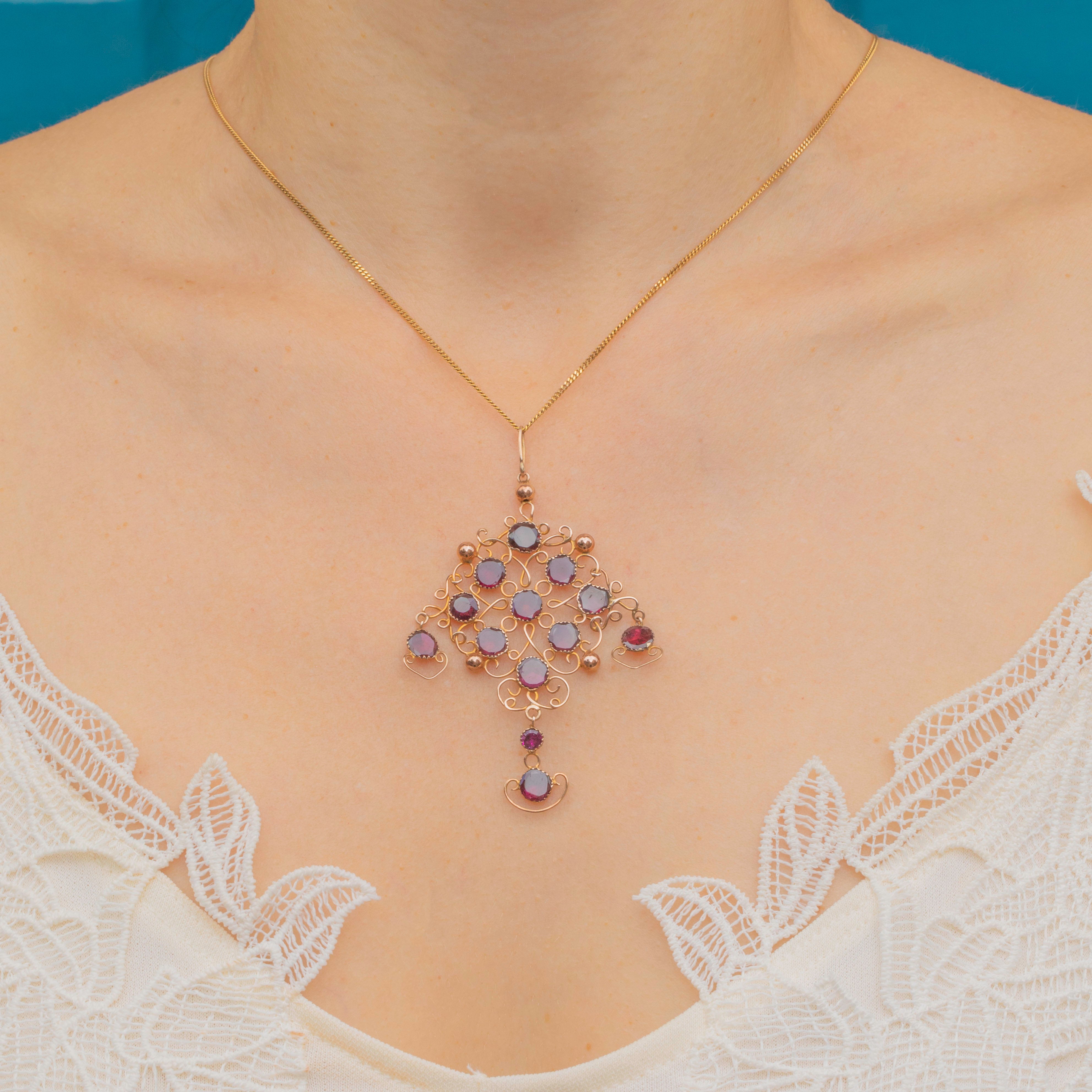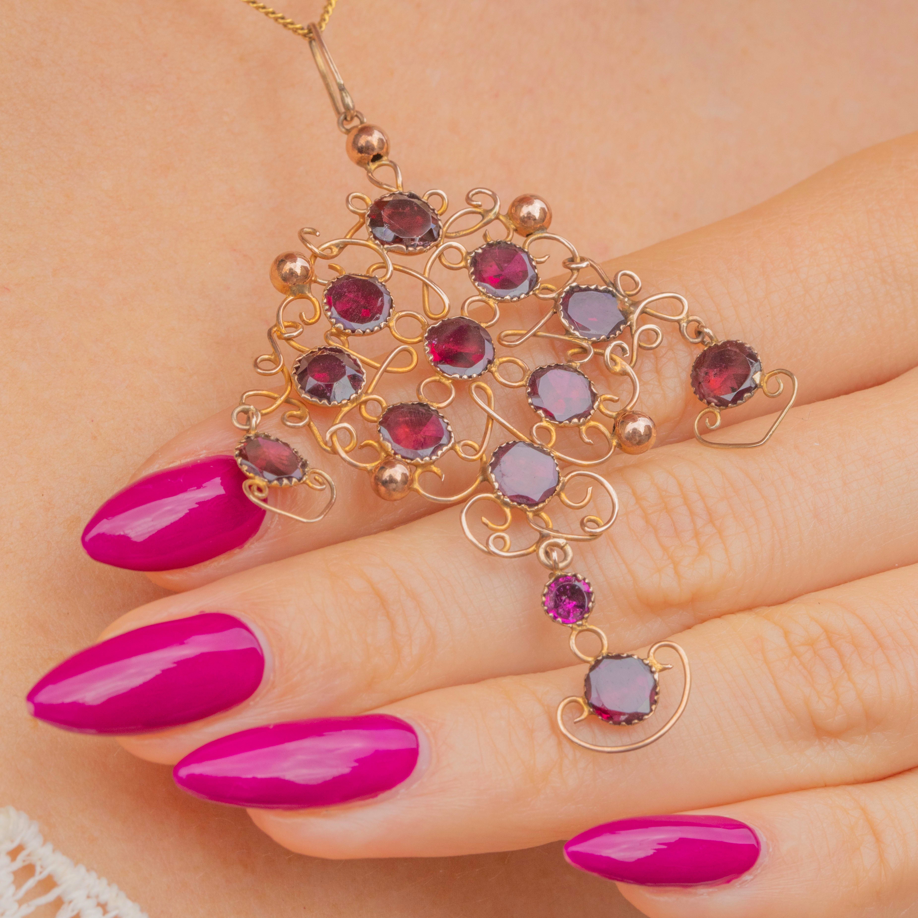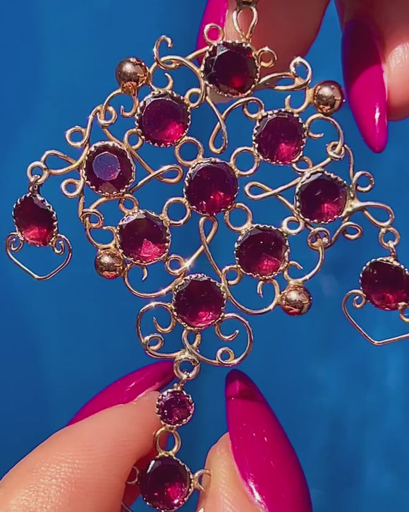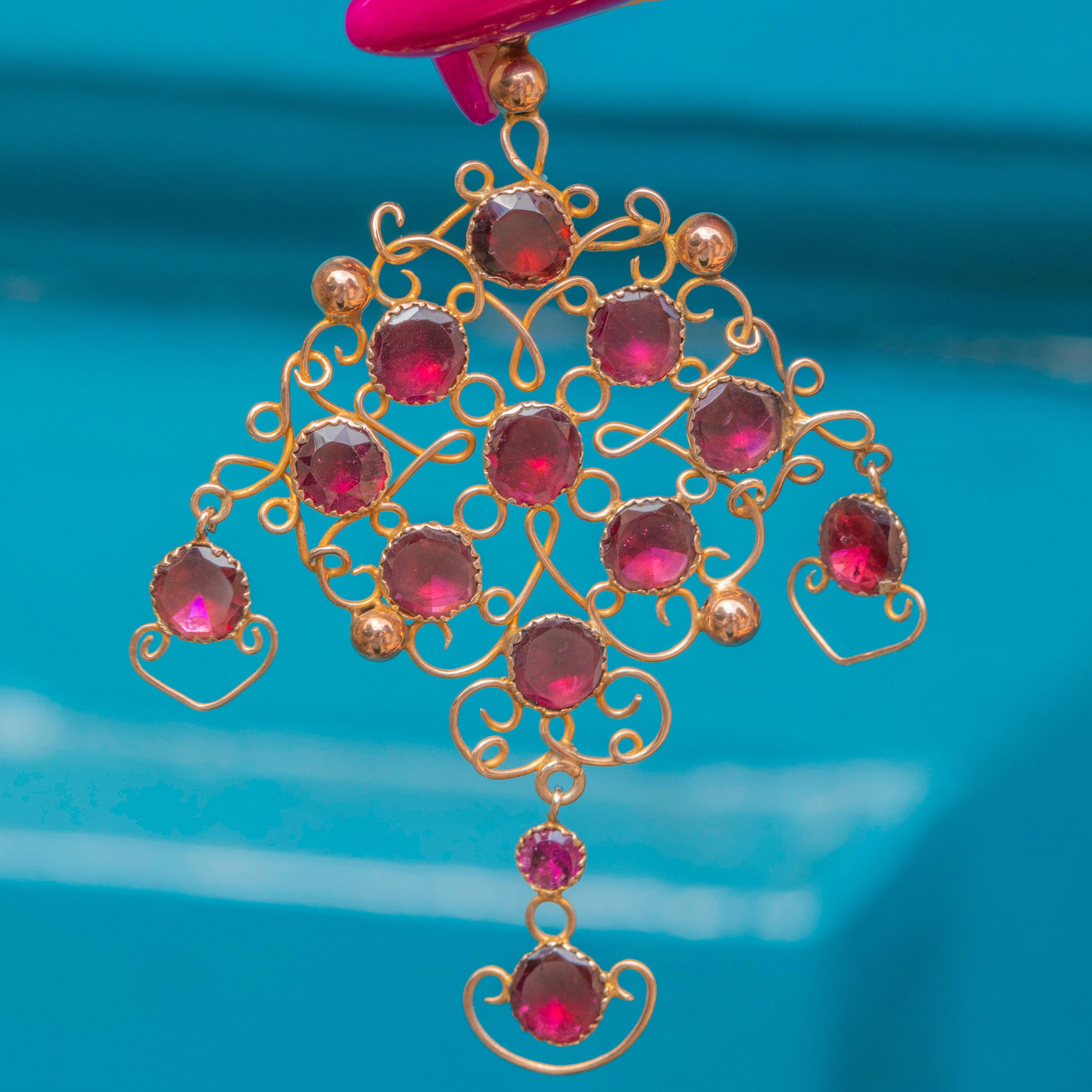 EXCELLENT This exquisite Georgian Queen Anne Garnet Paste pendant is in overall excellent antique condition. The flat-cut Garnets remain in perfect condition, displaying exceptional clarity and colour. The 9ct Gold setting retains its ornate Georgian openwork detailing with minimal signs of age. There is some expected light wear to the Gold on the reverse of the pendant, consistent with age and careful use, but this does not detract from the pendant’s overall integrity or quality.