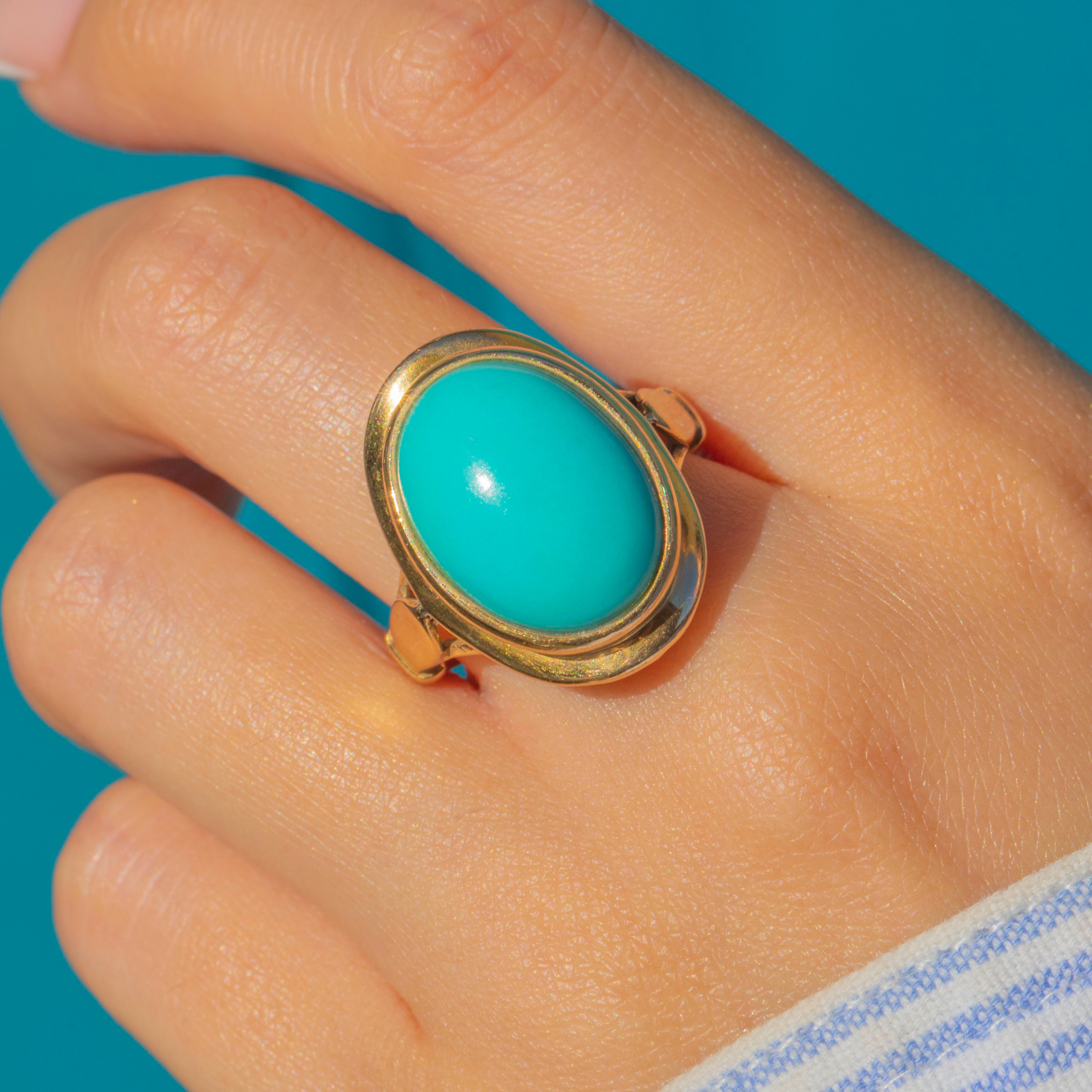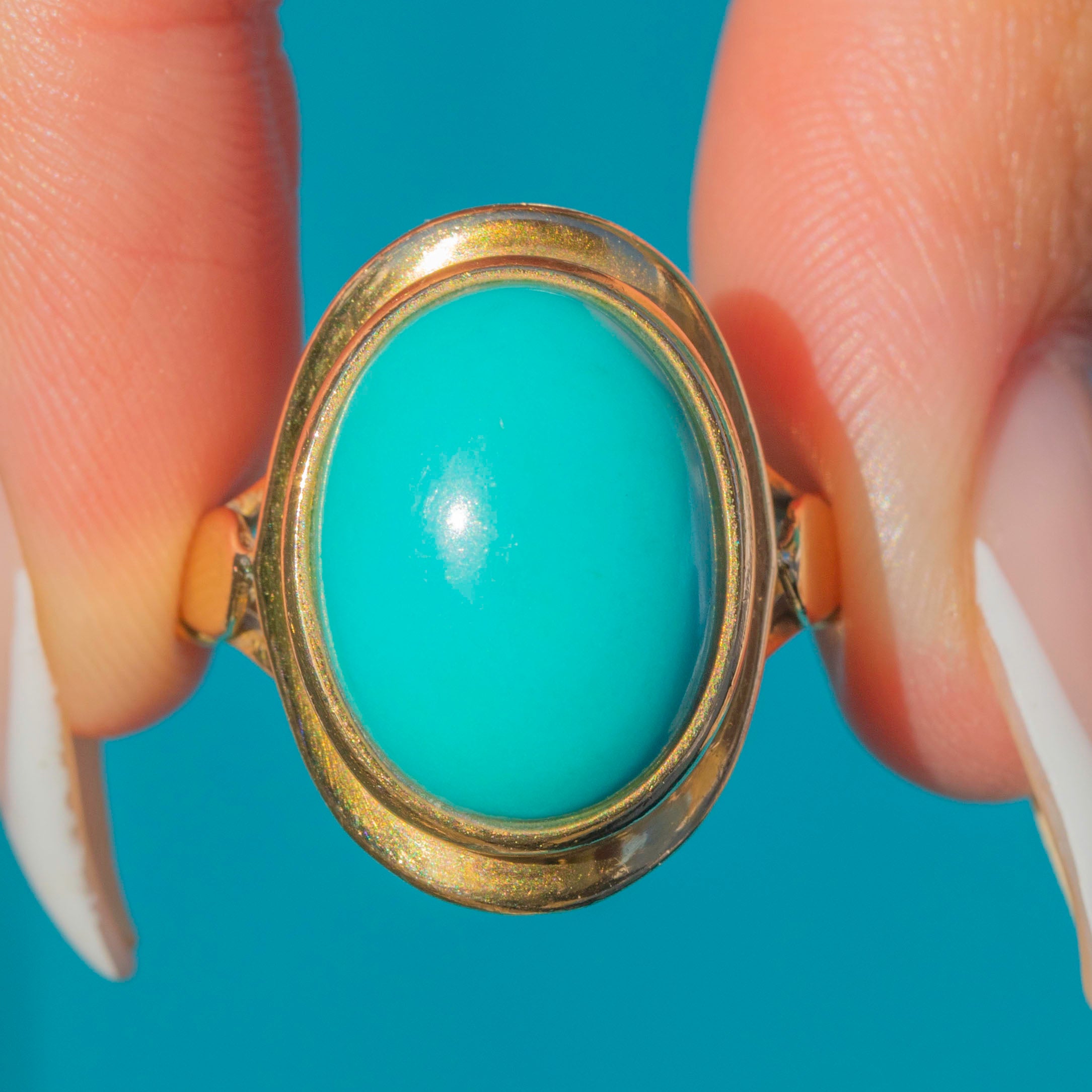 This impressive Mid-Century Vintage ring showcases a vivid Persian Turquoise cabochon in a striking 18ct Gold setting. The large oval stone, with its smooth polish and saturated sky-blue tone, takes centre stage in this bold yet elegant design.
