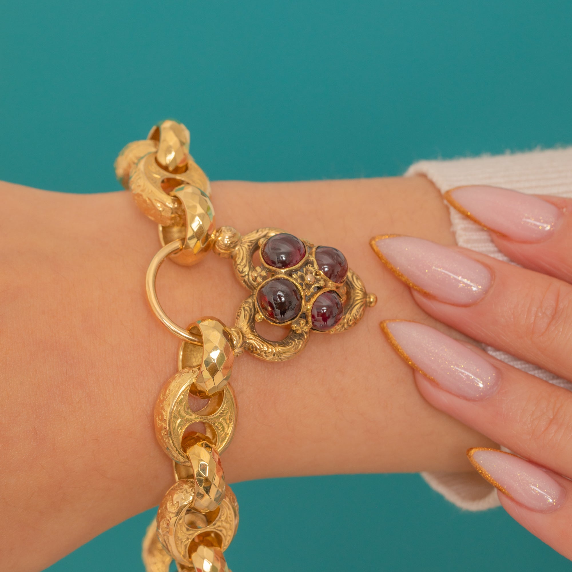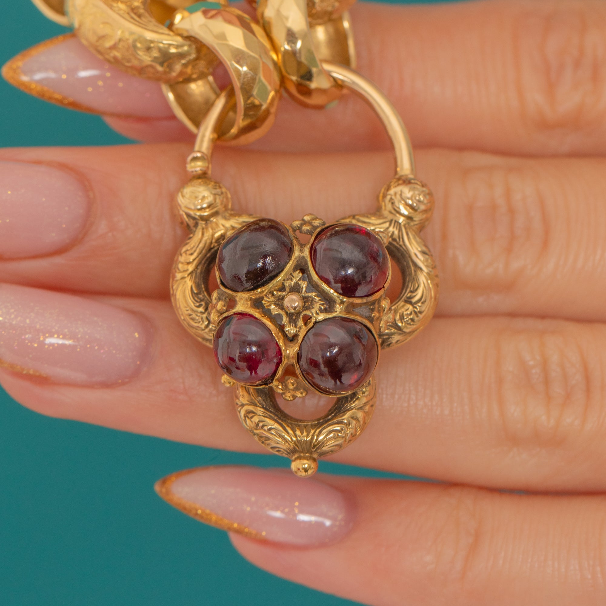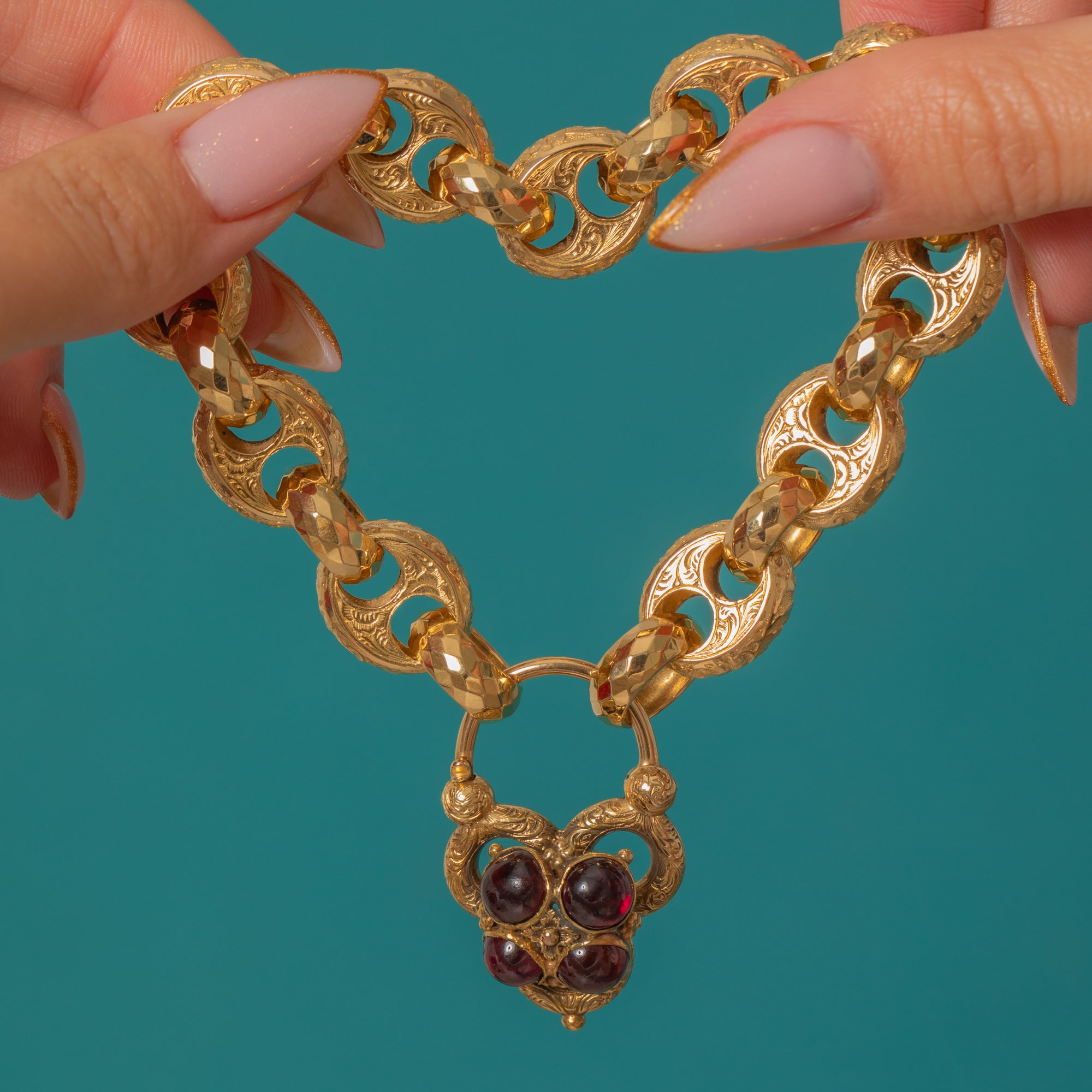 The padlock is richly engraved and set with glossy Garnet cabochons, all in beautiful condition. With engraved & faceted links that catch the light, this luxurious 18ct Gold statement piece embodies the opulence and romance of the Victorian era.