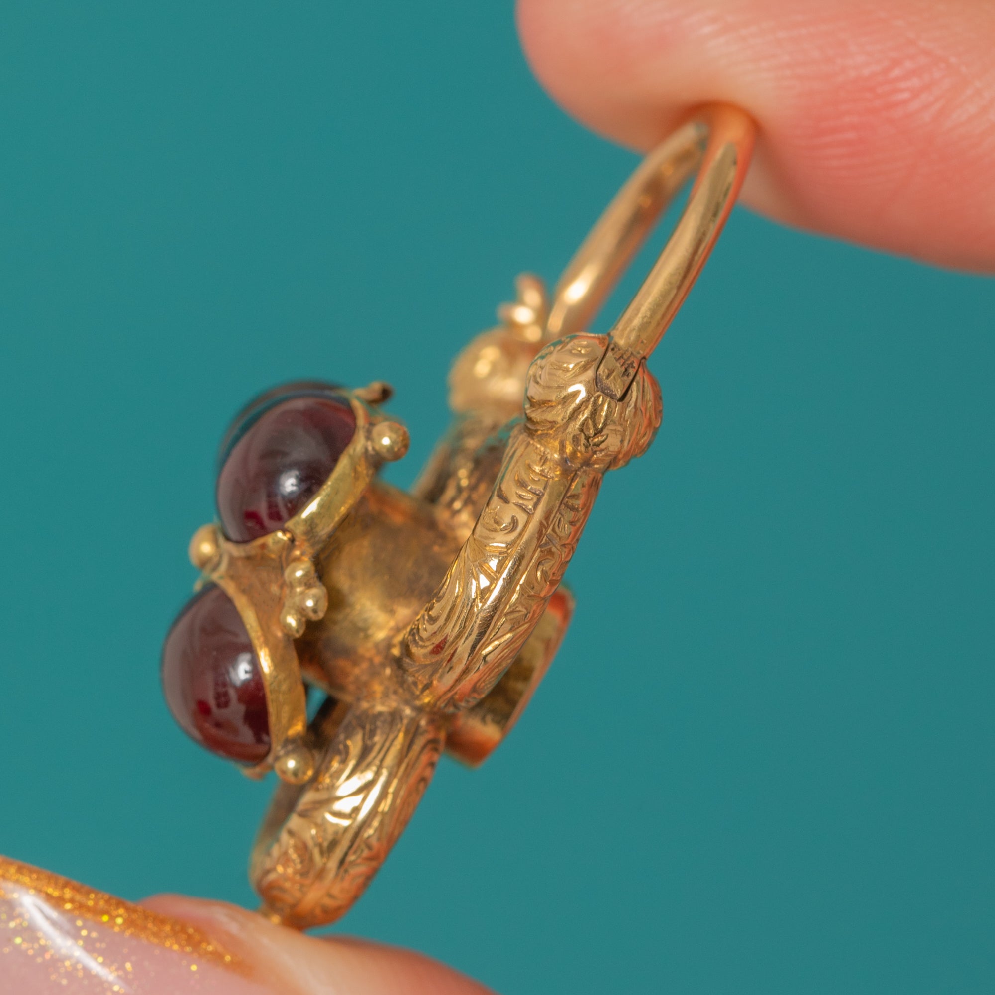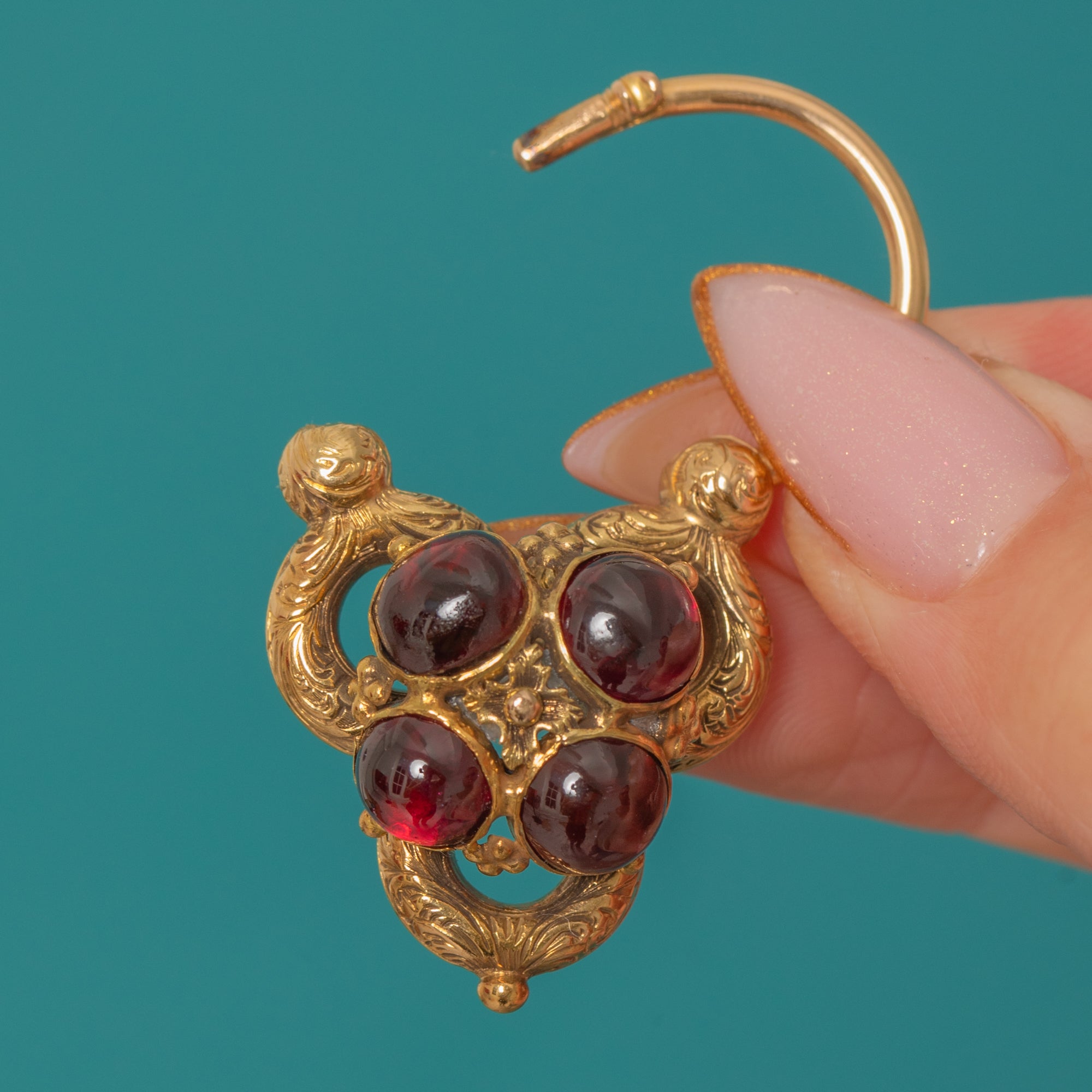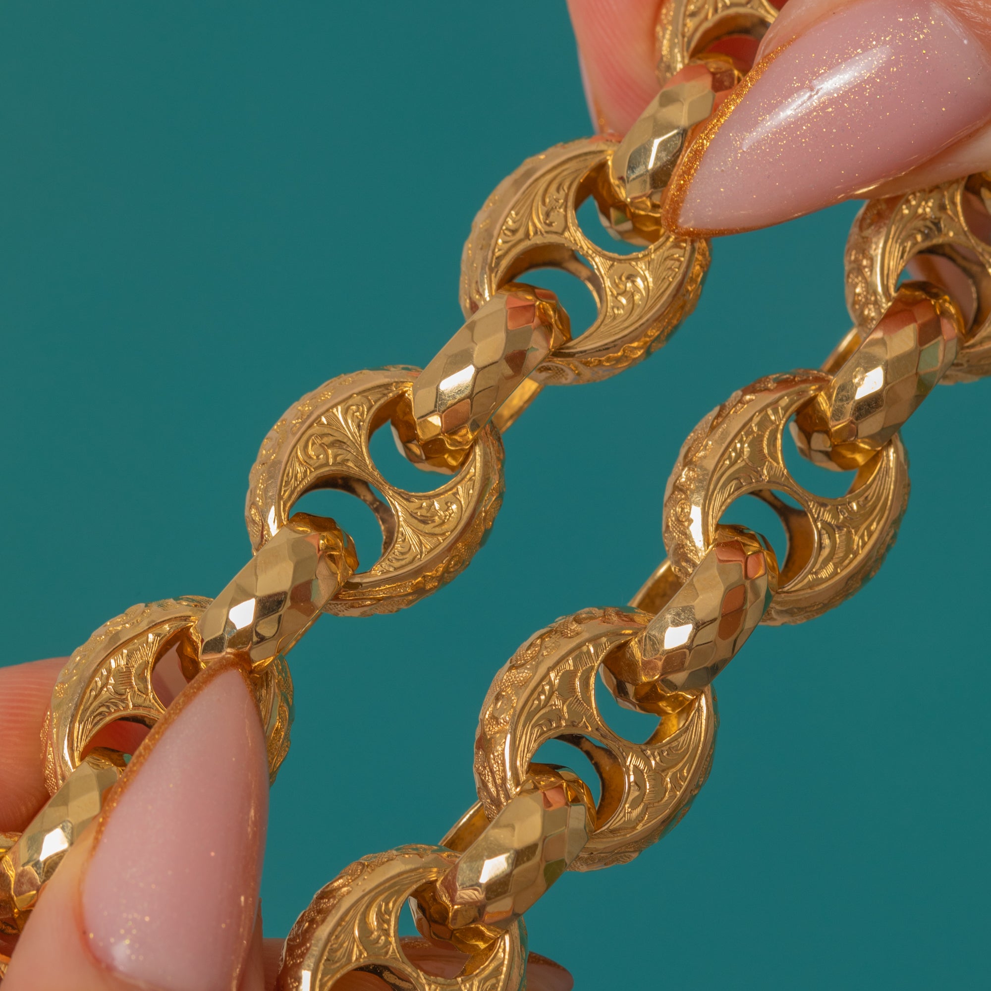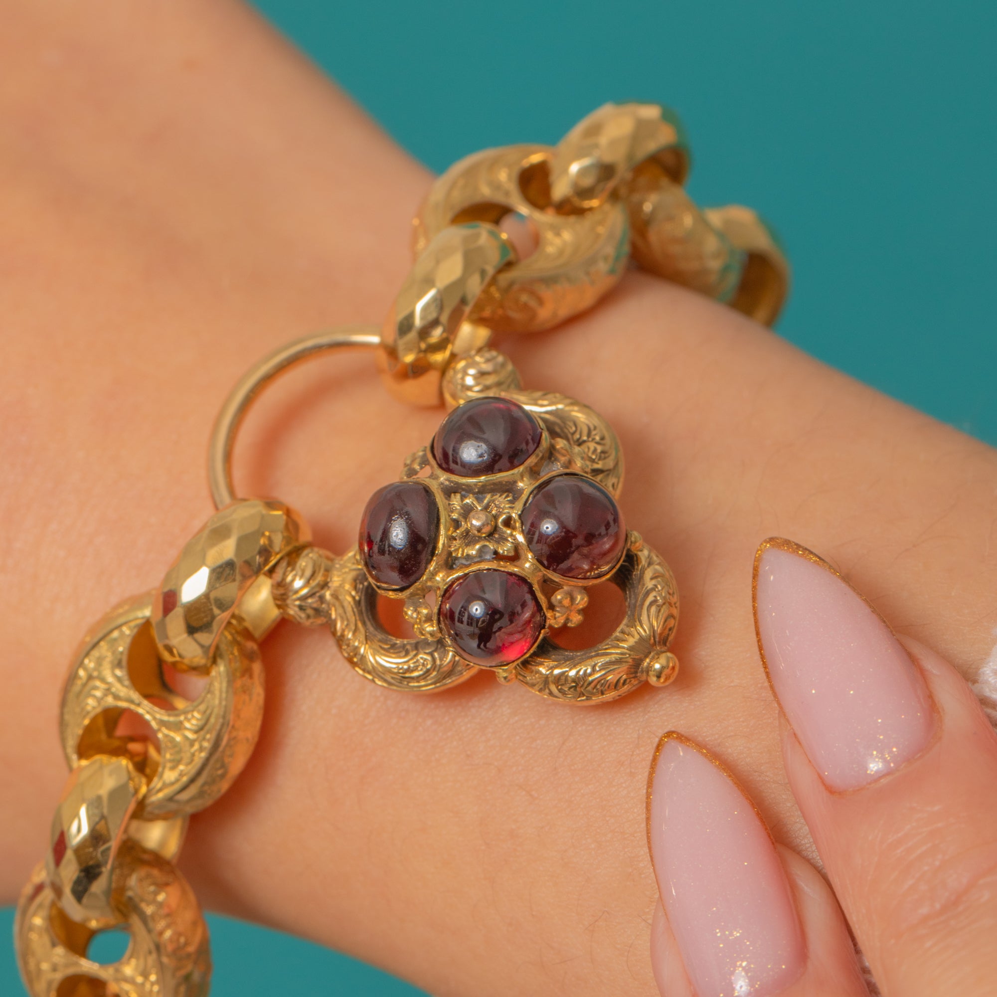 The padlock is richly engraved and set with glossy Garnet cabochons, all in beautiful condition. With engraved & faceted links that catch the light, this luxurious 18ct Gold statement piece embodies the opulence and romance of the Victorian era.