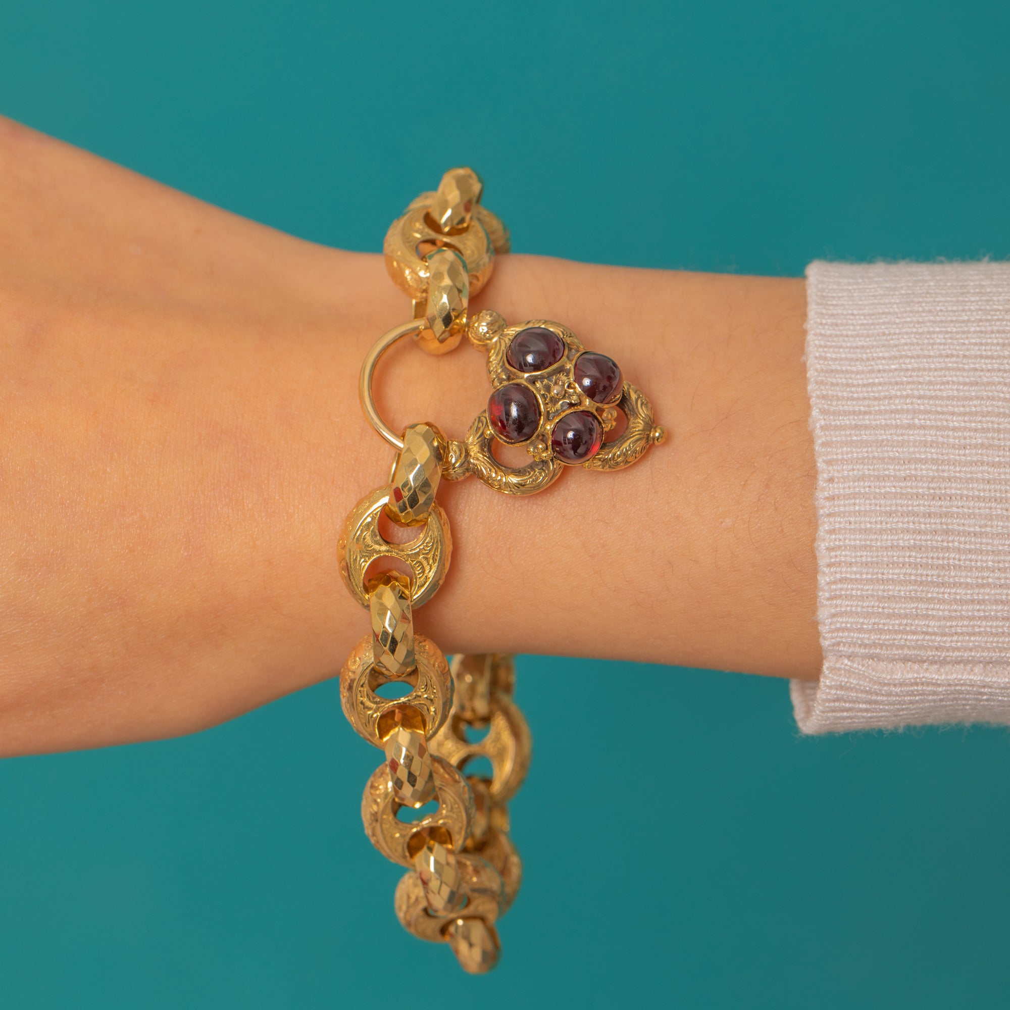 INCREDIBLE Victorian 18ct Gold Bracelet with Garnet Cabochon Heart Padlock c.1870