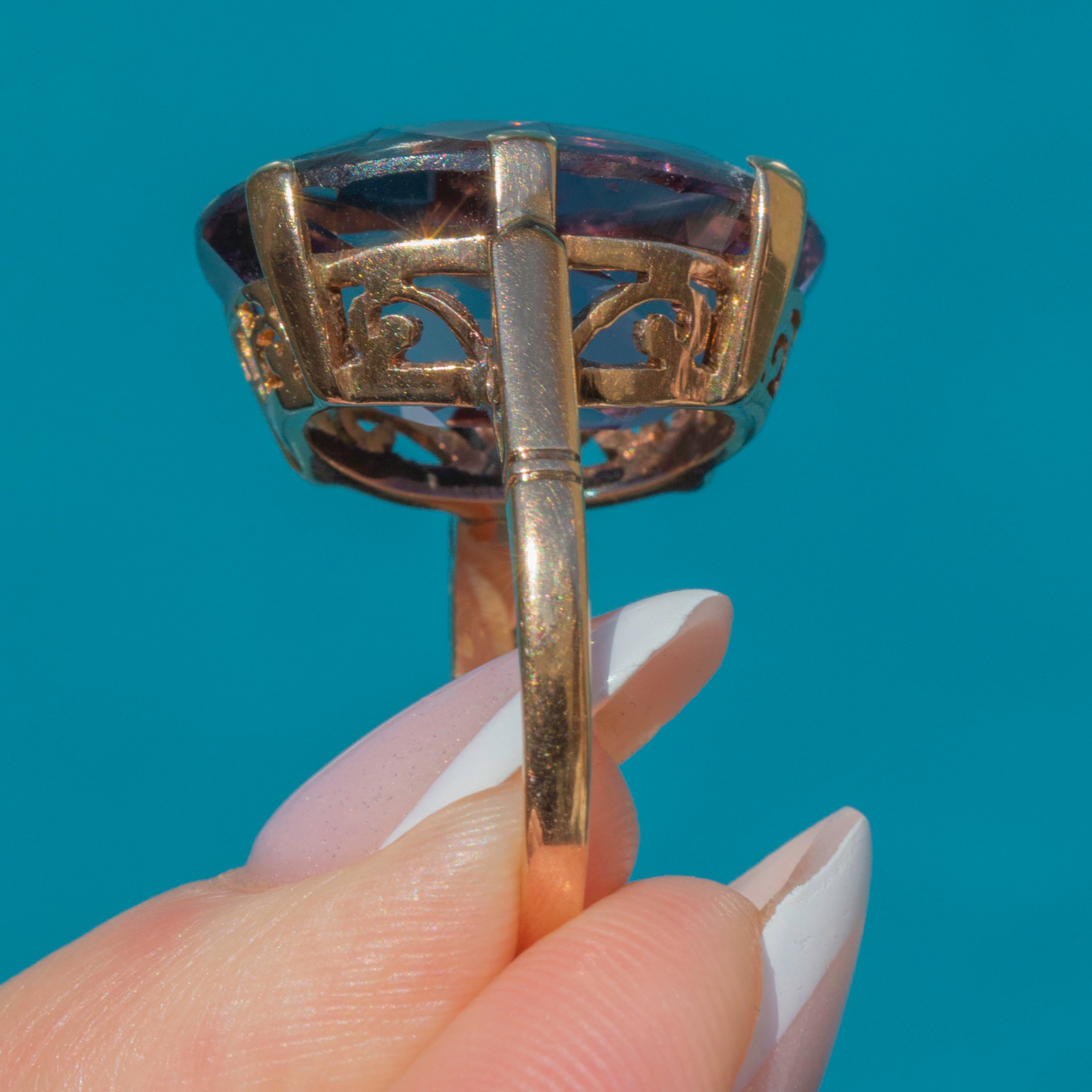 VERY GOOD. This large 18ct Gold Art Deco Amethyst cocktail ring is in very good condition! The ring has a robust band to support the stone and ornate settings, that have remained in wonderful condition. On one end of the Amethyst, there is an ever-so-slight scuff, but this is only noticeable up close. The ring has been previously resized but this has been executed beautifully and is only visible under very close inspection.