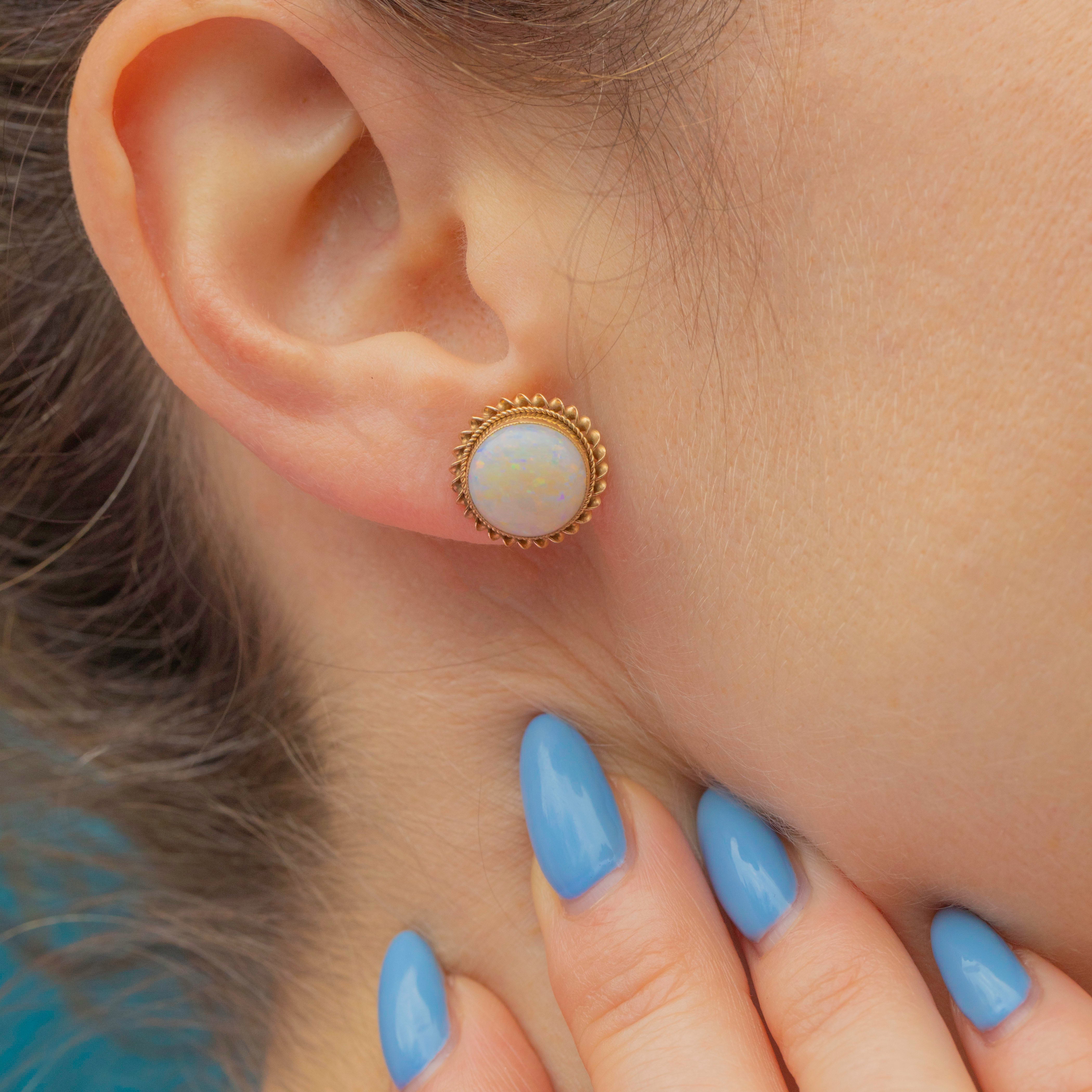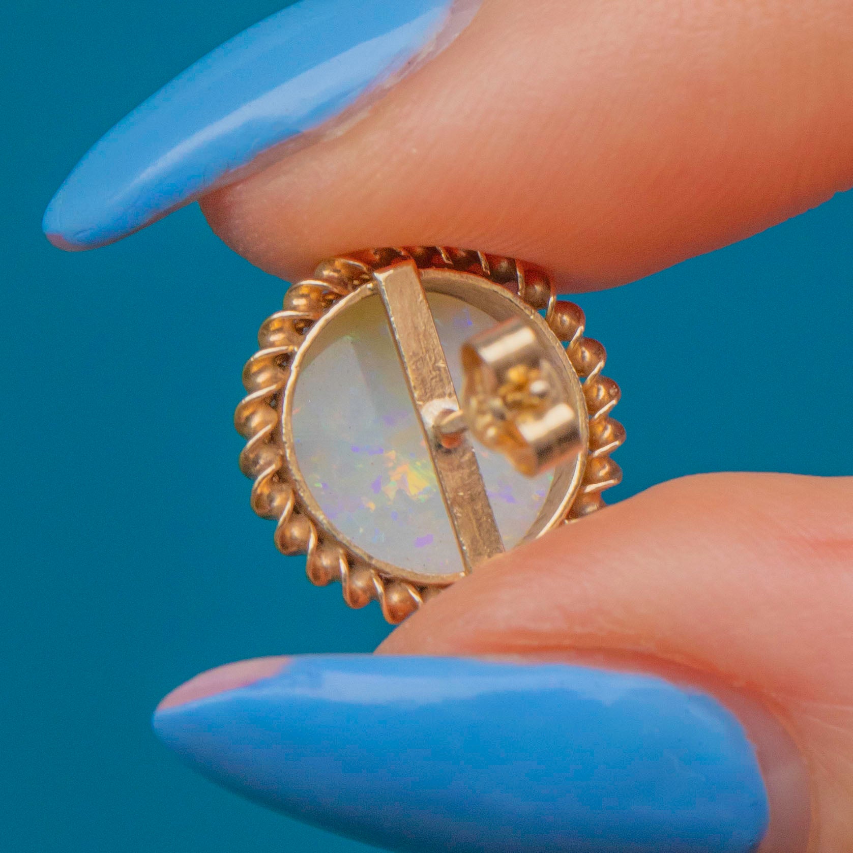 A striking pair of large 9ct Gold Opal stud earrings to add to your collection! Each stud earring homes a magical natural solid Opal cabochon set in a trusted 9ct Gold bezel. Framed by a rope border and a decorative scallop edge, these 4.90ct Opal earrings are as pretty as a picture!